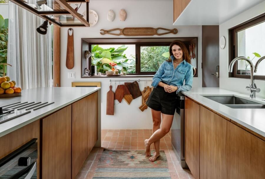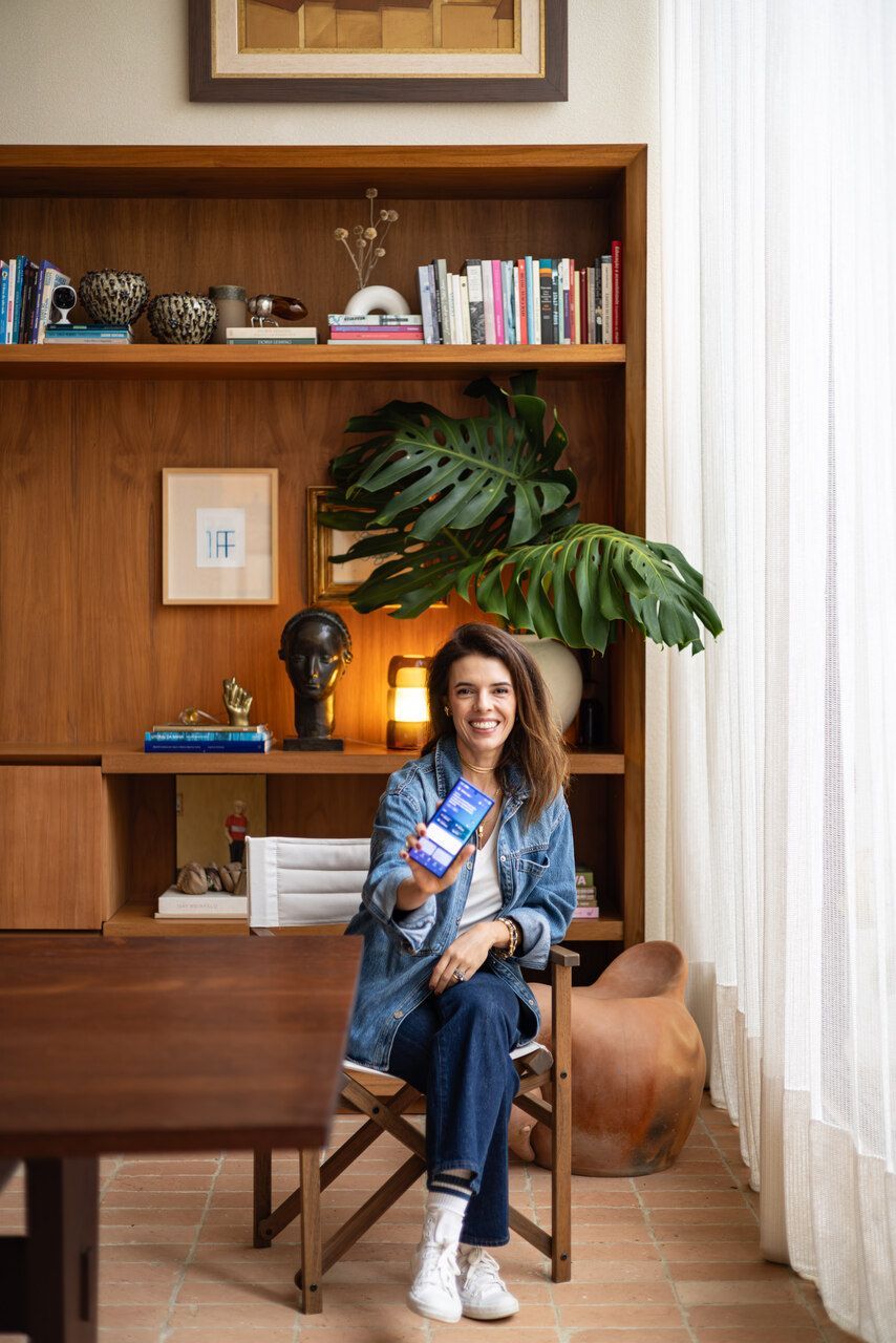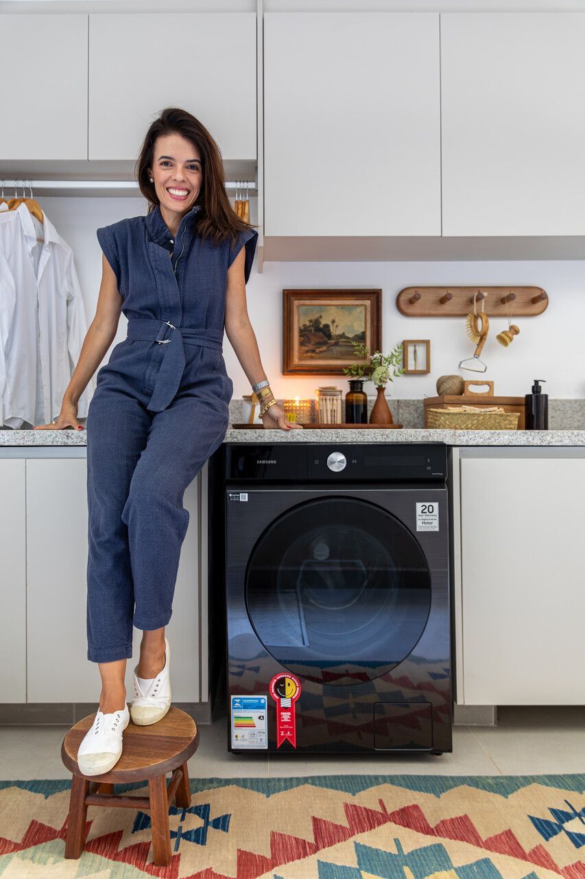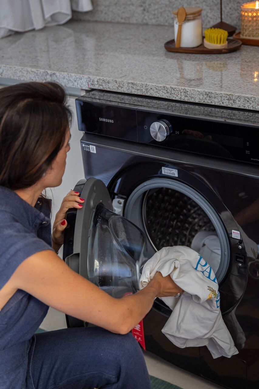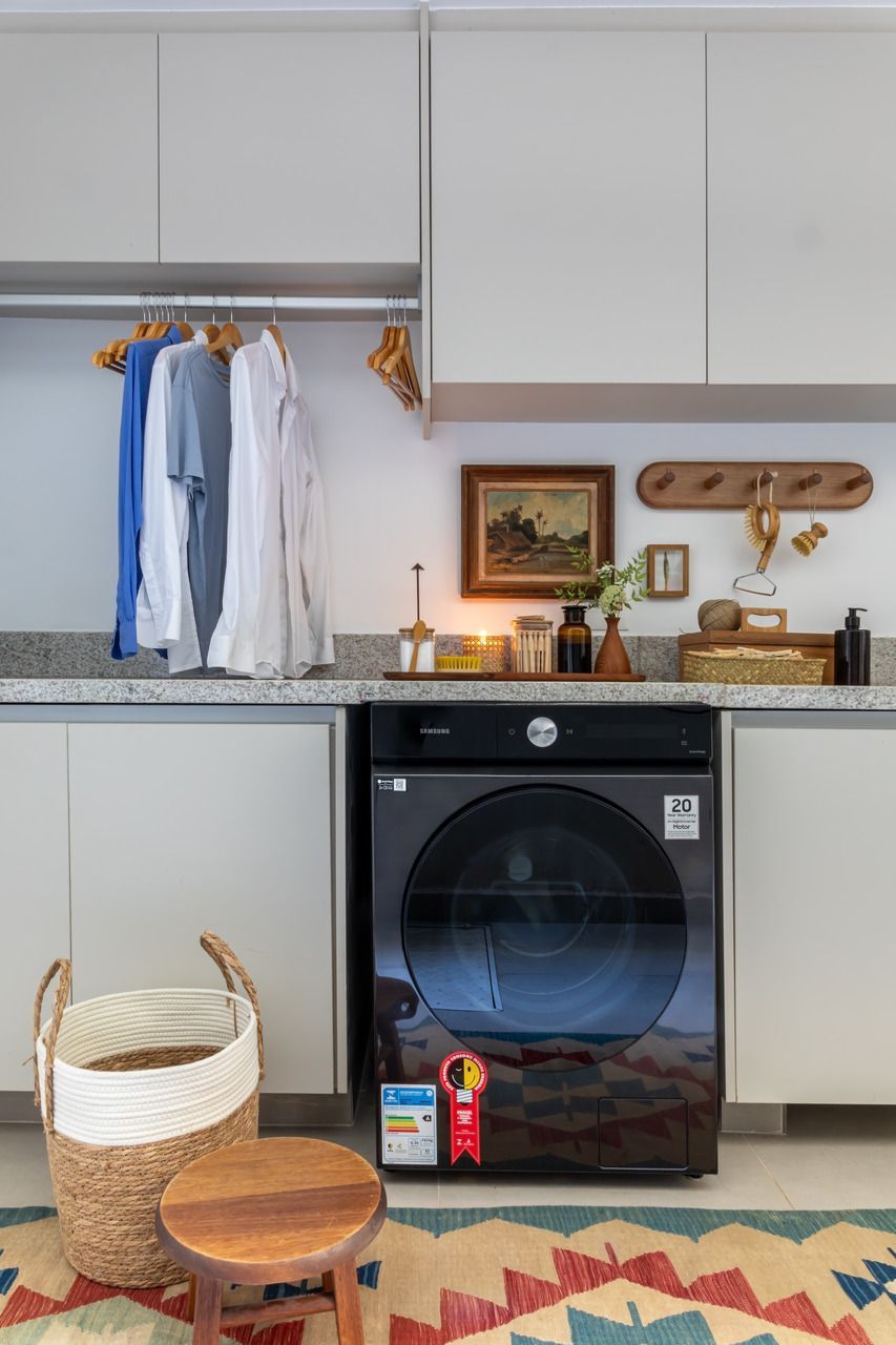 Na área de serviço, a protagonista da minha casa é a Lava e Seca Samsung Smart, controlada pelo celular. Posso estar ajustando iluminação, recebendo o arquiteto convidado ou finalizando um projeto no computador: com um toque no aplicativo, sei o que está sendo lavado, quanto falta para acabar e se preciso iniciar outro ciclo. Essa autonomia, que acontece enquanto a casa segue cheia de movimento, faz com que o cuidado com as roupas deixe de ser um item da lista e se torne quase automático. É liberdade na prática, do jeito que gosto.
