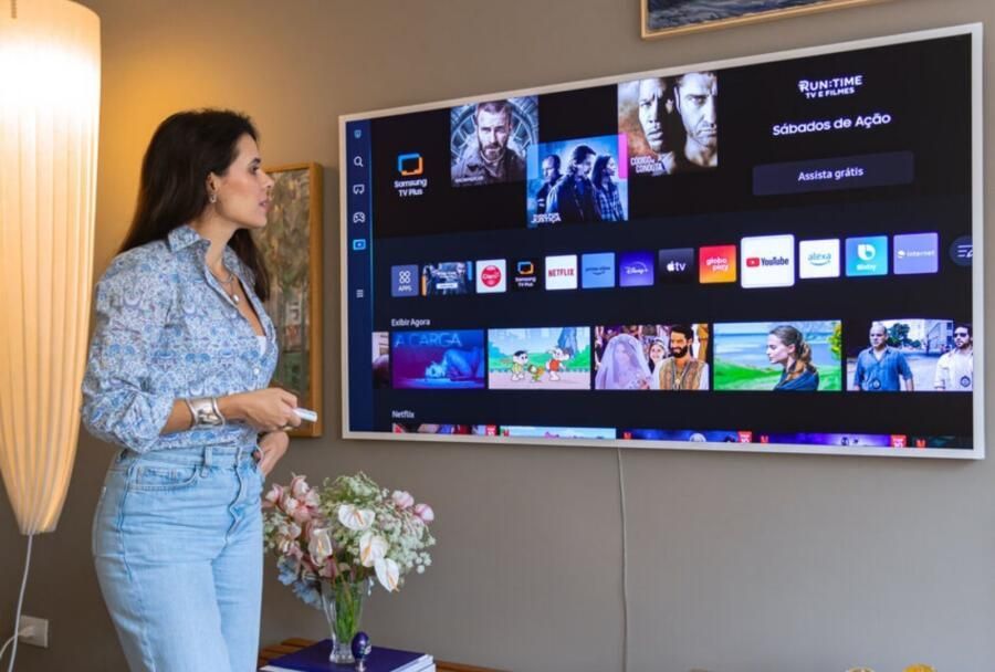Por trás desse apelo artístico, existe tecnologia de ponta em cada detalhe. O painel com pontos quânticos entrega 100% do volume de cor, enquanto o sensor de luminosidade ajusta automaticamente o brilho, garantindo visual perfeito a qualquer hora do dia. E, nos modelos de 2025, a Inteligência Artificial amplia a experiência: a TV conversa com você pelo Vision AI Companion, sugere obras conforme seu humor, responde a comandos por Bixby ou Alexa e ainda pode ser controlada por gestos com o Galaxy Watch. E, para fechar, acompanha um controle remoto SolarCell, que dispensa pilhas e recarrega por energia solar, luz ambiente ou radiofrequência, um toque inteligente que deixa tudo ainda mais fácil de ser usado.
