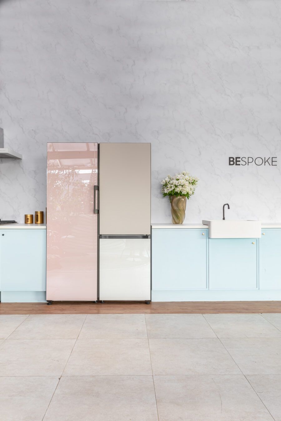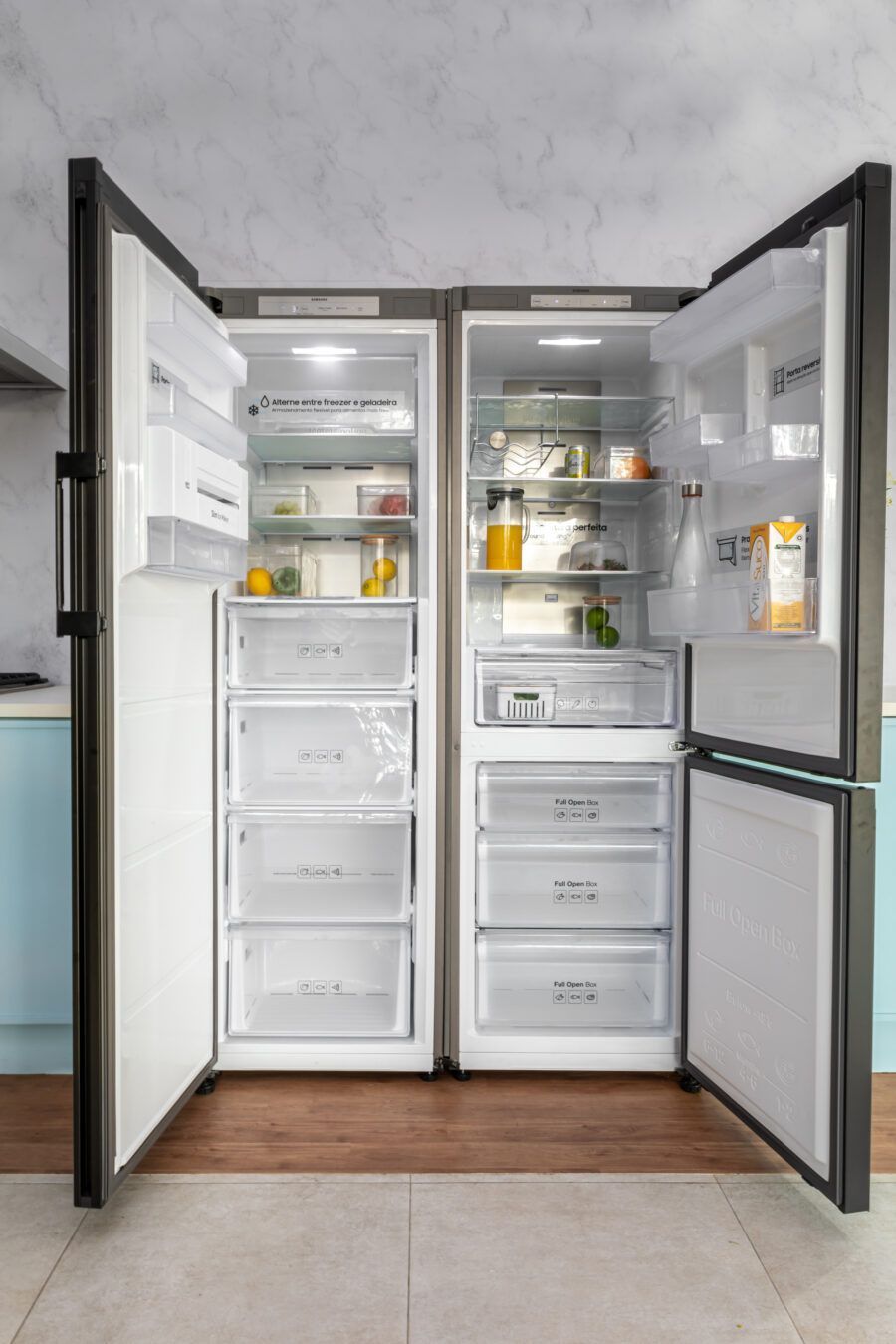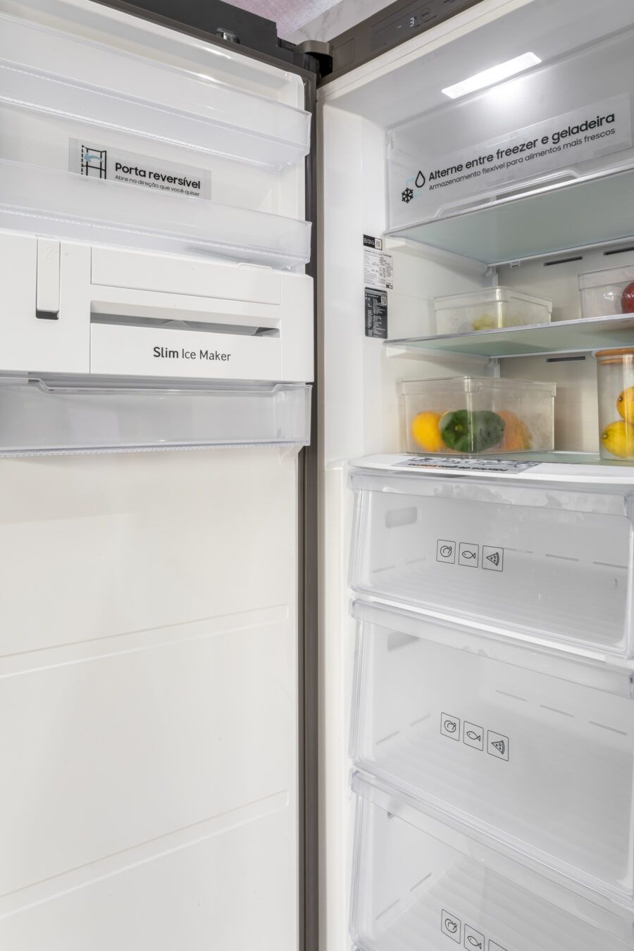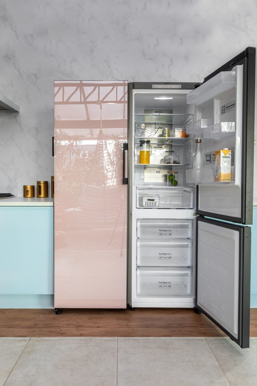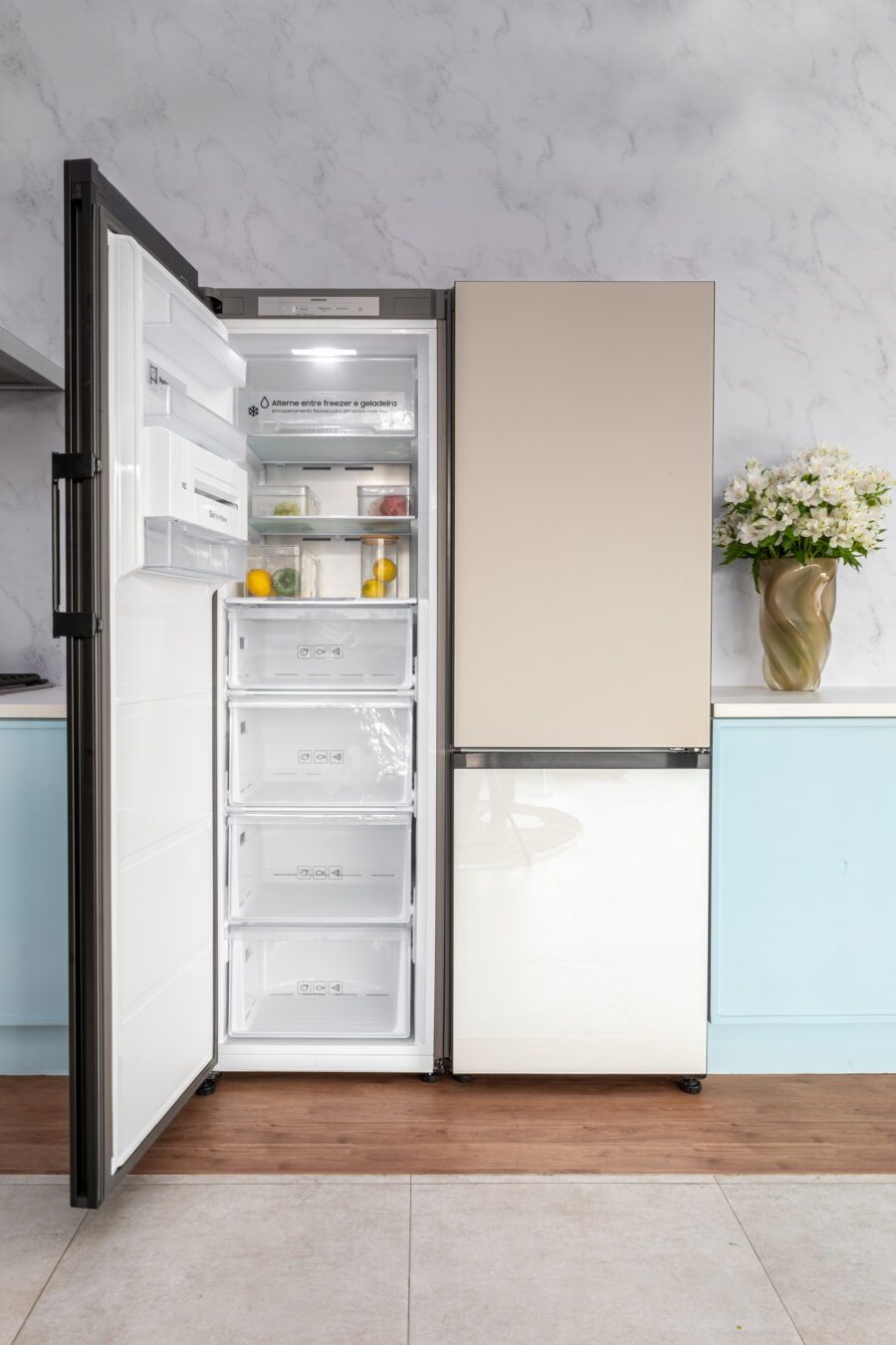 Dizer que a Bespoke é customizável significa que você pode personalizá-la e combinar geladeiras para se adequar ao seu estilo de vida. Você pode usá-la como uma única geladeira com uma porta, ou, caso precise de mais capacidade, também pode combiná-la com um ou mais módulos, inclusive com portas reversíveis que permitem configurar para qualquer um dos dois lados, ajustando-se ao design da sua cozinha.