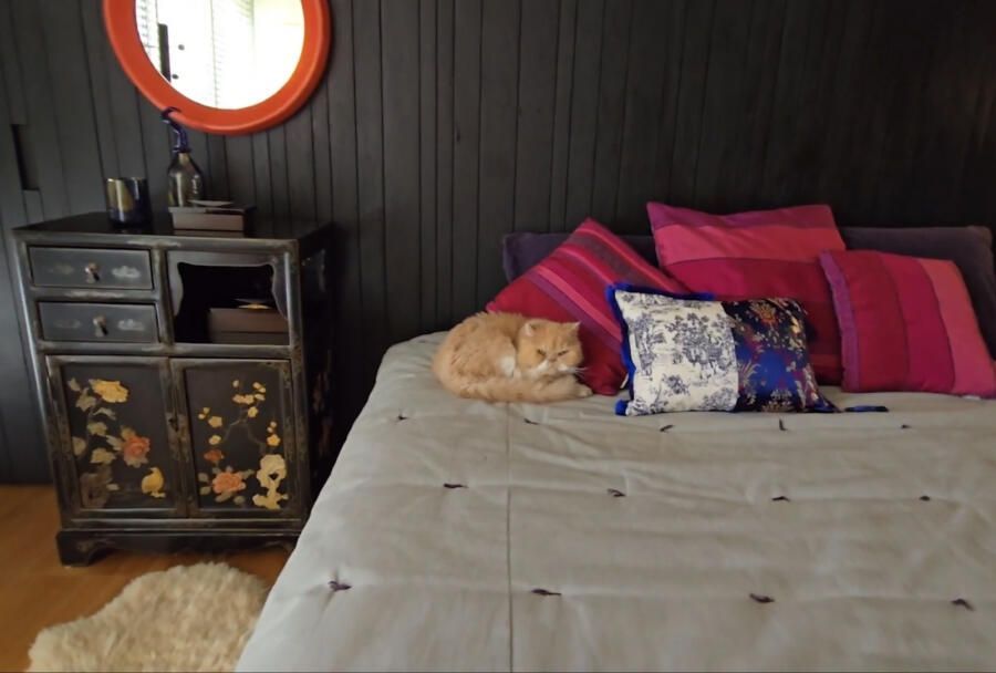 No quarto principal, o encontro entre o contemporâneo e o afetivo continua. A cama Módulo, da Futon Company, ganha vida com o enxoval delicado e as almofadas bordadas à mão por artistas brasileiros, em diálogo com objetos trazidos da China, esculturas e peças artesanais que contam histórias além das paredes do edifício.