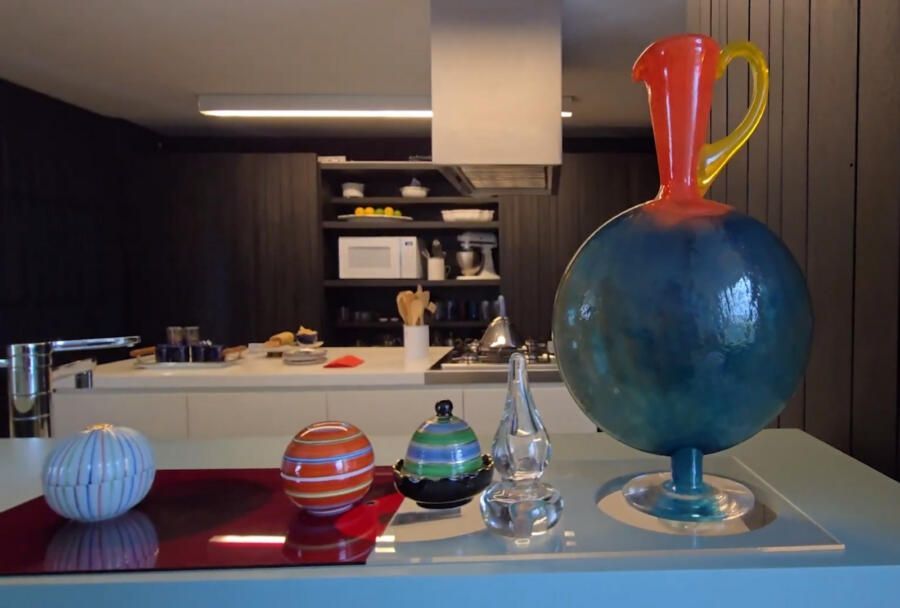 Na sala de estar, uma estante desenhada sob medida para acomodar uma das paixões mais marcantes da arquiteta, os vidros, é protagonista máxima. Patricia sempre colecionou peças em viagens e, em 2023, começou a trabalhar ela mesma com o material, participando de workshops para aprender técnicas de tingimento e sopro. Desde então, a coleção ganhou ainda mais vida e se tornou parte do décor. Ali, cores e formas se multiplicam, transformando o espaço em uma verdadeira vitrine de memórias.