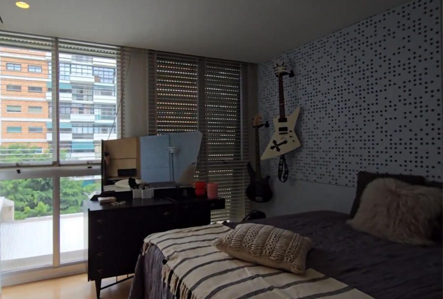 No quarto principal, o encontro entre o contemporâneo e o afetivo continua. A cama Módulo, da Futon Company, ganha vida com o enxoval delicado e as almofadas bordadas à mão por artistas brasileiros, em diálogo com objetos trazidos da China, esculturas e peças artesanais que contam histórias além das paredes do edifício.