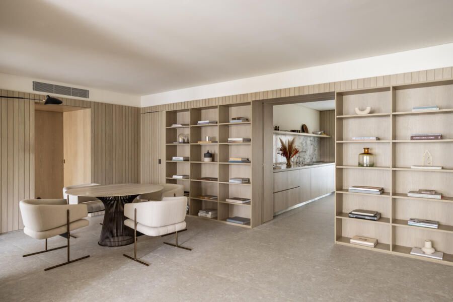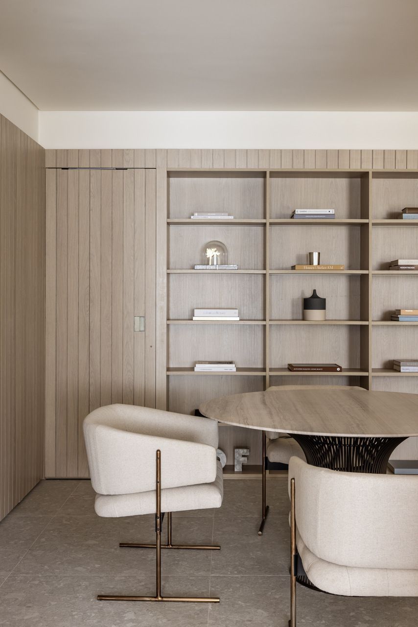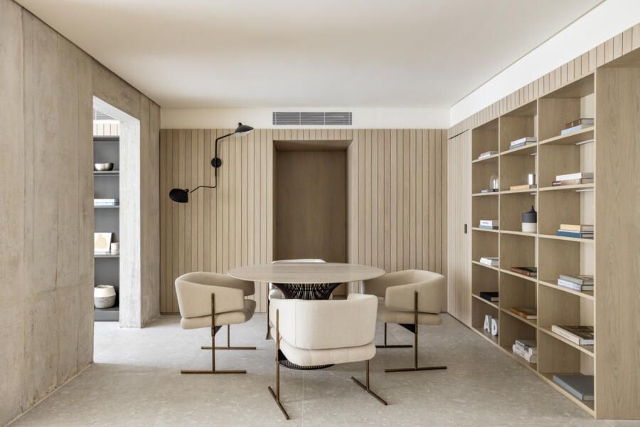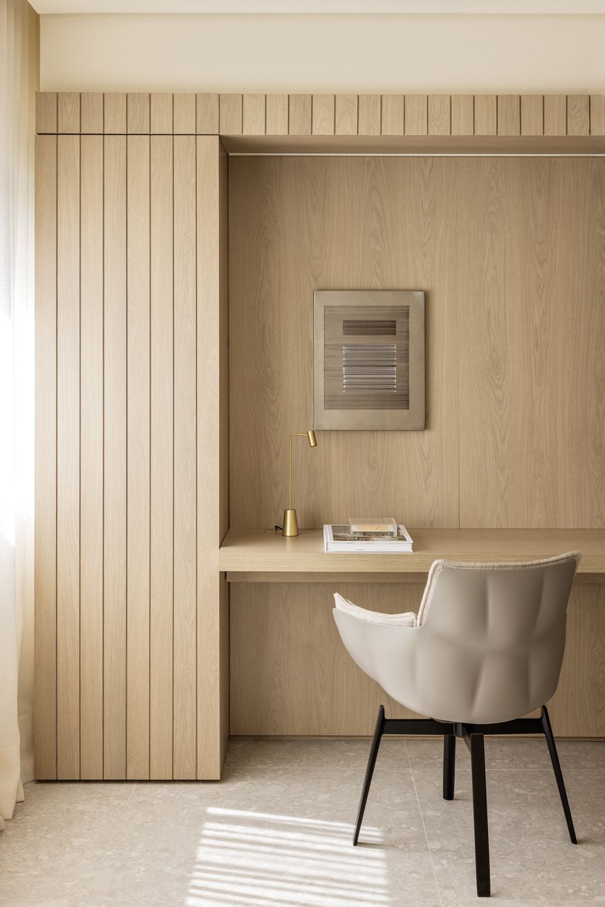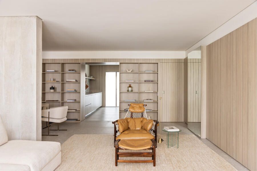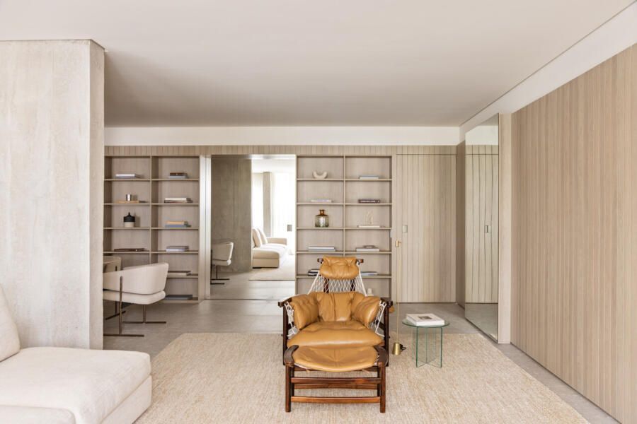 A marcenaria tem papel central no design, vestindo os espaços e tornando o ambiente visualmente completo, sem depender de obras de arte imediatas. As soluções arquitetônicas foram cuidadosamente pensadas para permitir a adição gradual de peças decorativas, como quadros, ao longo do tempo, sem que o apartamento parecesse incompleto. Outro ponto de destaque é a iluminação indireta, presente em diversos ambientes, como na sala e nos nichos, proporcionando uma atmosfera acolhedora.
