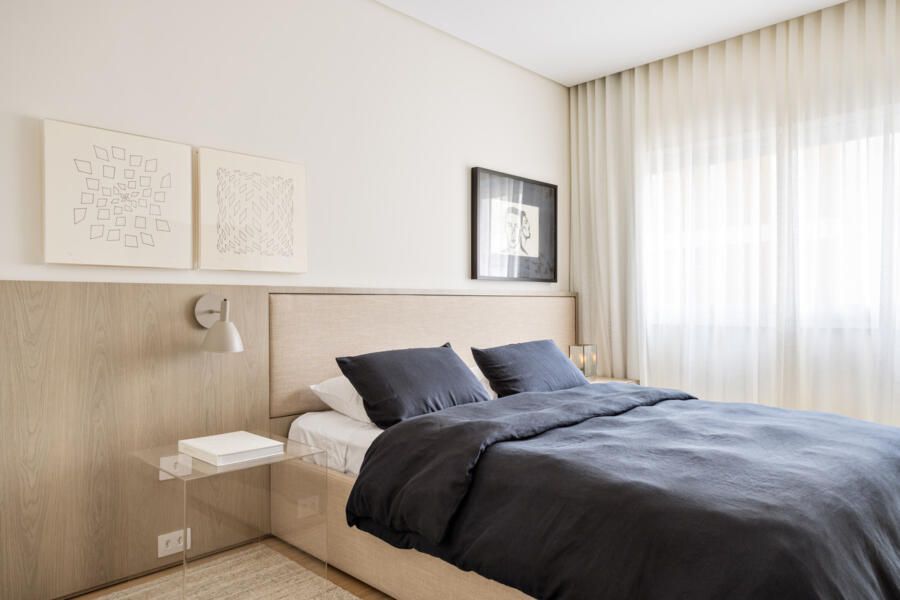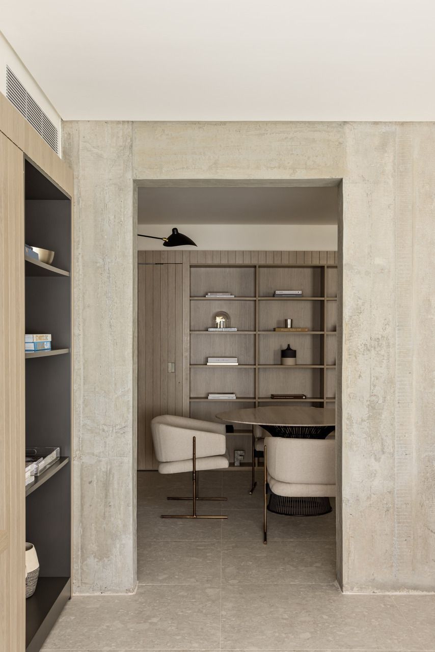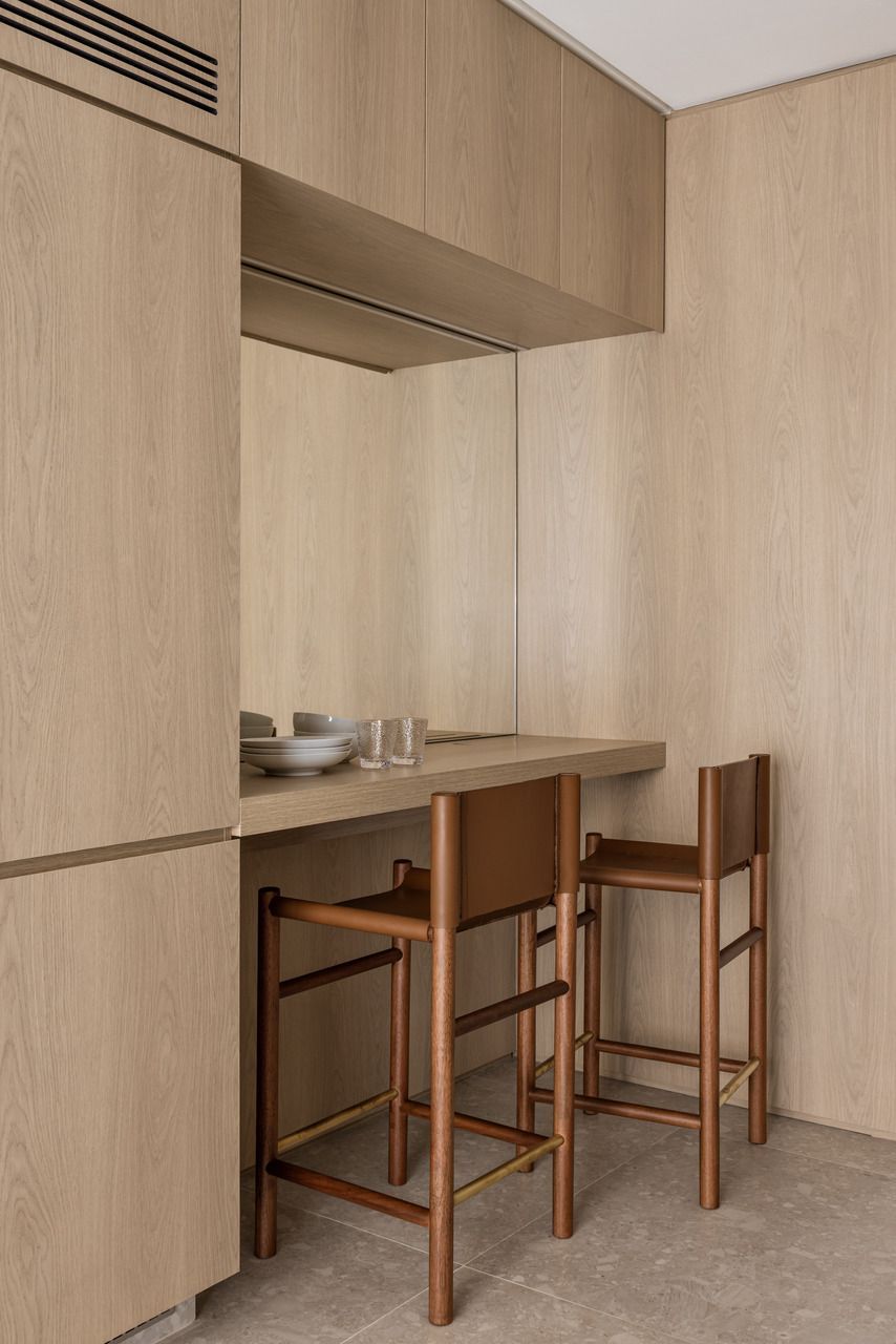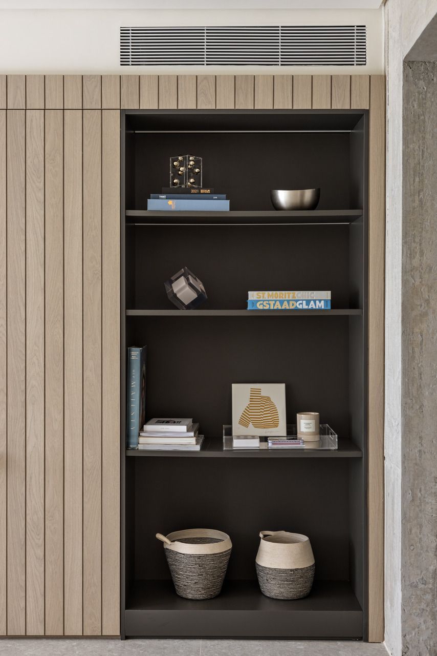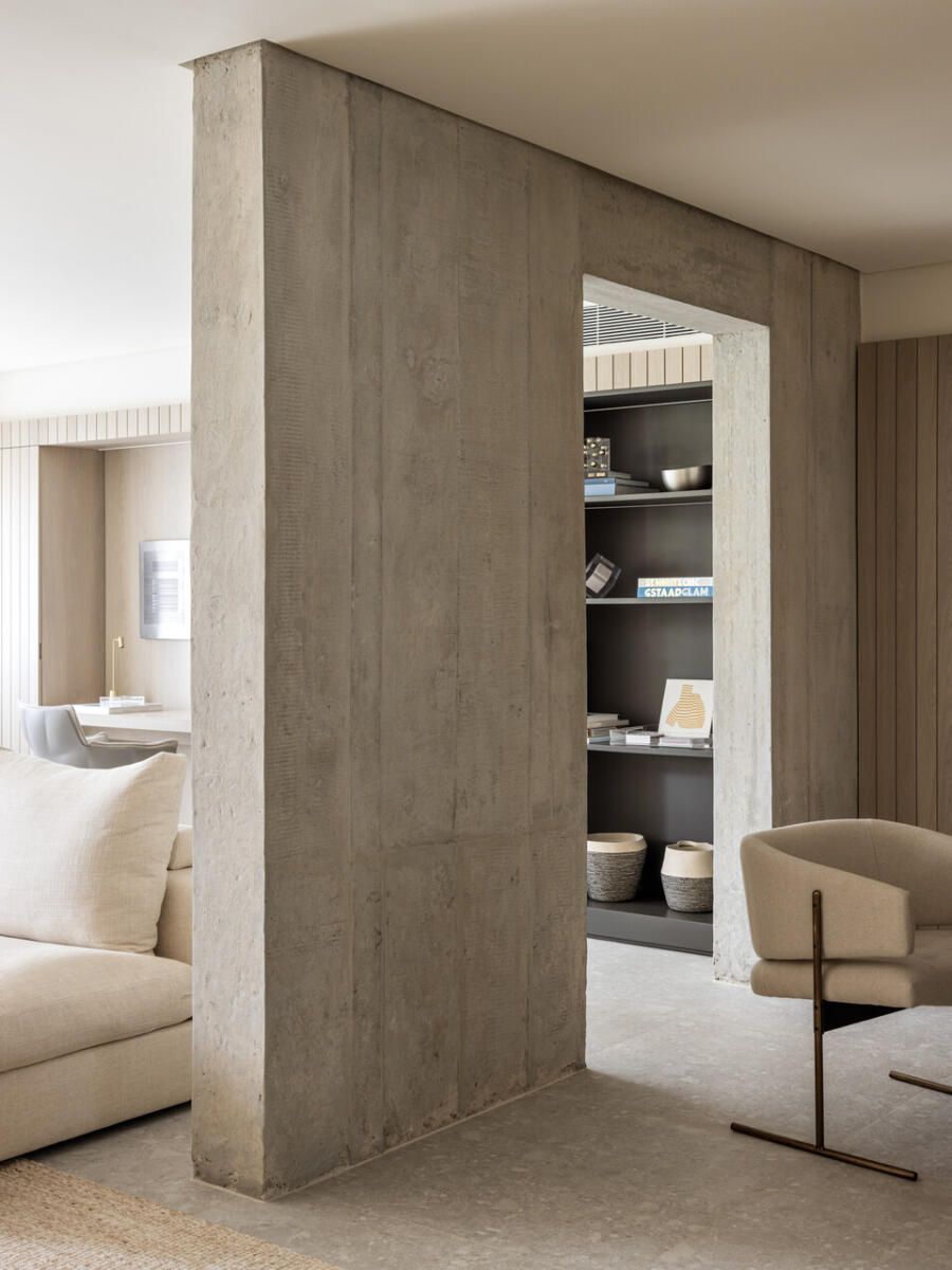A marcenaria tem papel central no design, vestindo os espaços e tornando o ambiente visualmente completo, sem depender de obras de arte imediatas. As soluções arquitetônicas foram cuidadosamente pensadas para permitir a adição gradual de peças decorativas, como quadros, ao longo do tempo, sem que o apartamento parecesse incompleto. Outro ponto de destaque é a iluminação indireta, presente em diversos ambientes, como na sala e nos nichos, proporcionando uma atmosfera acolhedora.