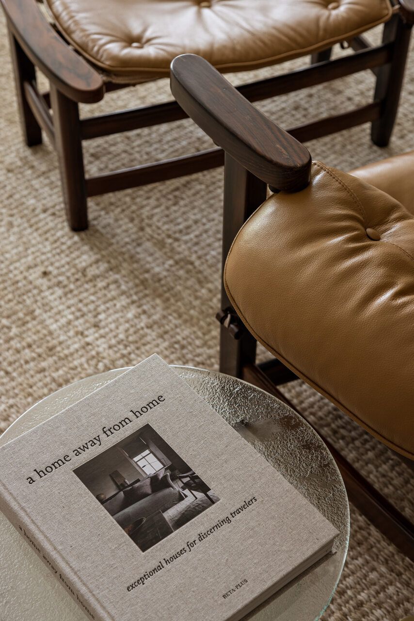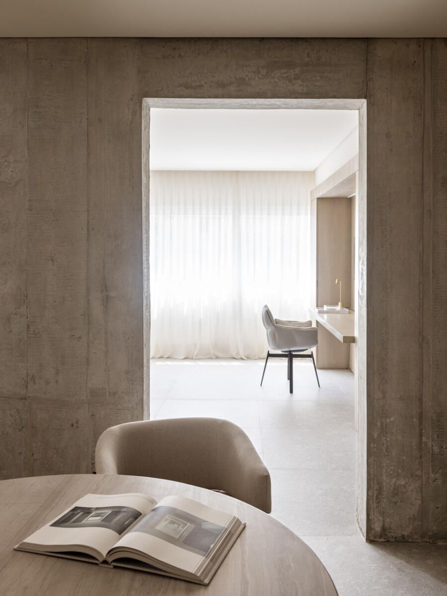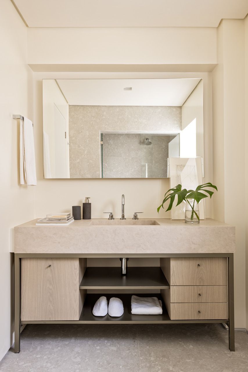 Entre os cômodos, estão a cozinha, varanda, dois dormitórios para hóspedes, banheiros, dormitório master, closet, banho master e lavabo. A varanda é um destaque especial, pois representa um respiro dentro do apartamento, sendo parte fundamental do conceito do projeto. As plantas, idealizadas em parceria com Bia Abreu, estão dispostas em vasos cerâmicos pintados em cinza chumbo e caixas metálicas suspensas, trazendo a natureza para dentro do lar.