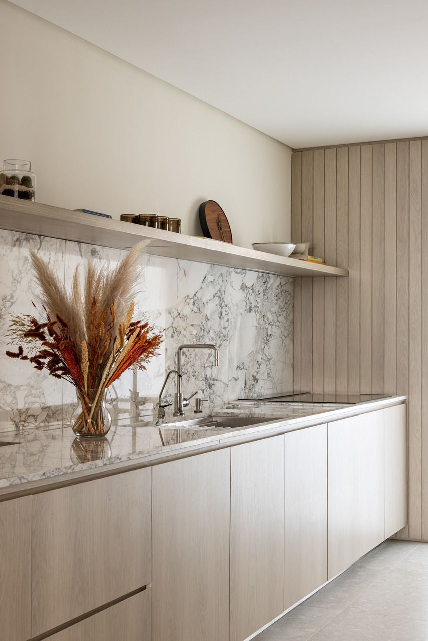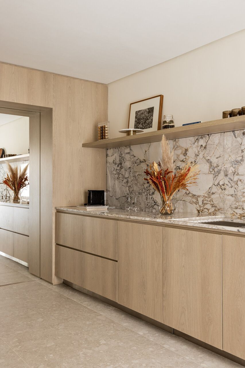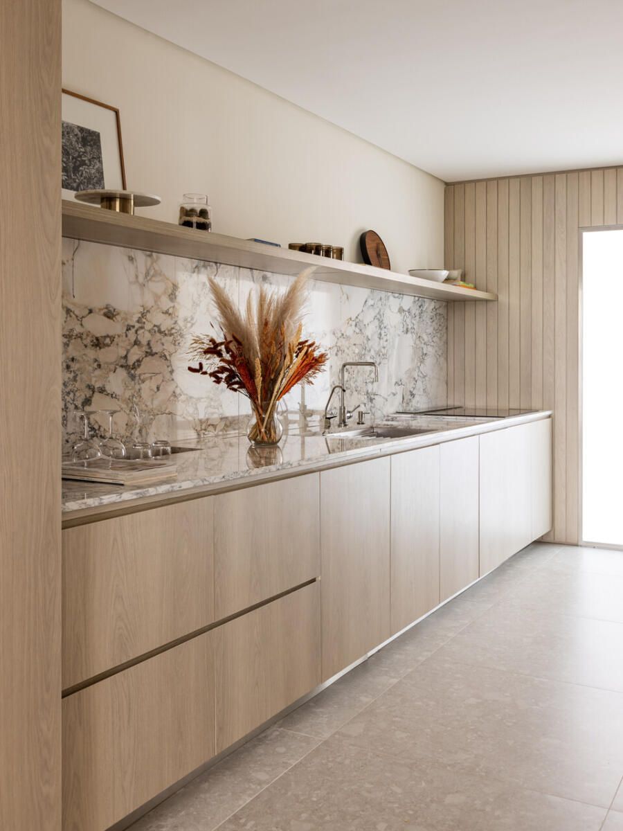 A cozinha, por exemplo, pode se integrar à sala por meio de uma porta de correr espelhada, transformando-se em um ambiente social. A marcenaria esconde eletrodomésticos como geladeira, micro-ondas e lava-louças.