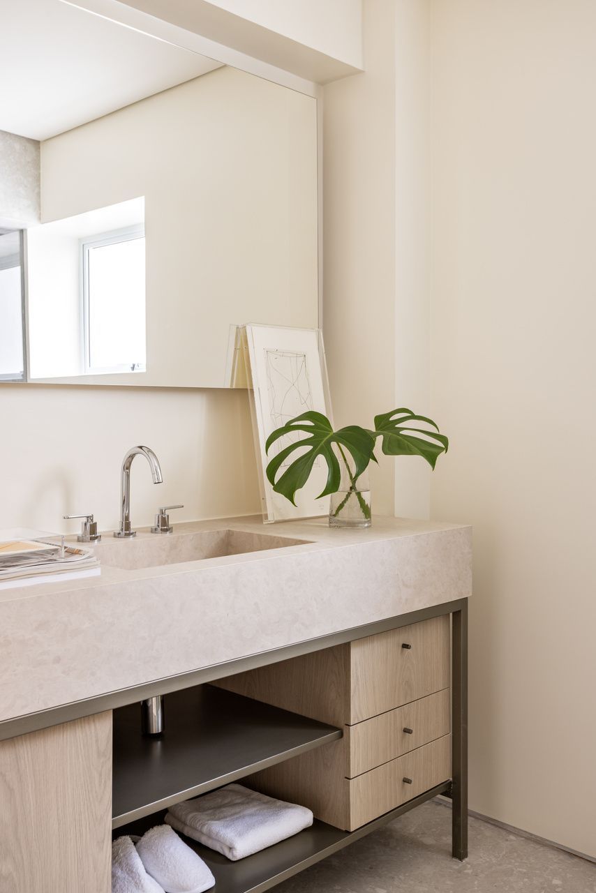Um dos principais elementos estruturais são os pilares aparentes, que antes estavam ocultos dentro das paredes, mas foram destacados durante a reforma. O lavabo, por sua vez, foi pensado para ser dramático, com revestimento em madeira e iluminação indireta em torno do espelho.