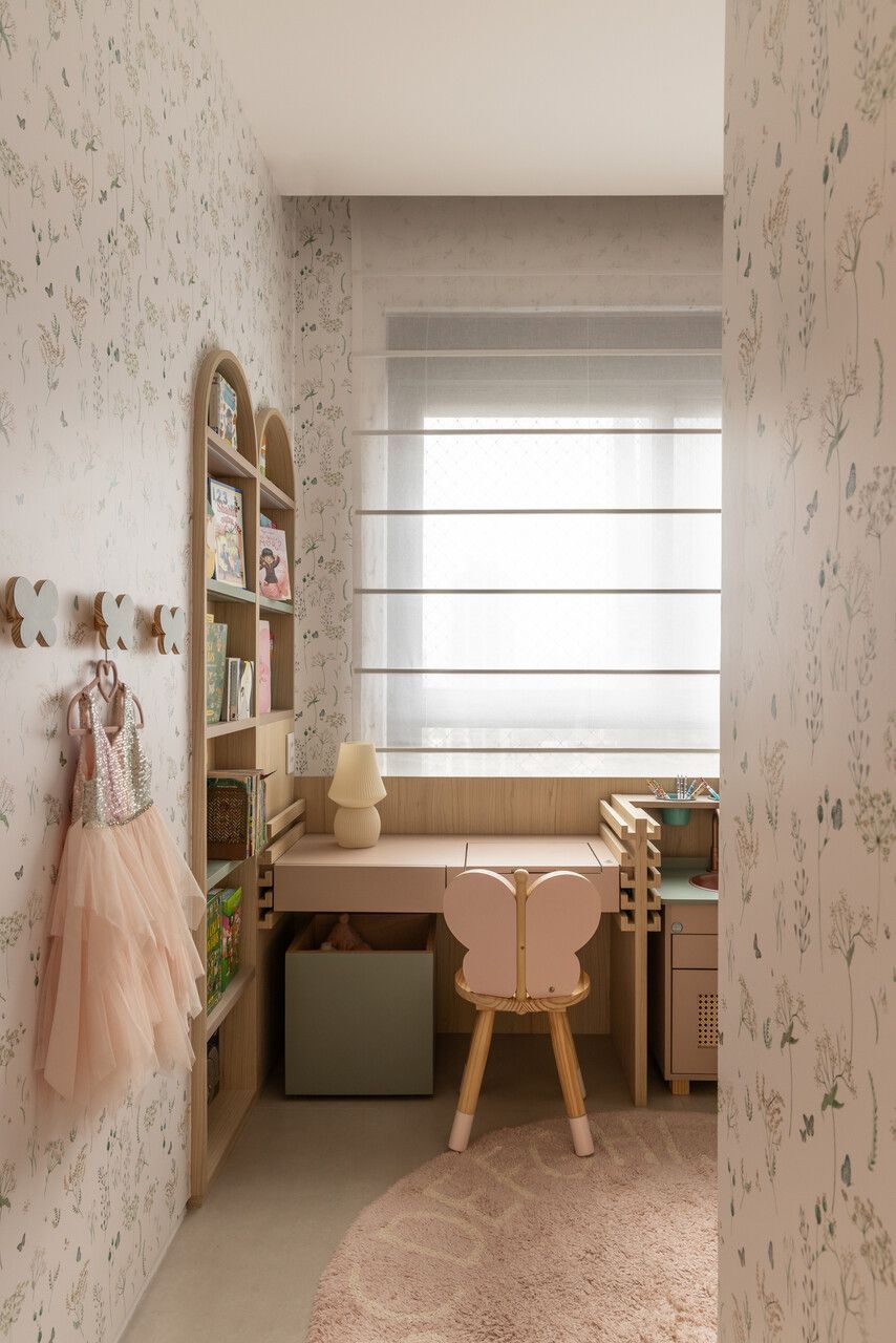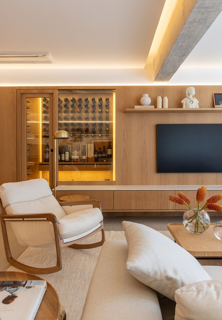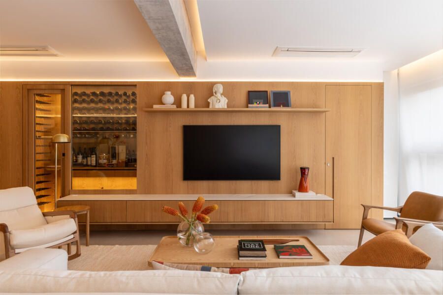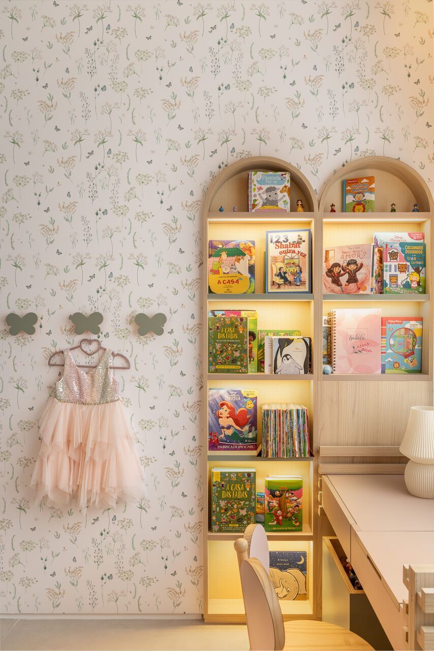 Seguindo pelo apartamento, dá para perceber como o projeto foi totalmente moldado aos desejos dos moradores. O quarto das meninas, por exemplo, é lúdico e criativo, incentivando o brincar, mas com soluções que mantêm a organização. Já entre a área social e a ala íntima, a adega walk-in cria uma transição elegante e reforça o estilo de vida dos moradores, que adoram receber visitas.