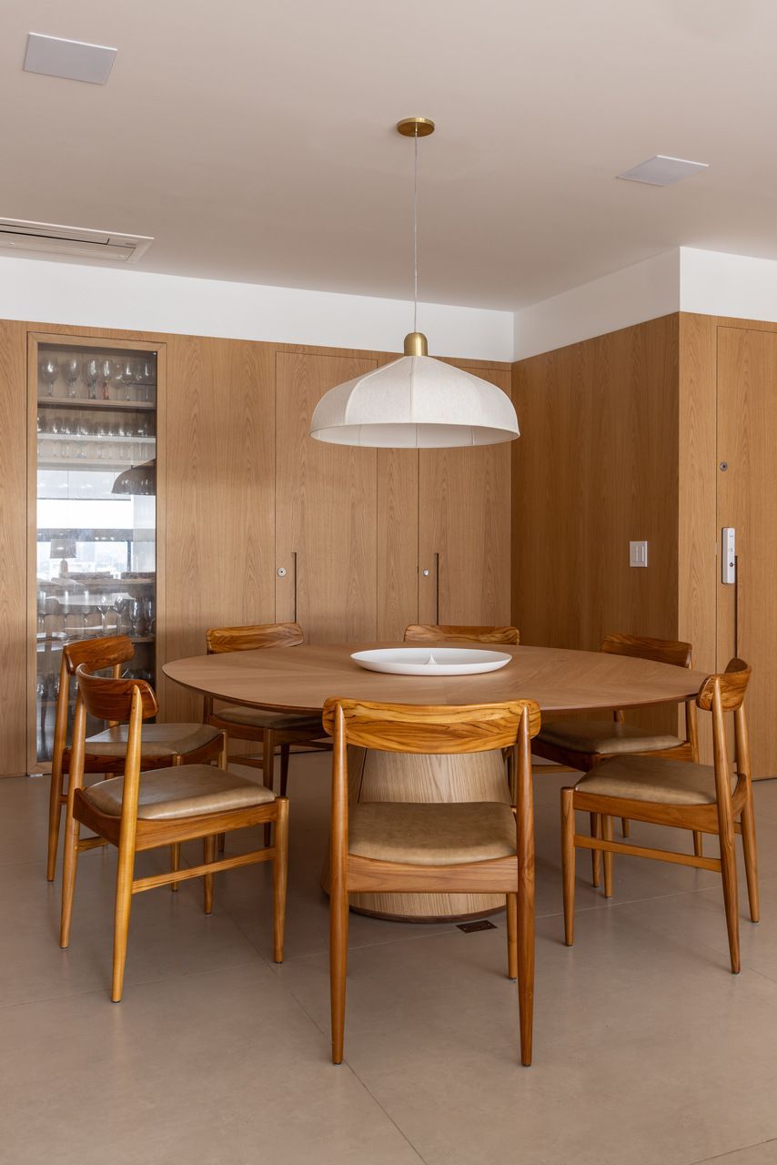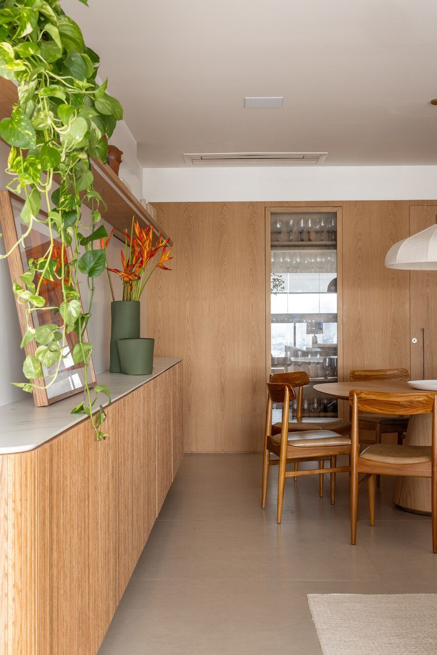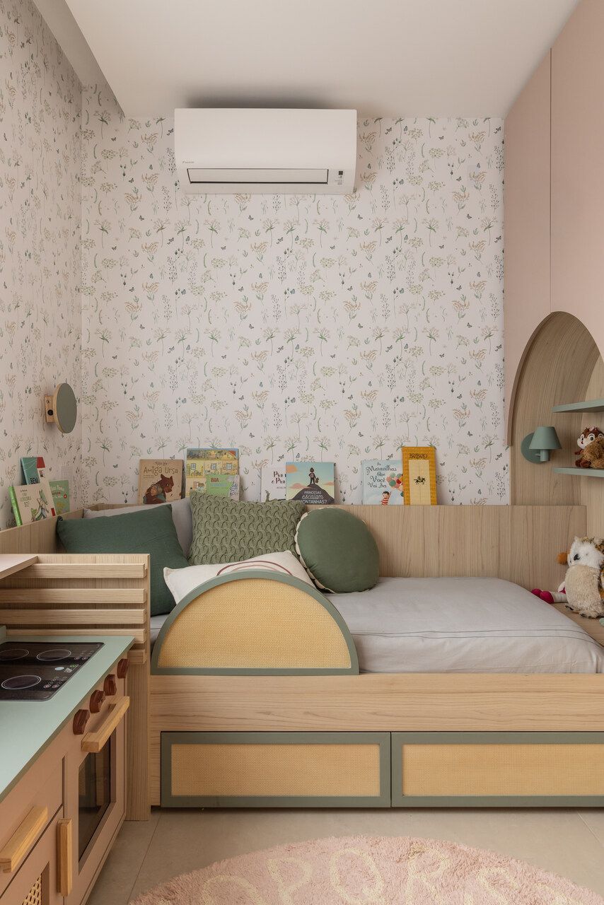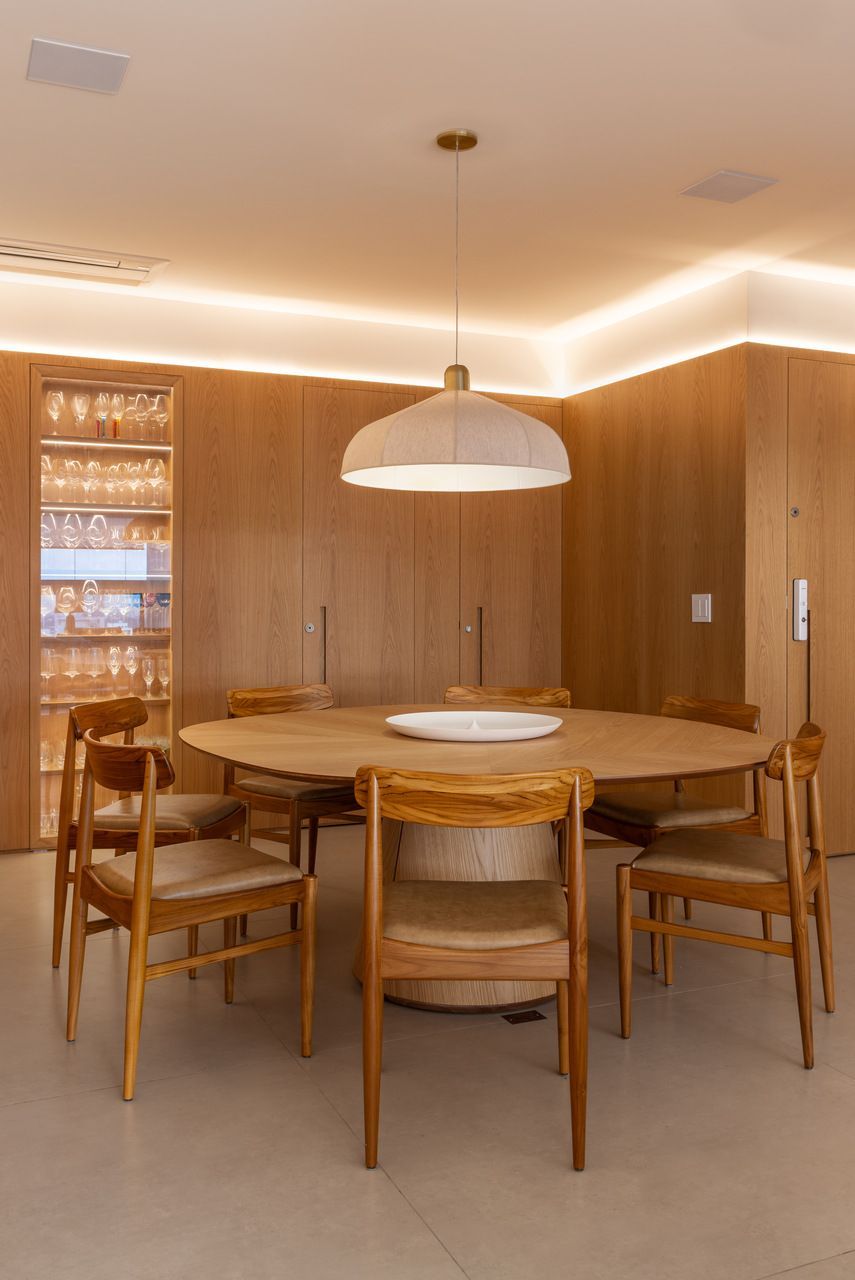 Seguindo pelo apartamento, dá para perceber como o projeto foi totalmente moldado aos desejos dos moradores. O quarto das meninas, por exemplo, é lúdico e criativo, incentivando o brincar, mas com soluções que mantêm a organização. Já entre a área social e a ala íntima, a adega walk-in cria uma transição elegante e reforça o estilo de vida dos moradores, que adoram receber visitas.