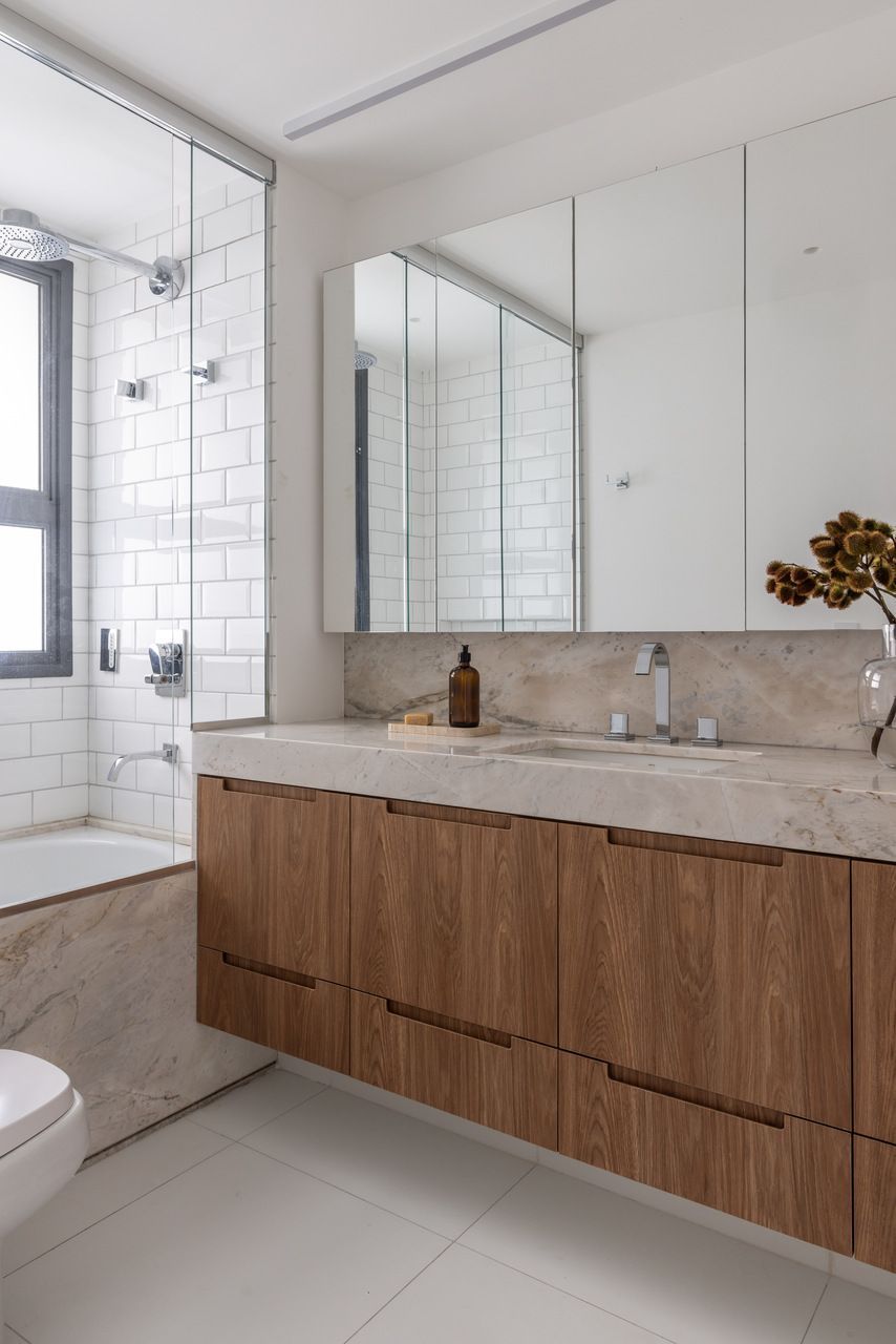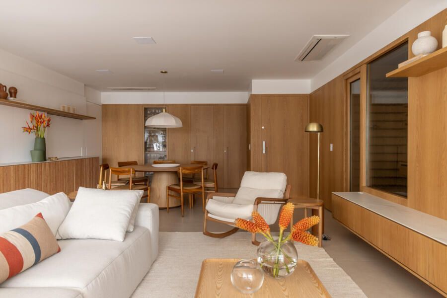 Estou muito animada em trazer para cá mais um Open House gravado em parceria com a Samsung, uma série em que visito projetos inteligentes e muito bem resolvidos que utilizam a tecnologia de forma estratégica para facilitar a rotina e garantir mais qualidade no dia a dia. E o apê da vez, assinado pela Casa33 Arquitetura, é um ótimo exemplo disso. Fui recebida pelas arquitetas Mariana Lebrão e Claudia Moubarak no apartamento de 194m², em São Paulo, pensado para um casal jovem com duas filhas pequenas, e que equilibra muito bem estética, funcionalidade e soluções práticas para a vida real.