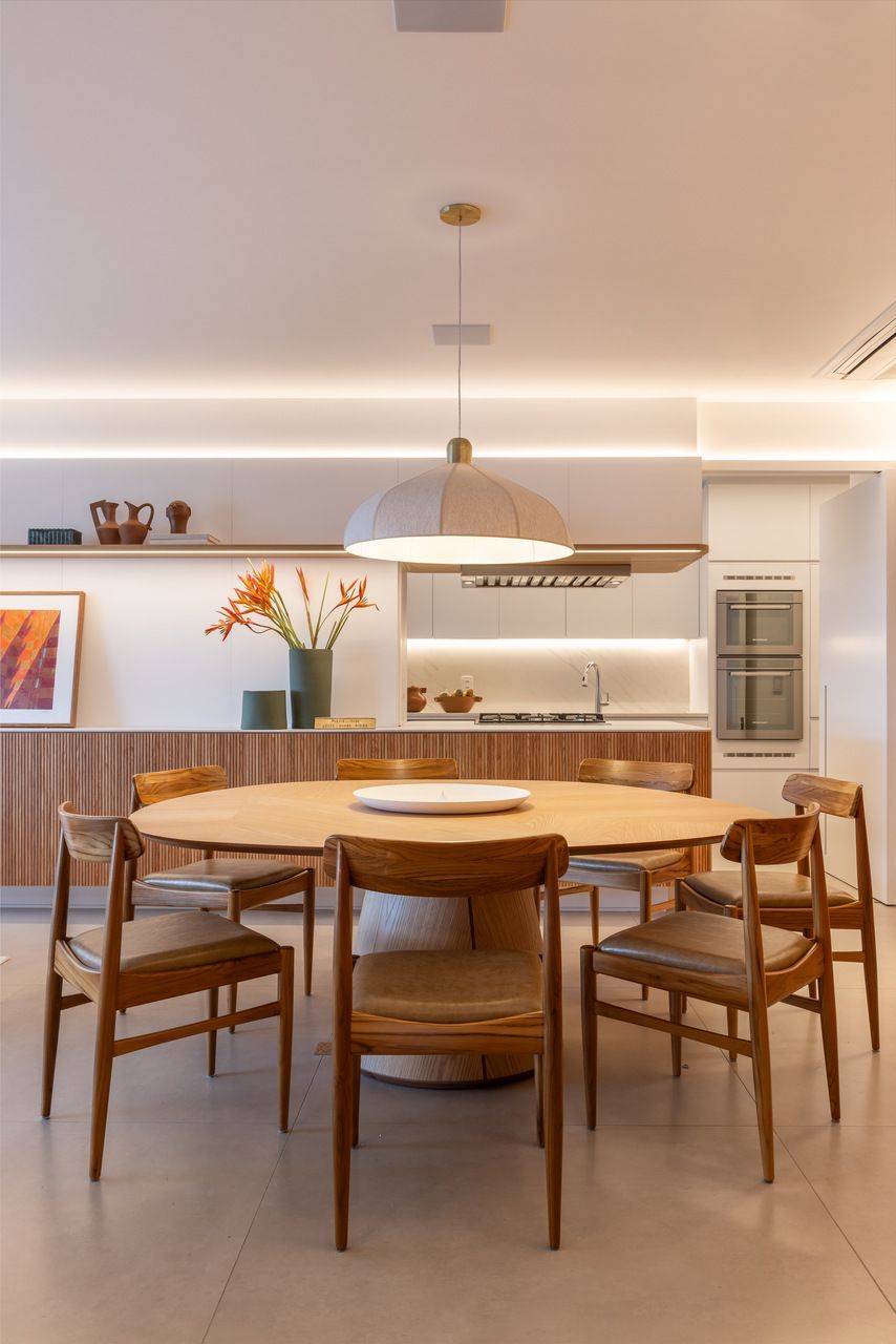 Logo na entrada, a área social integrada já mostra a força do projeto: sala de estar, jantar, cozinha e terraço gourmet se conectam de forma fluida, mas com recursos que permitem isolar ambientes quando necessário. É uma casa pronta tanto para receber amigos quanto para acompanhar a rotina da família. E é justamente nesse espaço que a tecnologia entra como extensão do design. Na sala, a TV The Frame da Samsung se encaixa perfeitamente na proposta estética do ambiente.