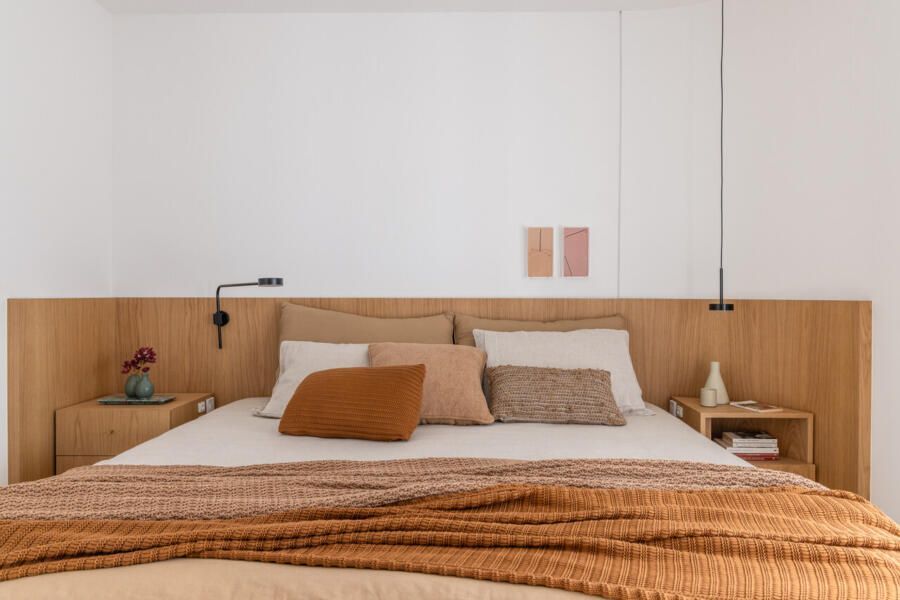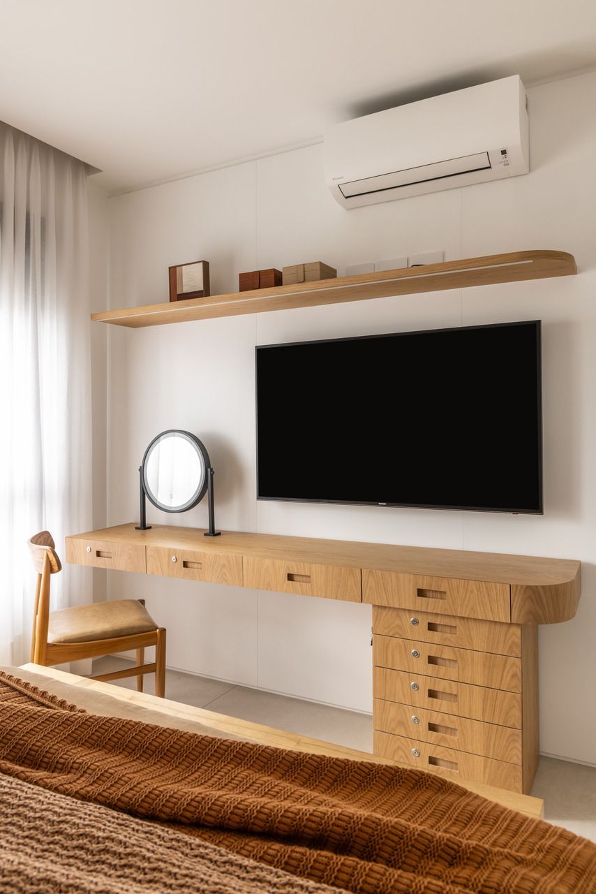 Na ala íntima, a suíte do casal foi pensada como um refúgio, com banheiro espaçoso e banheira, atendendo a um pedido especial da moradora. Aqui encontramos a segunda TV The Frame do projeto, reforçando como o design do produto permite que a tecnologia esteja presente sem roubar a cena, mantendo o clima relaxante do ambiente. O fato da The Frame se transformar em obra de arte quando desligada faz toda a diferença em espaços de descanso.