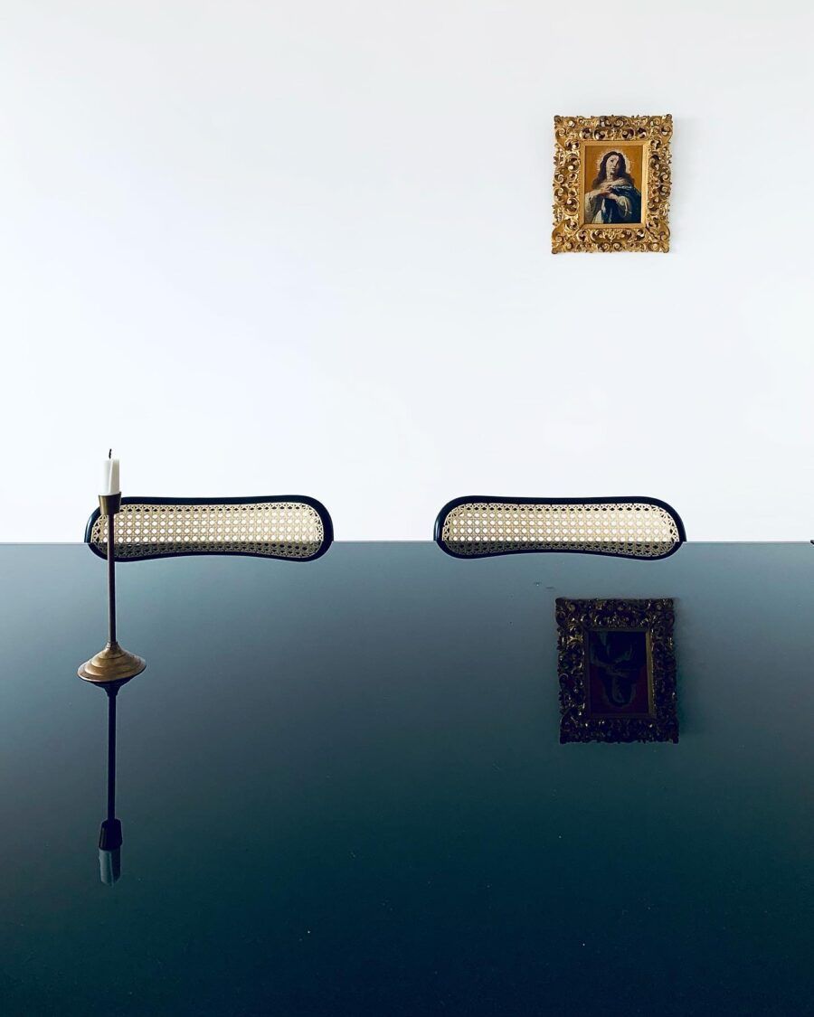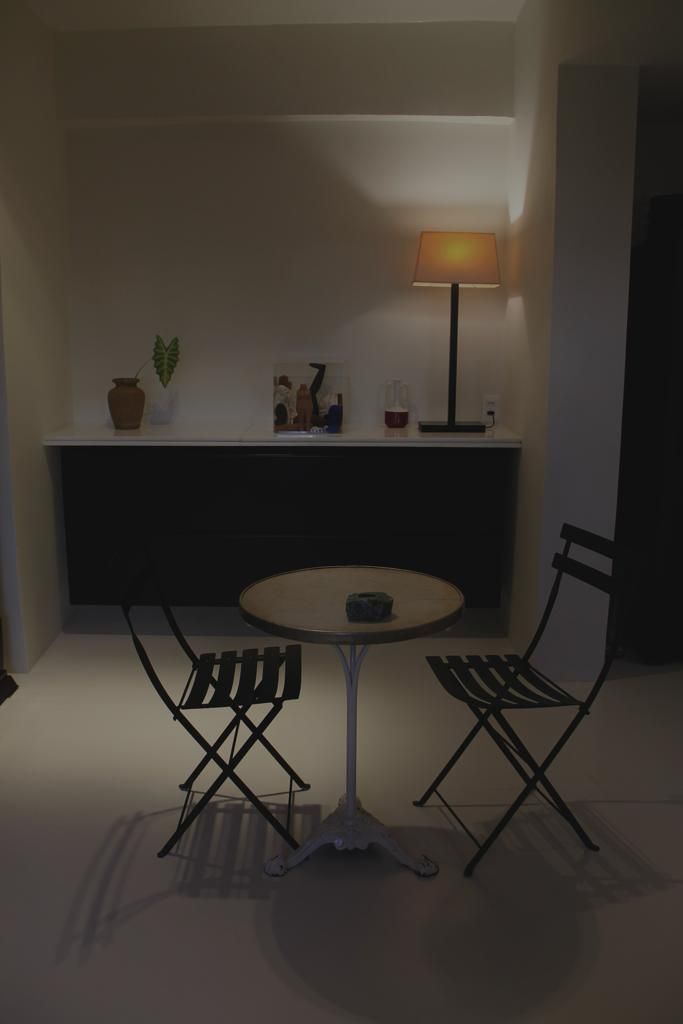 Victor Lucena: O mobiliário do apartamento é 80% vintage. Muitas das peças vieram do antigo apartamento do Laurent em Paris, quando ele se mudou para João Pessoa. Já os objetos são um mix de grandes designers e garimpos em fleamarket. Temos uma boa coleção de livros, que resultaram em uma biblioteca de alvenaria que é o ponto central da sala. A orientação dos móveis não é para a televisão, esta fica num canto discreto. Os quartos não possuem televisão nem pontos elétricos expostas. Os móveis da cozinha foram reaproveitados, recebendo pintura automotiva preta. Até a geladeira recebeu esta pintura. Os armários dos quartos também foram reciclados, onde trocamos apenas as portas e conservamos o interior.