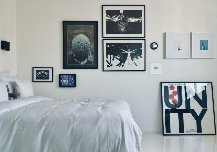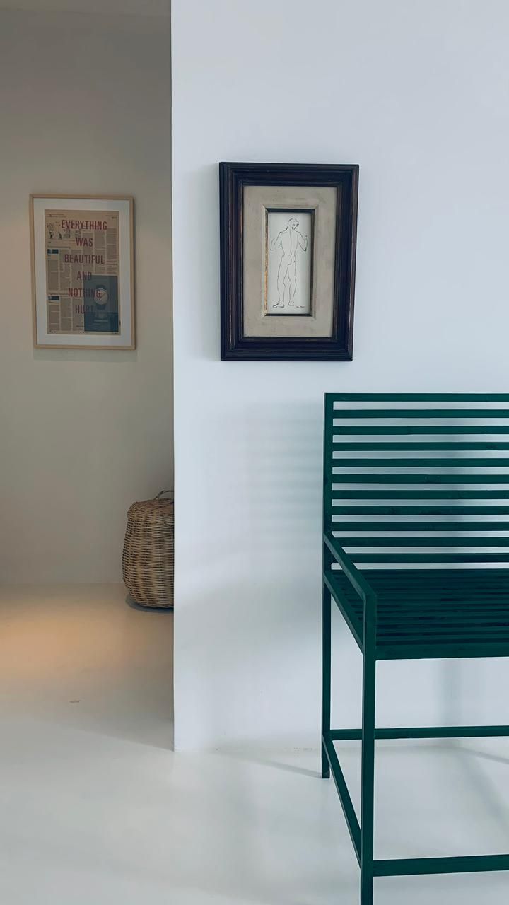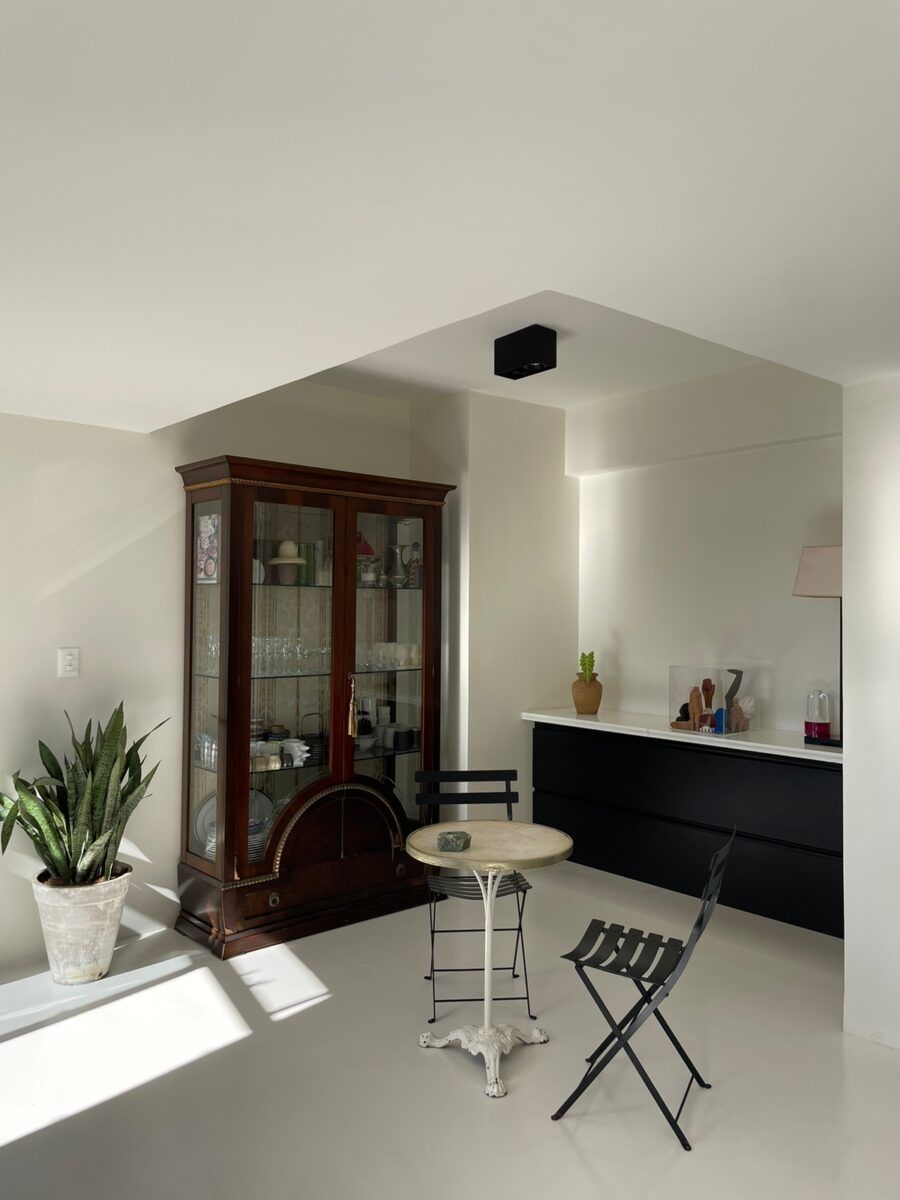 Com muitas referências franco-brasileiras, a decoração é extremamente clean, minimalista e conta com móveis de pegada vintage. O branco é a cor predominante e ajuda a criar a sensação de amplitude dos ambientes, com destaque para o piso de mármore original do apartamento. Além disso, inúmeras pinturas, litografias, fotografias e peças de designers renomados preenchem as paredes e mobiliário, deixando o projeto com a cara dos moradores e criadores do escritório Designer de Atmosfera.