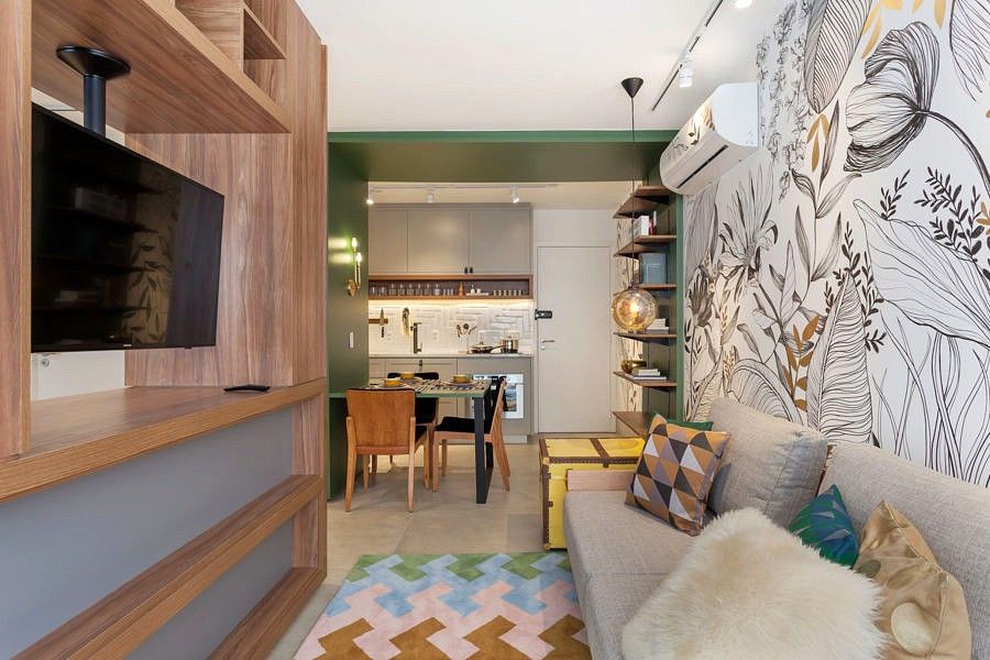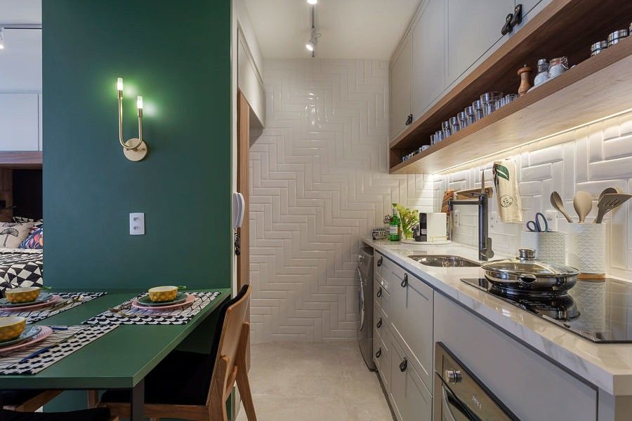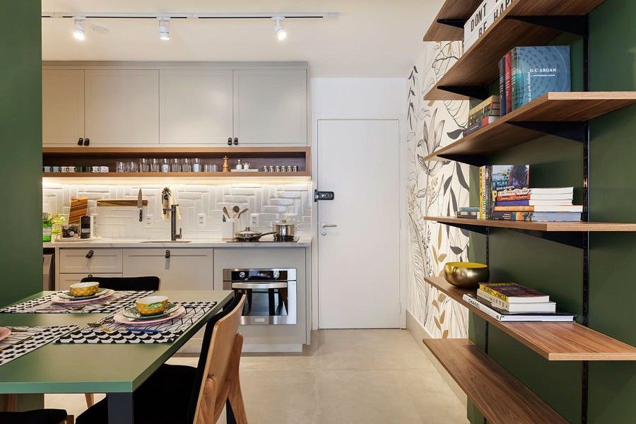Foi criada uma paginação diferenciada para personalizar o uso dos revestimentos, com o principal objetivo de aproveitamento de espaço para atender todas as necessidades dos moradores. Ao criar um pórtico demarcando o jantar o Neo Arq já aproveitou para demarcar uma estante de livros e separar a cozinha da sala. Um móvel multifuncional que funciona de comida e armário enquanto serve de suporte para TV 360°, que atende quarto e sala.