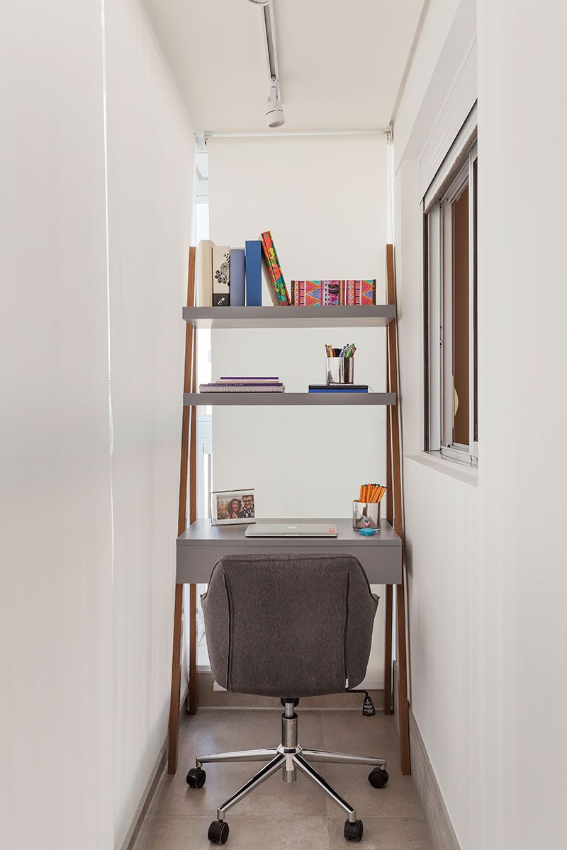 Os morados queriam um canto pequeno para trabalho, com um pedido especial: restaurar um móvel antigo que pertenceu ao avô do proprietário quando chegou ao Brasil, vindo da Itália. A integração da varanda foi ponto fundamental para satisfazer esse pedido, pois assim foi possível acomodar um pequeno Home office.