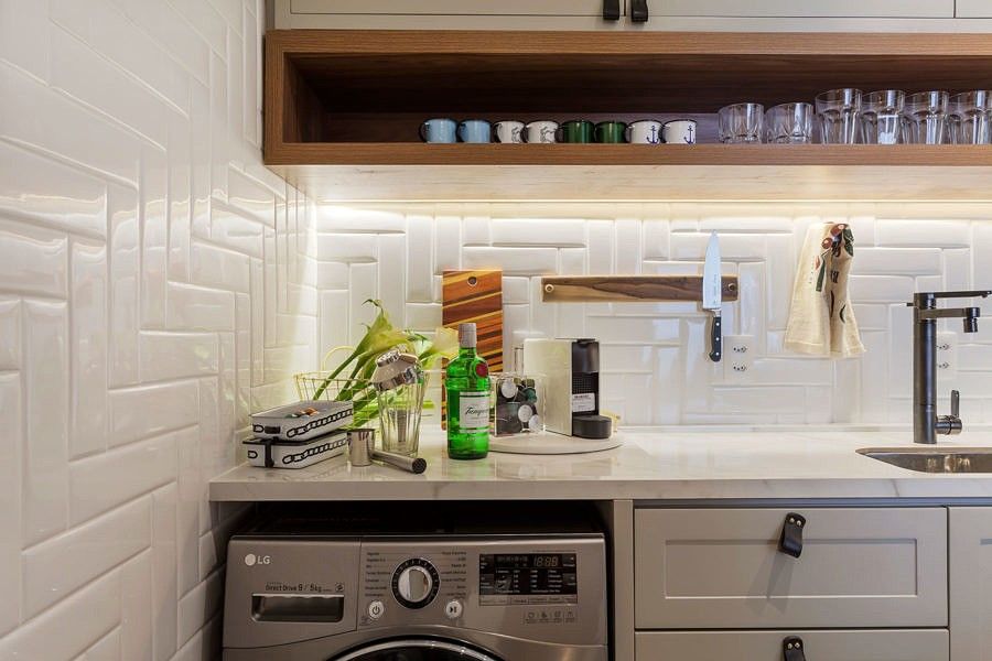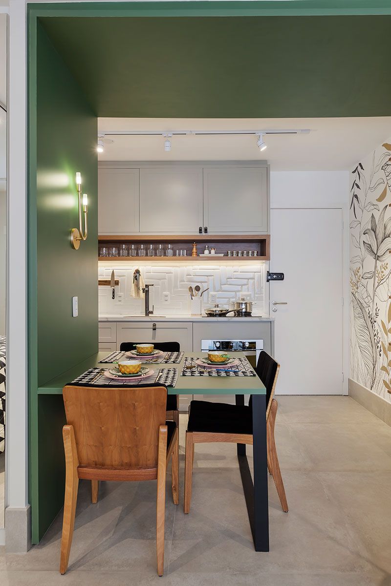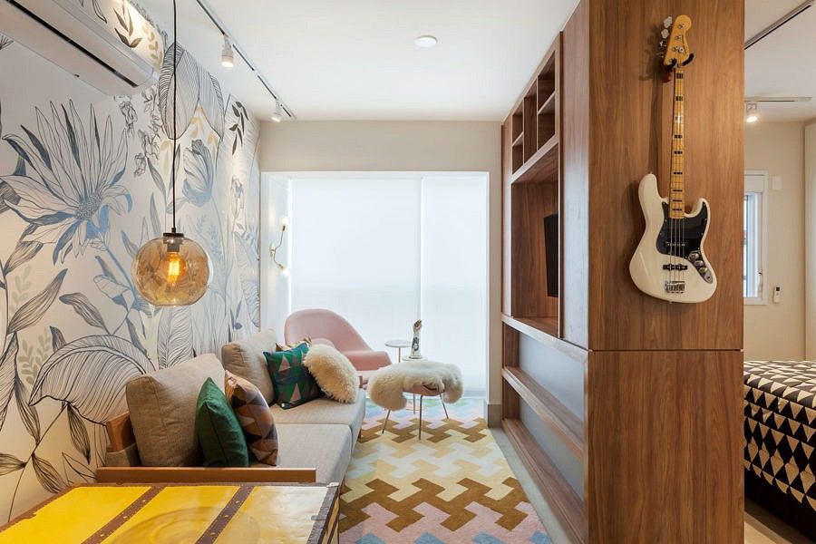 O escritório Neo Arq assina o projeto desse apartamento de 32m², em Bela Vista, São Paulo. O Jovem casal de moradores deu liberdade para o uso de cores no projeto e pediu o aproveitamento máximo de armários. Os revestimentos e bancadas já haviam sido adquiridos antes do projeto, então foram o de partida do escritório, porém tiveram que alterar o desenho da bancada banheiro e a pedra da bancada cozinha.