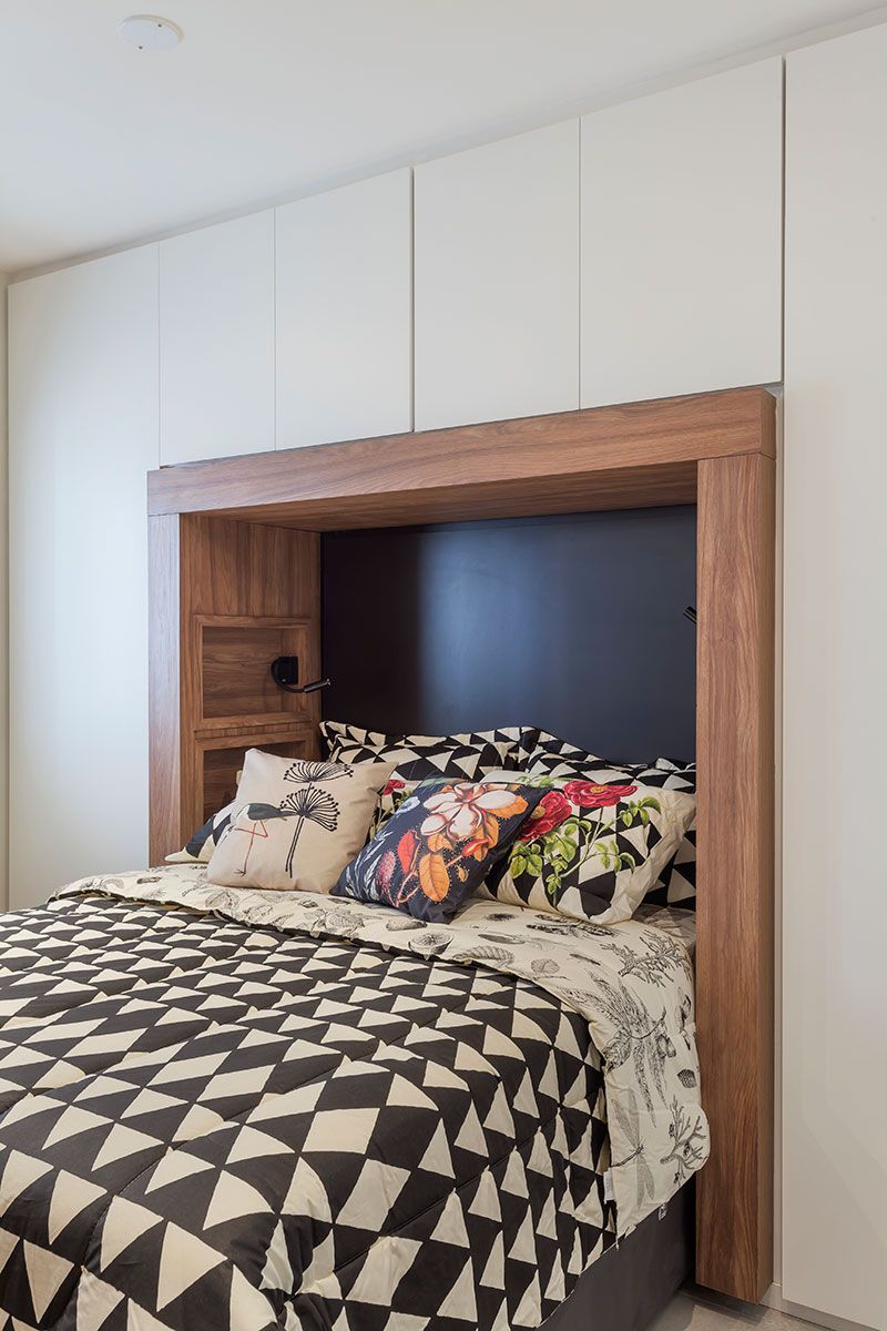 Para melhor uso de armários, a cama foi envolvida com um grande armário na cor branca. Para destacar a cabeceira, foi feita outra moldura em madeira com destaque para dois nichos com iluminação flexível.