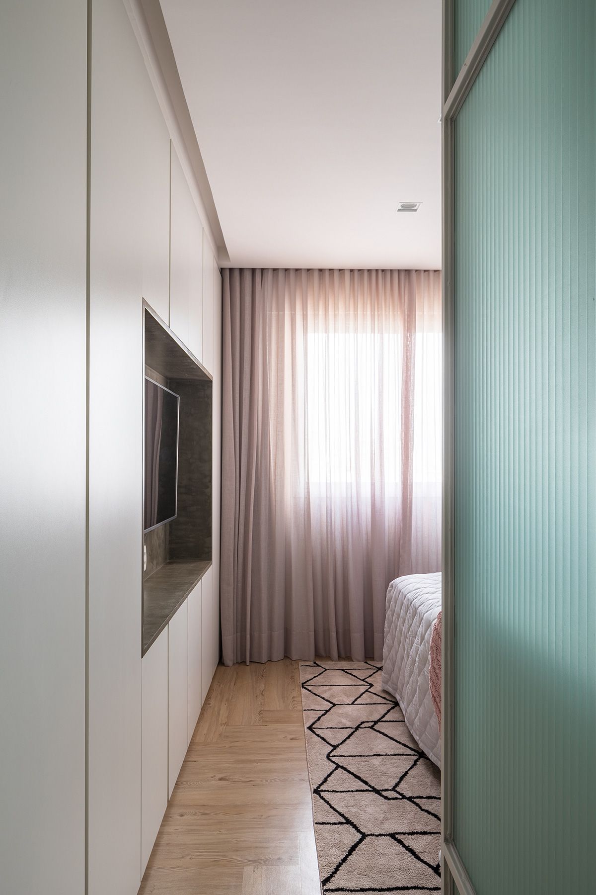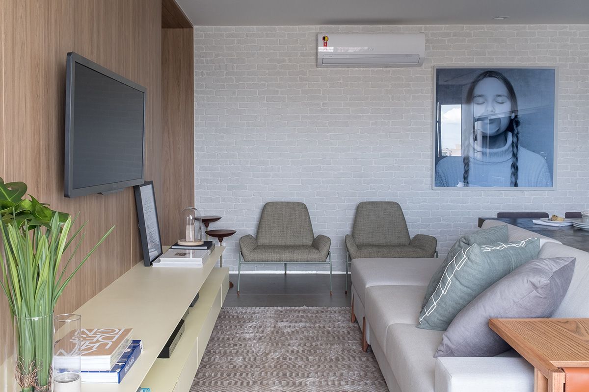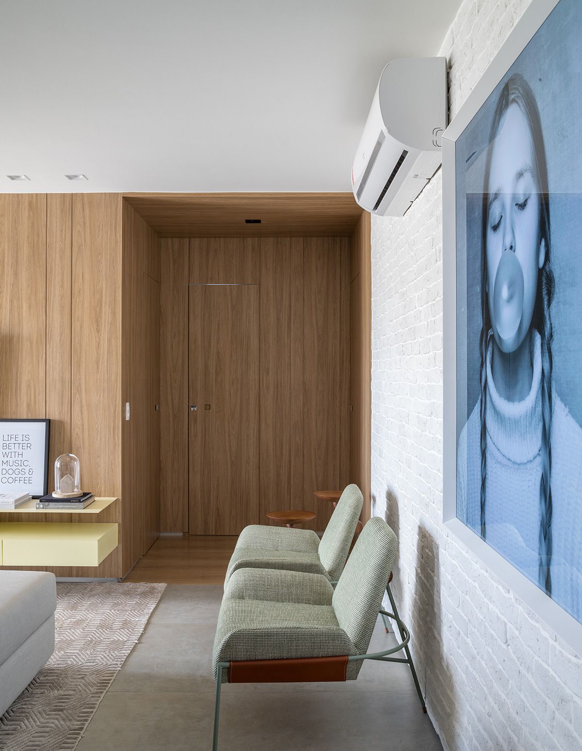 Um jovem casal que acabara de comprar seu primeiro apartamento, pediu às arquitetas do Traama Arquitetura e Design um apartamento mais espaçoso. Para isso, cozinha e sala foram integradas, dando sensação de amplitude em toda área comum, e o pequeno corredor íntimo, foi expandido e transformado em um hall.