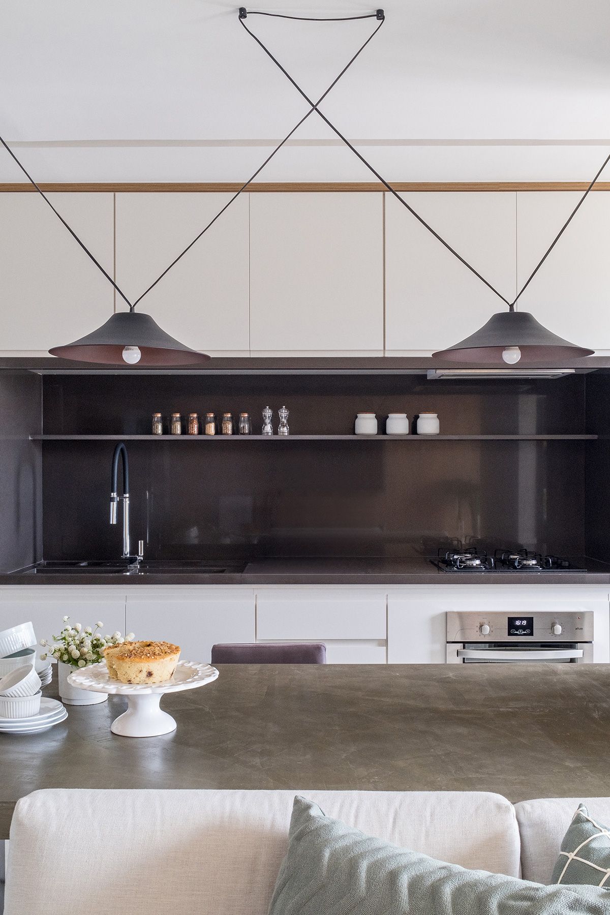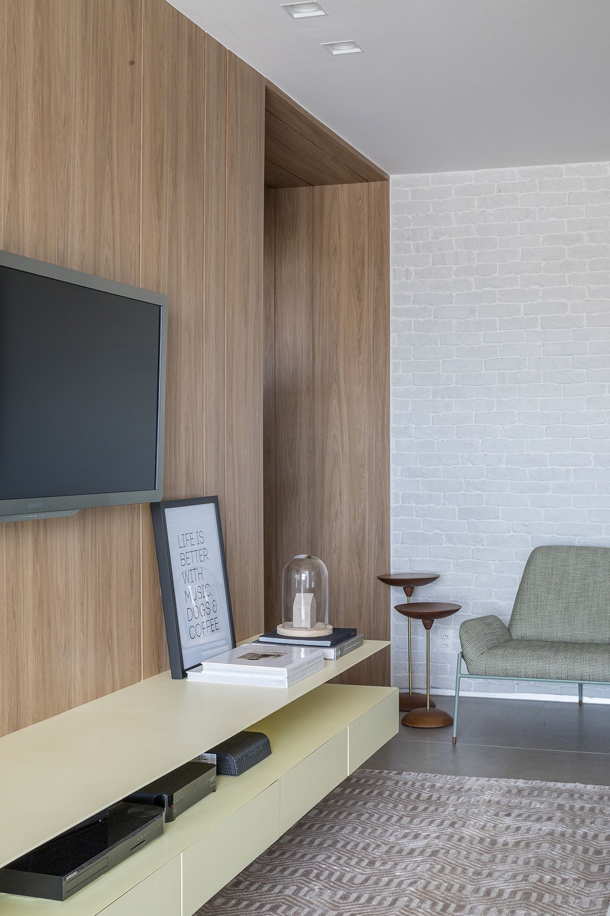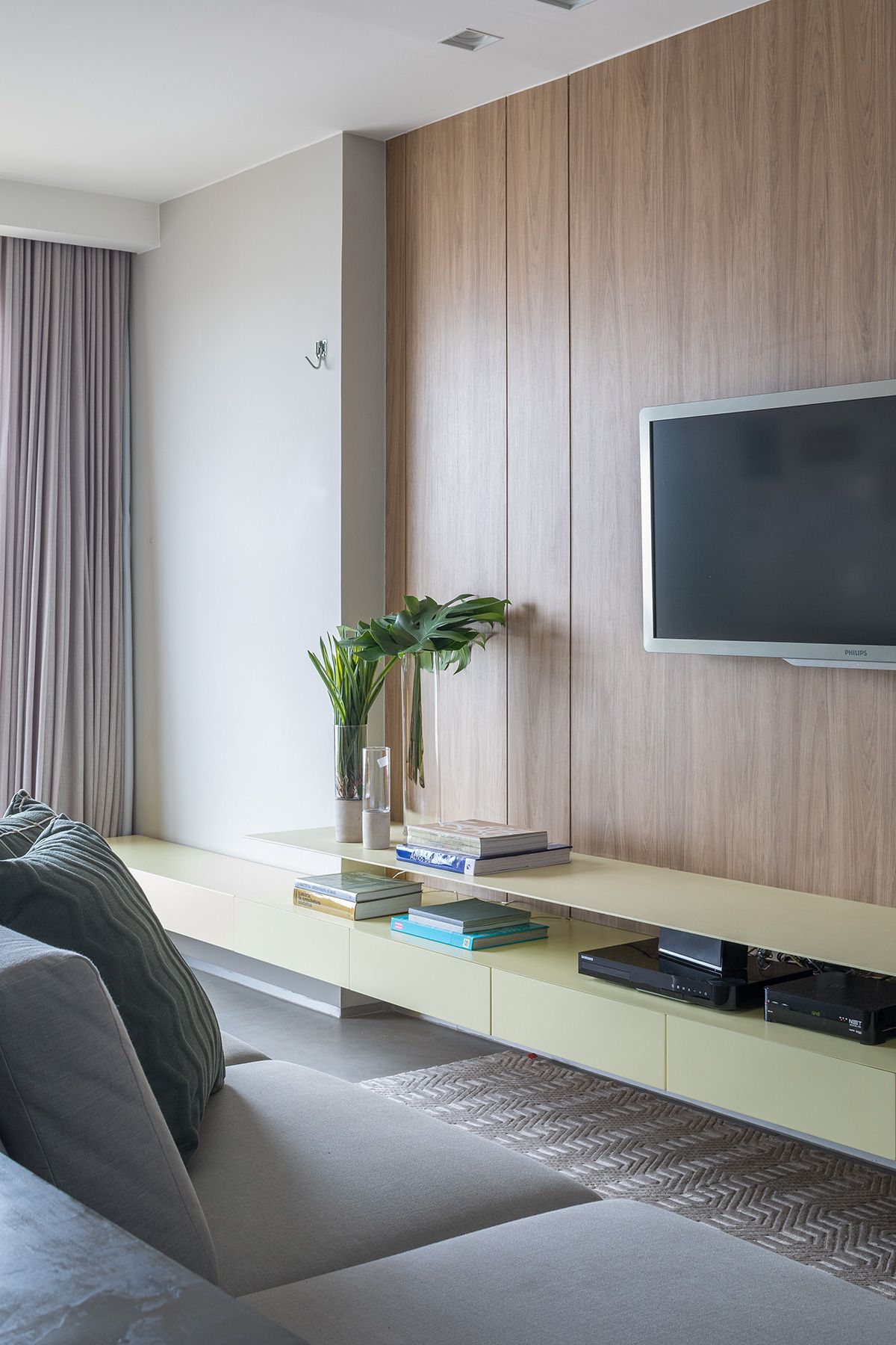 Um jovem casal que acabara de comprar seu primeiro apartamento, pediu às arquitetas do Traama Arquitetura e Design um apartamento mais espaçoso. Para isso, cozinha e sala foram integradas, dando sensação de amplitude em toda área comum, e o pequeno corredor íntimo, foi expandido e transformado em um hall.