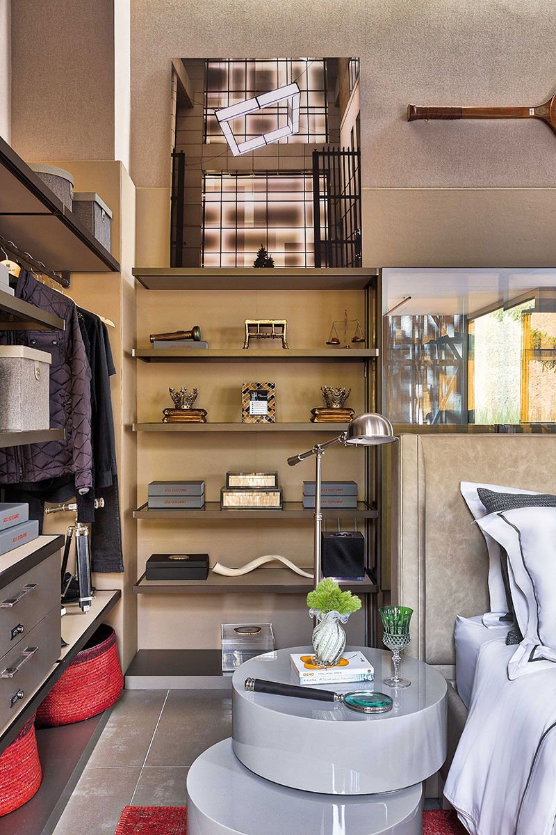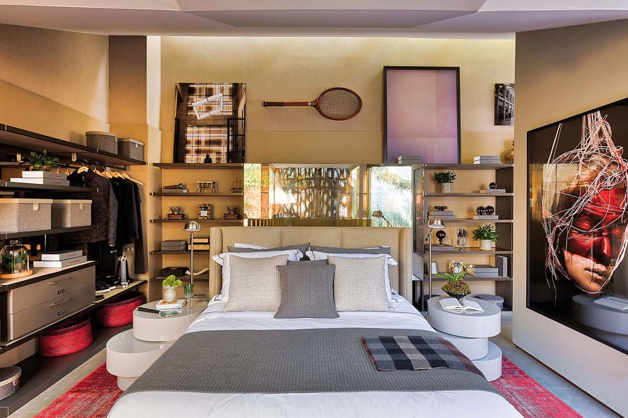 A paleta de cores sóbrias escolhida pelo escritório ganha pontos de cores vibrantes nos detalhes, como o vermelho do tapete sob a cama ladeada pelas mesas laterais, que fazem as vezes de criados-mudos.
