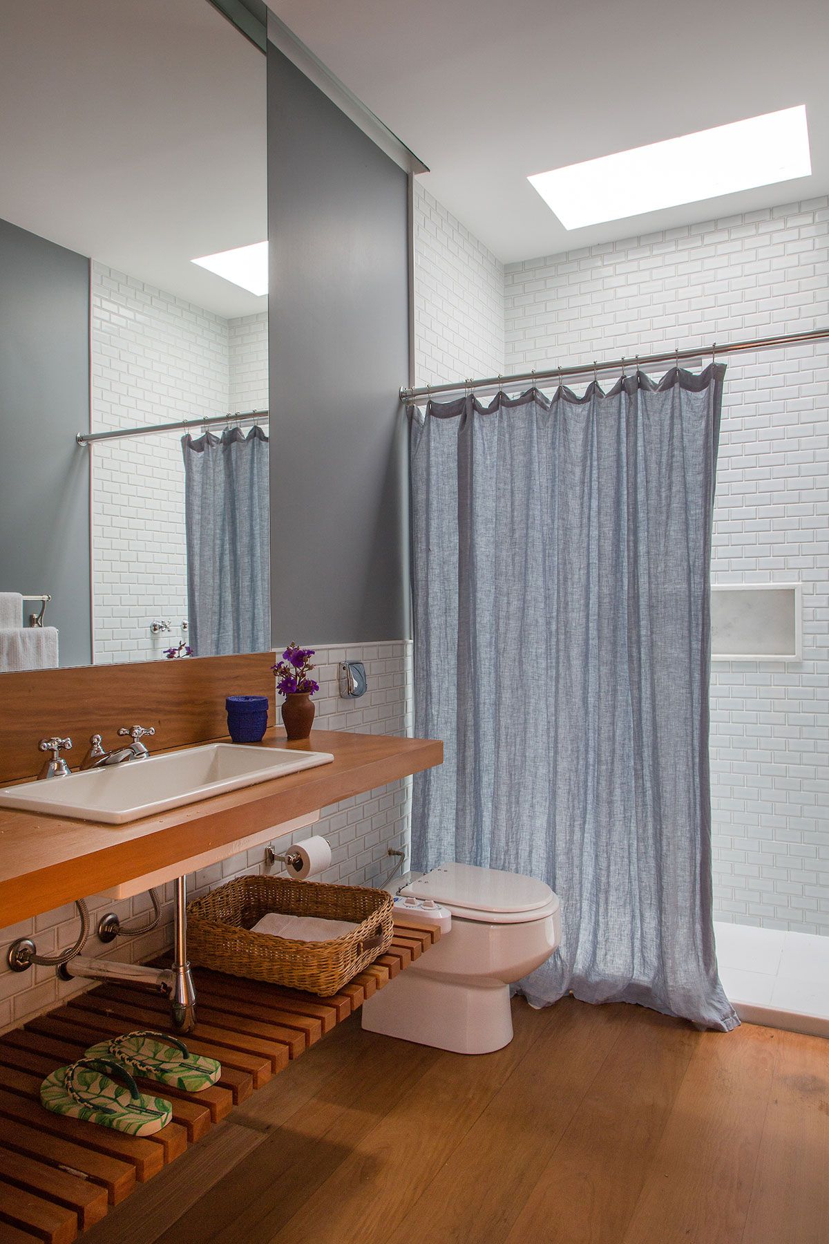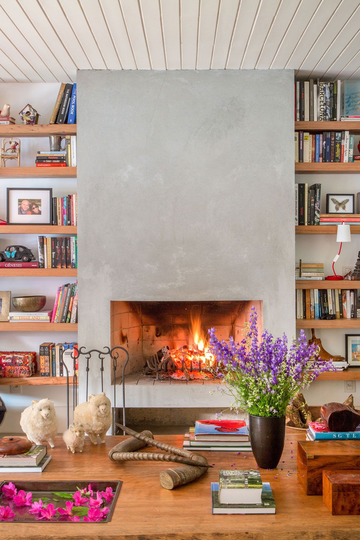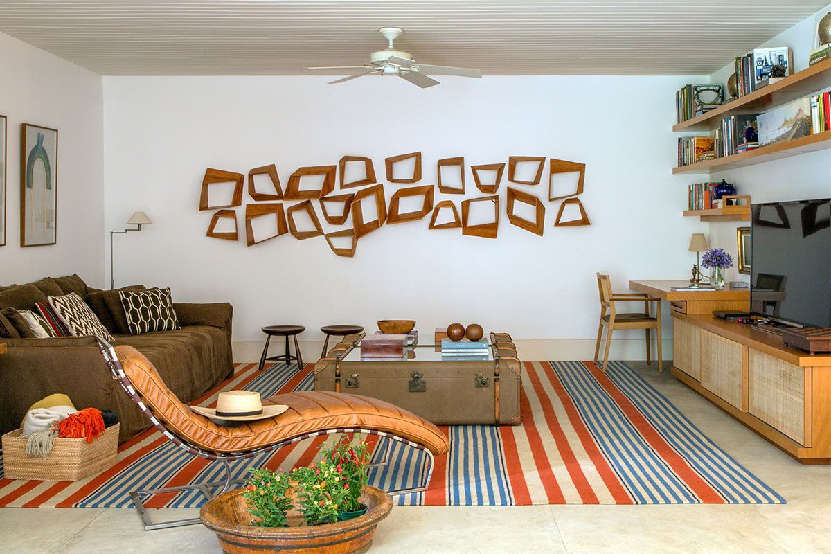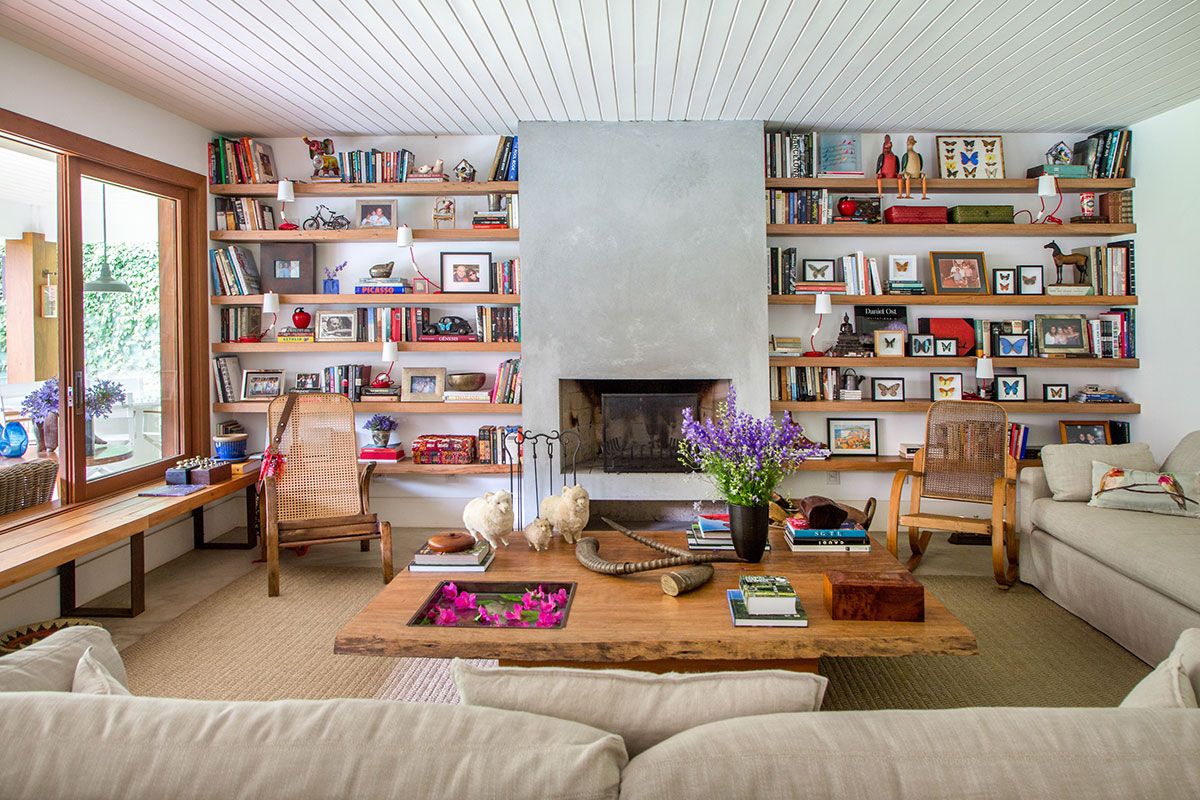 Separada por uma lareira de cimento queimado, a estante da sala foi criada em dois nichos laterais com prateleiras de cumarú maciço, de 7cm, e abriga uma coleção de objetos de viagem. A sala de TV ganhou uma estante em madeira e palhinha que esconde os equipamentos, um enorme sofá de três metros e tapete, feito à mão. Além disso, o lavabo ganhou um jardim e bancada em pedra rústica com uma inclinação imperceptível ao olhar.