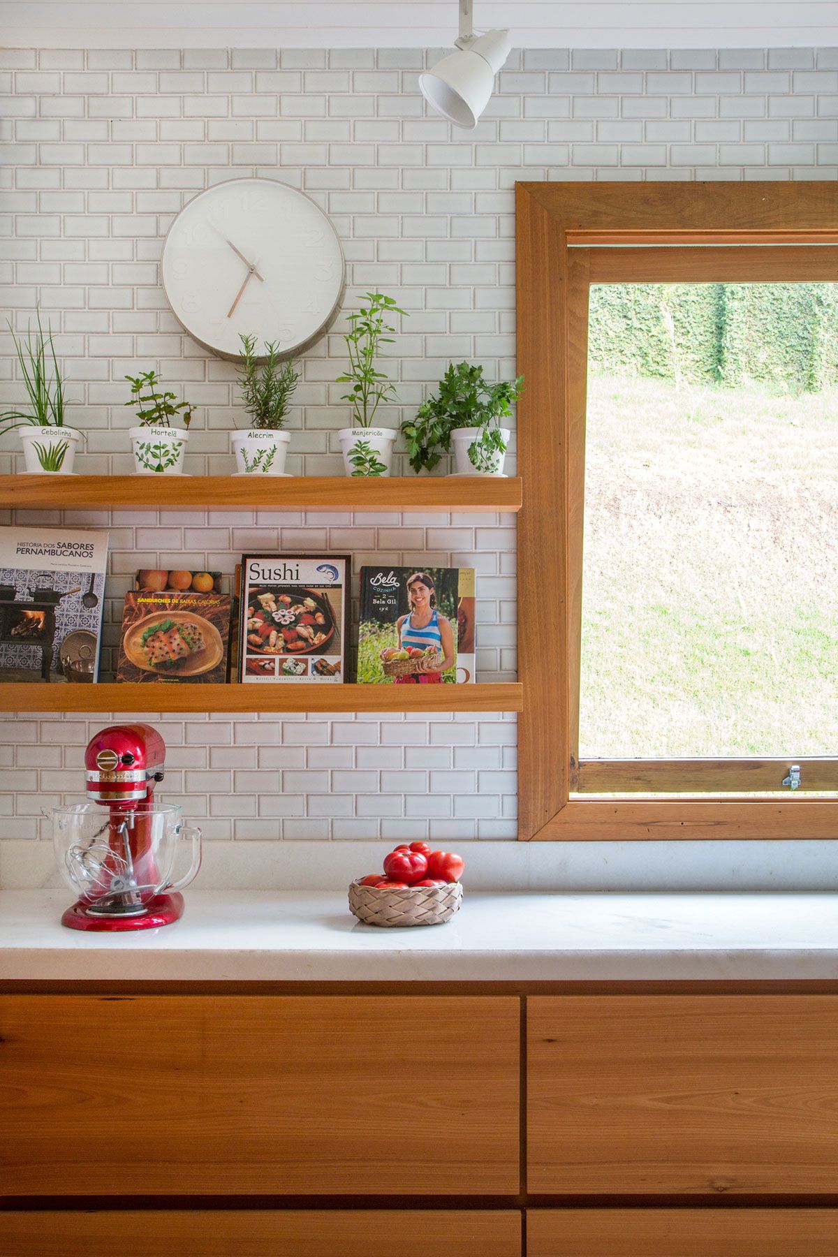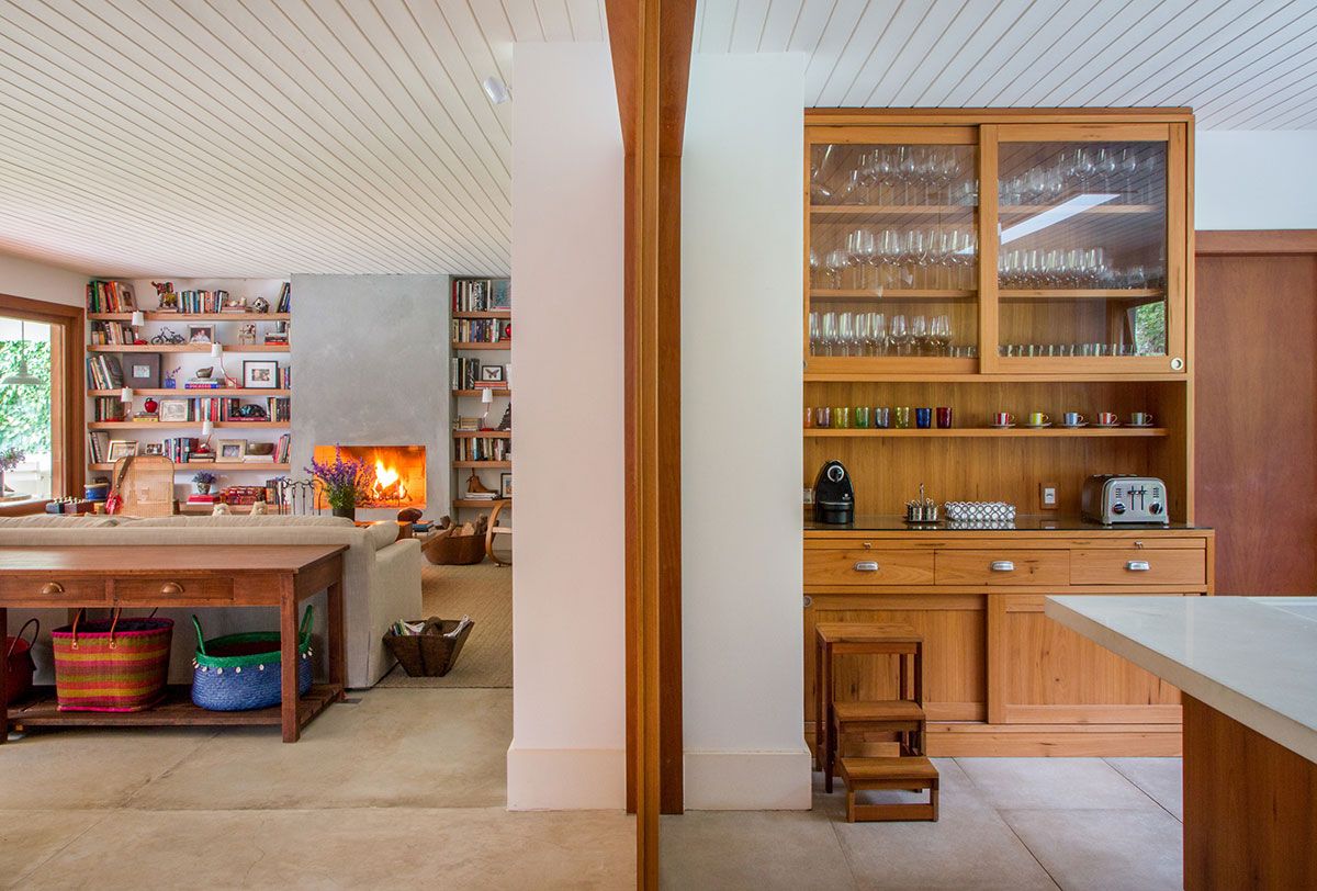 A designer de interiores Lucilla Pessoa de Queiroz criou uma porta que é um misto de porta-camarão retrátil com porta convencional que tem abertura de 180 graus. Isso possibilita que a cozinha fique fechada durante o dia, mas possa ser aberta para que todos possam participar do preparo do jantar.