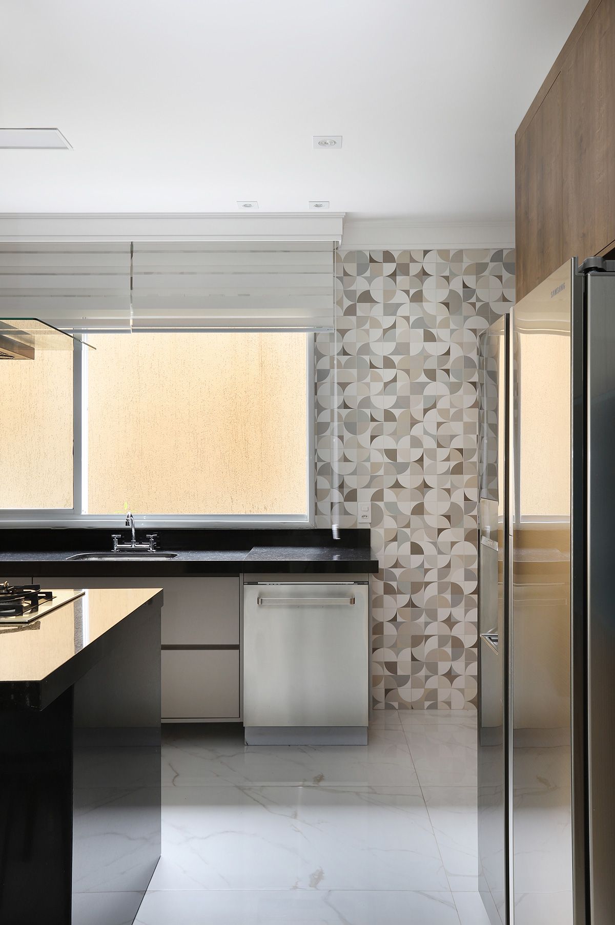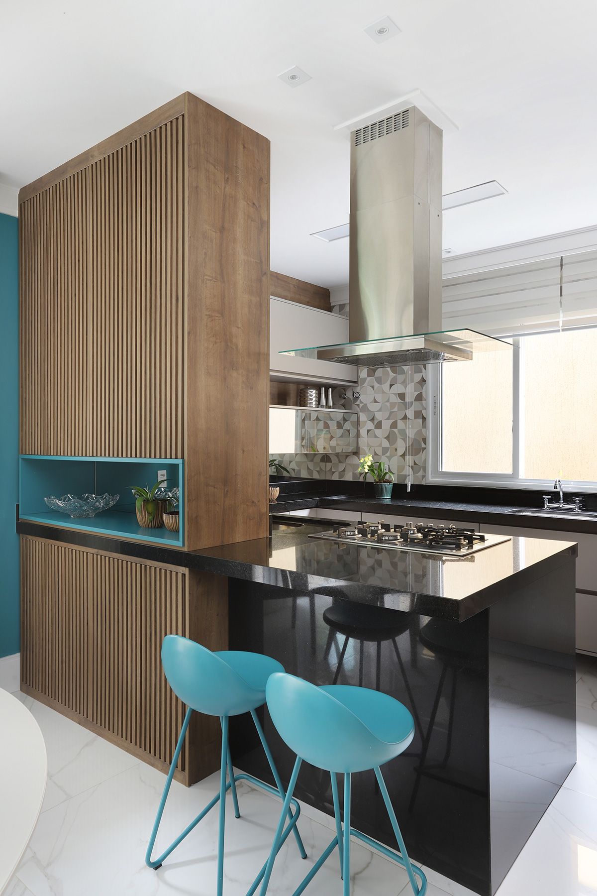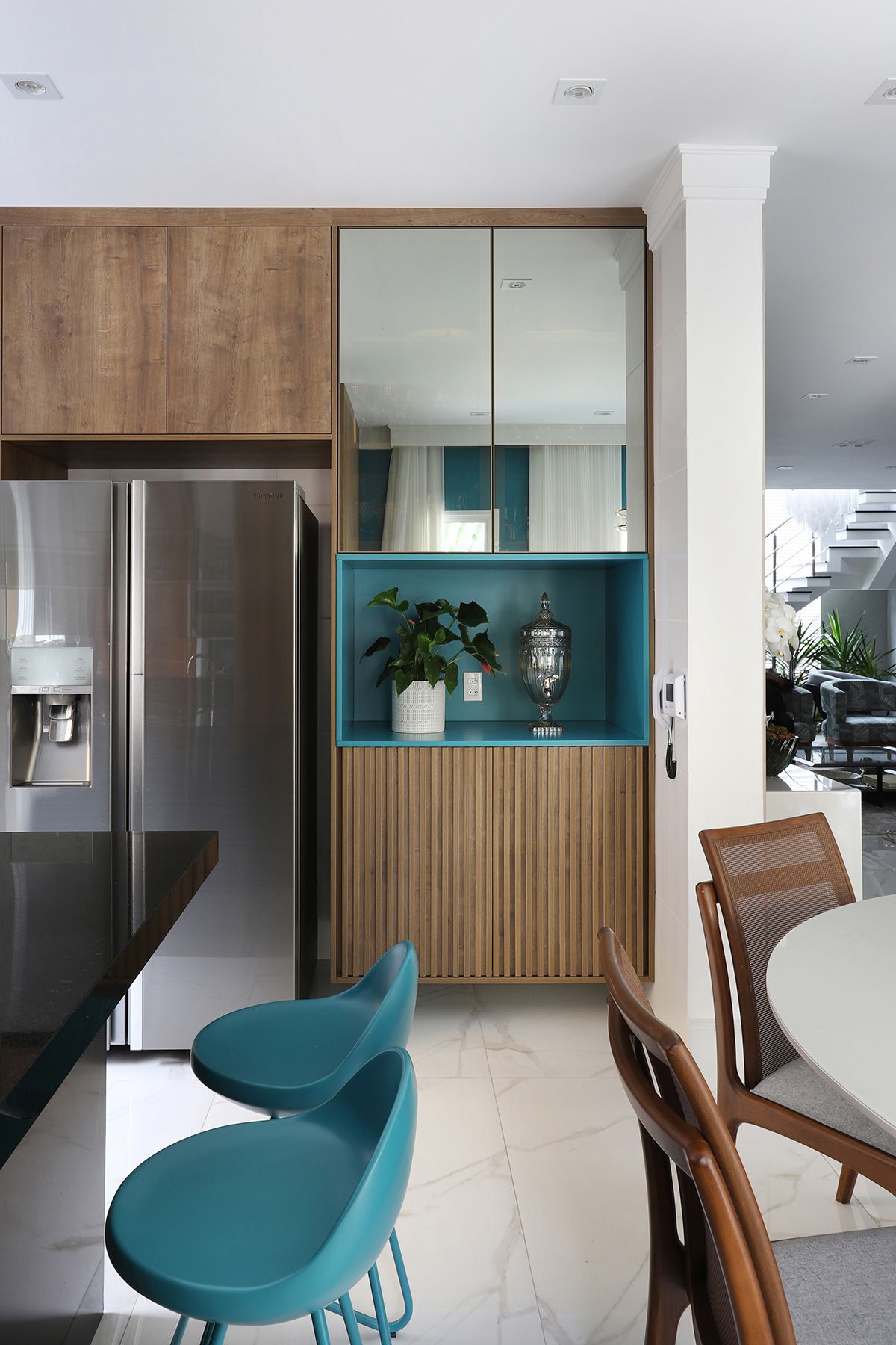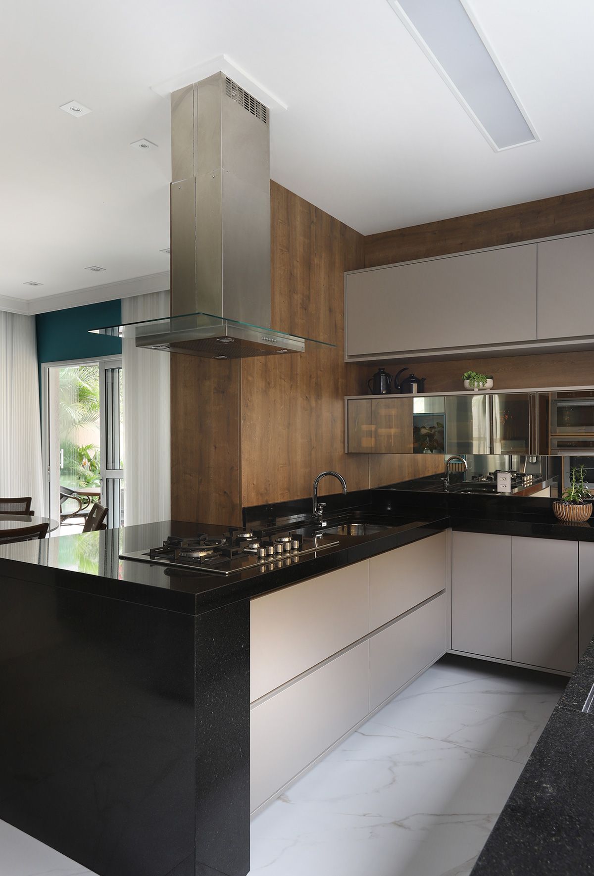 Na cozinha, Elaine manteve a bancada que veio junto com a compra da casa, precisando fazer apenas um complemento para ampliá-la, e todos os armários do cômodo foram feitos sob medida para compor com a peça existente. Um dos pedidos dos clientes era que, ao abrirem as portas do terraço para o quintal, o vão ficasse completamente livre, então a solução foi usar o sistema Division da Silvestre Vidros, que não possui trilho inferior e as portas recolhem tipo sanfona, permitindo uma integração entre área interna e externa com discrição.