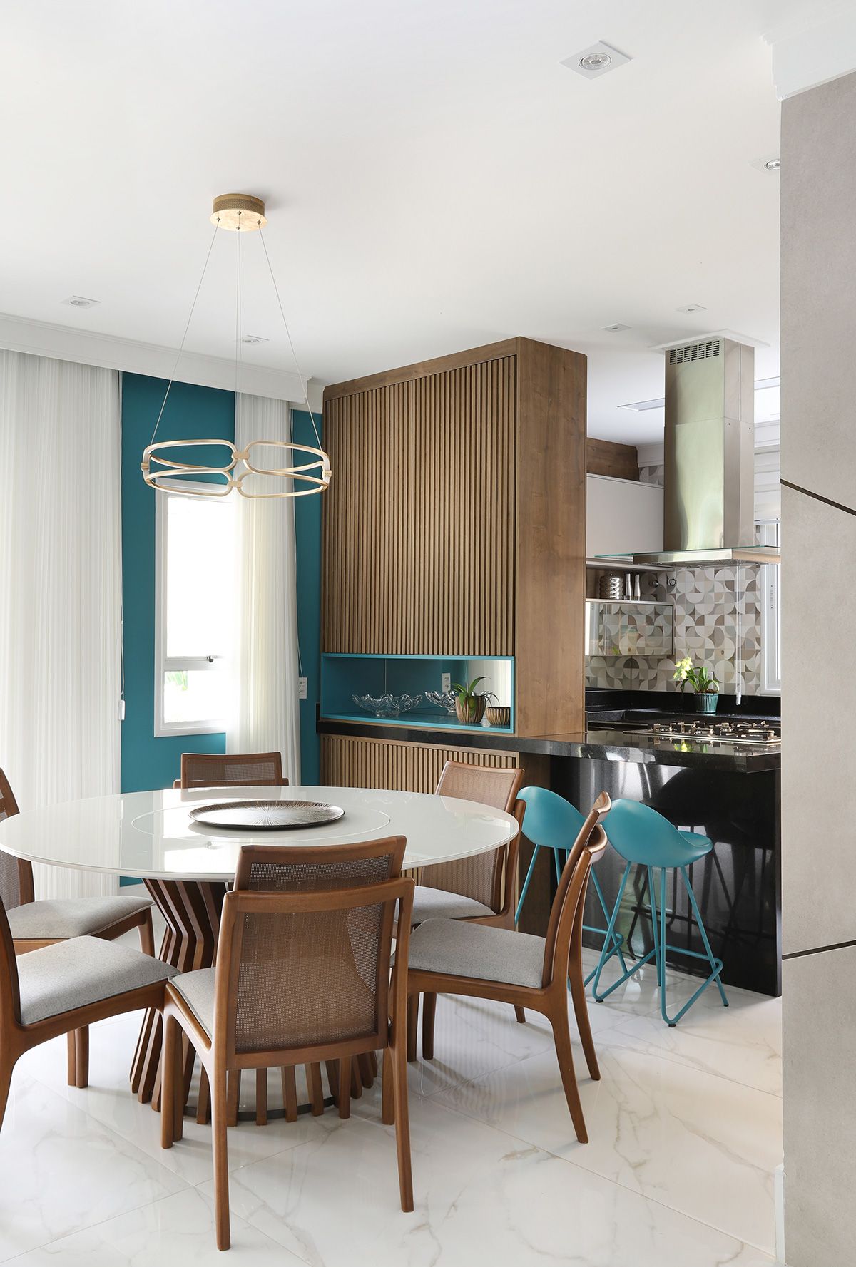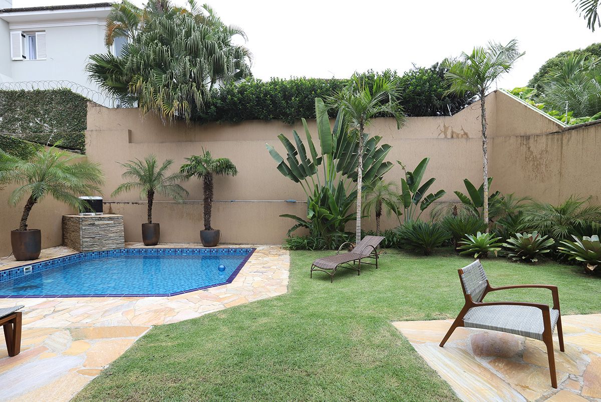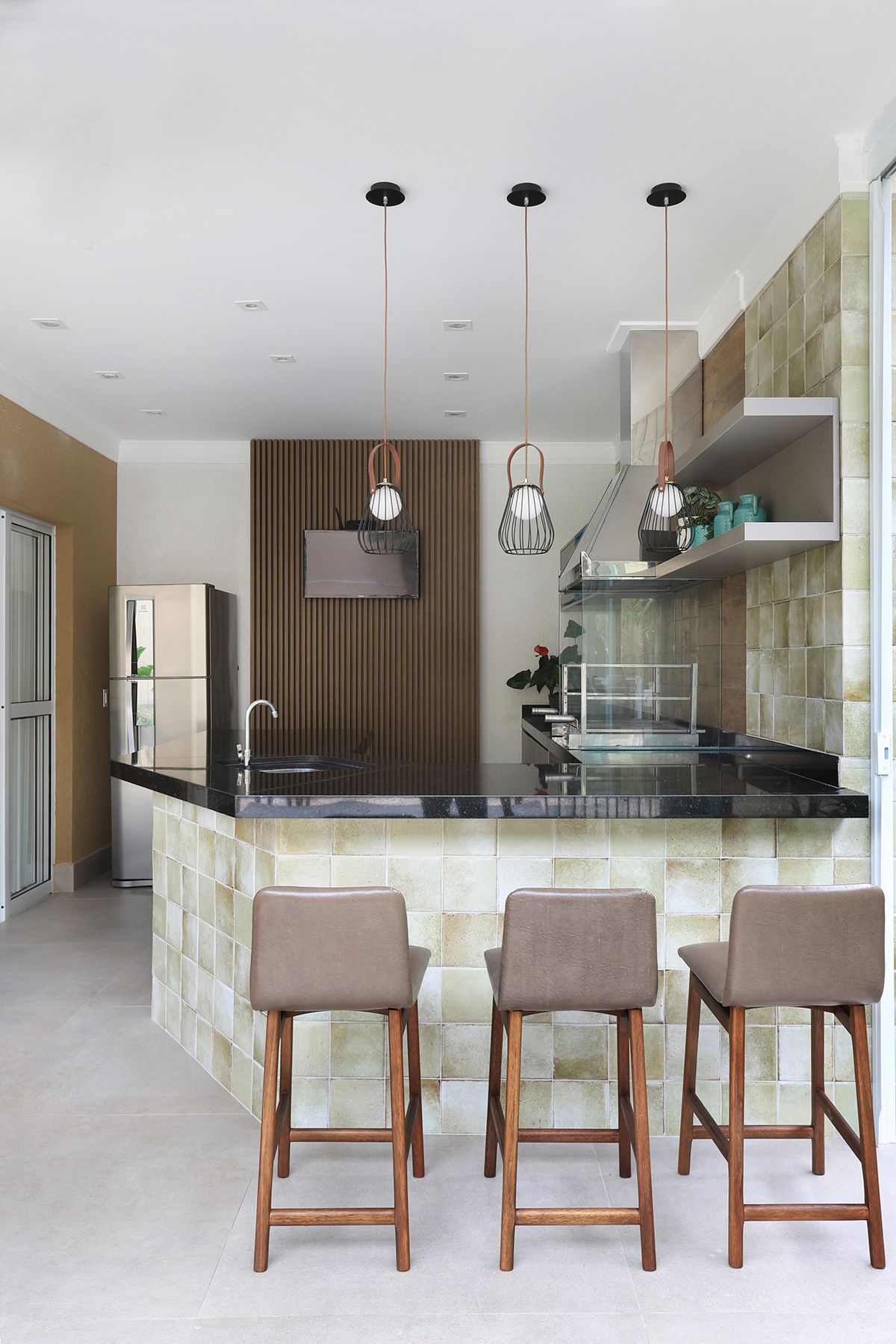 Na cozinha, Elaine manteve a bancada que veio junto com a compra da casa, precisando fazer apenas um complemento para ampliá-la, e todos os armários do cômodo foram feitos sob medida para compor com a peça existente. Um dos pedidos dos clientes era que, ao abrirem as portas do terraço para o quintal, o vão ficasse completamente livre, então a solução foi usar o sistema Division da Silvestre Vidros, que não possui trilho inferior e as portas recolhem tipo sanfona, permitindo uma integração entre área interna e externa com discrição.
