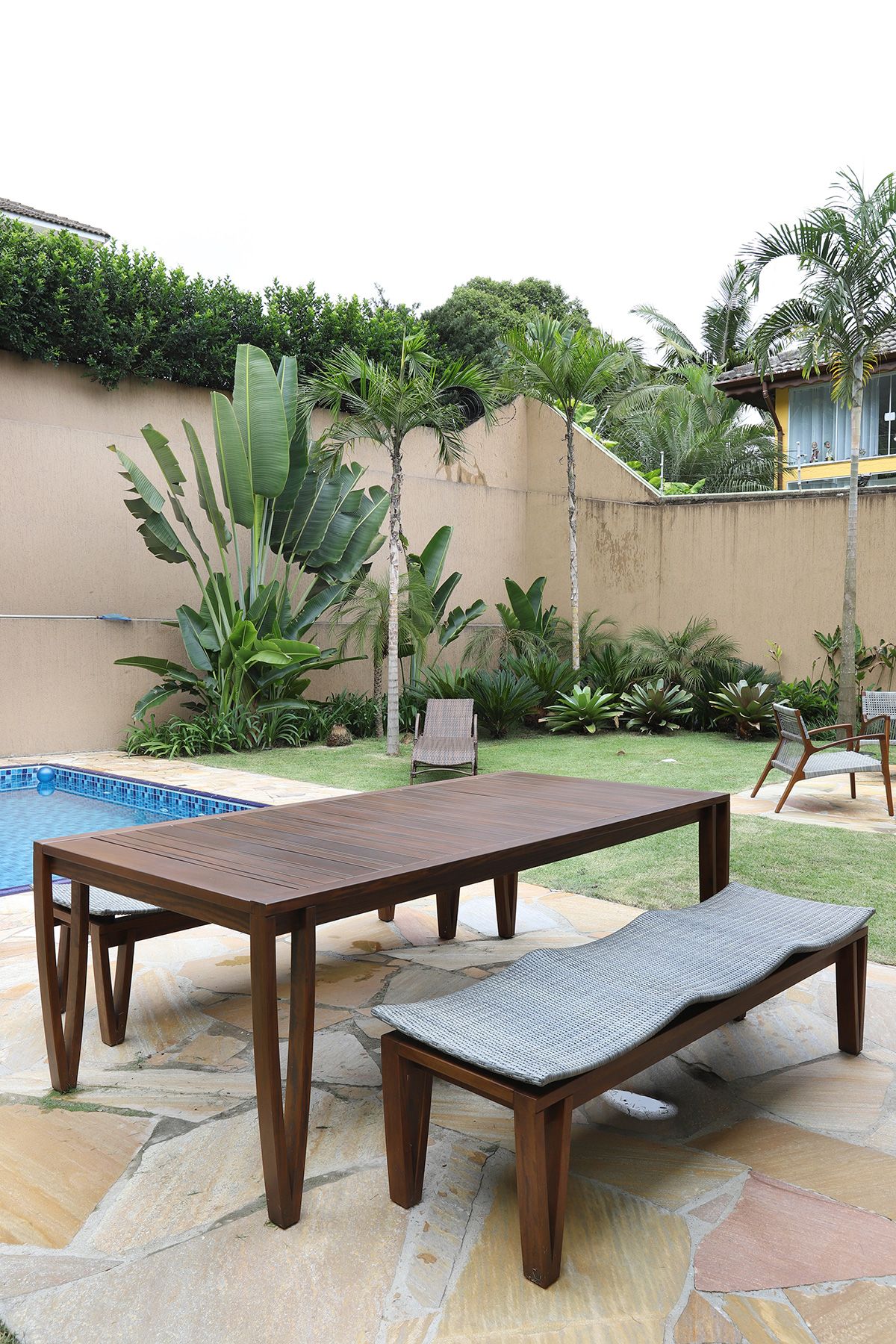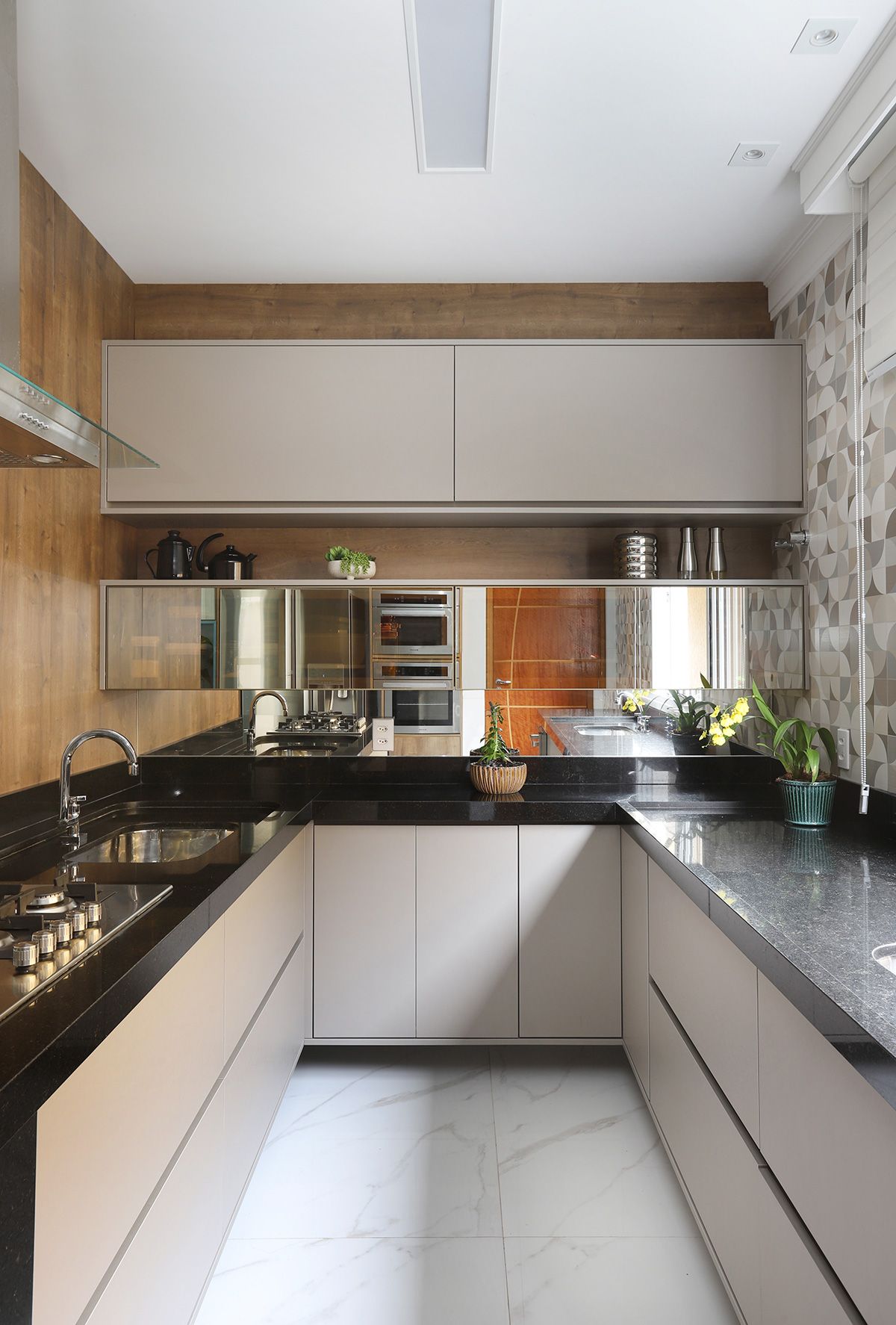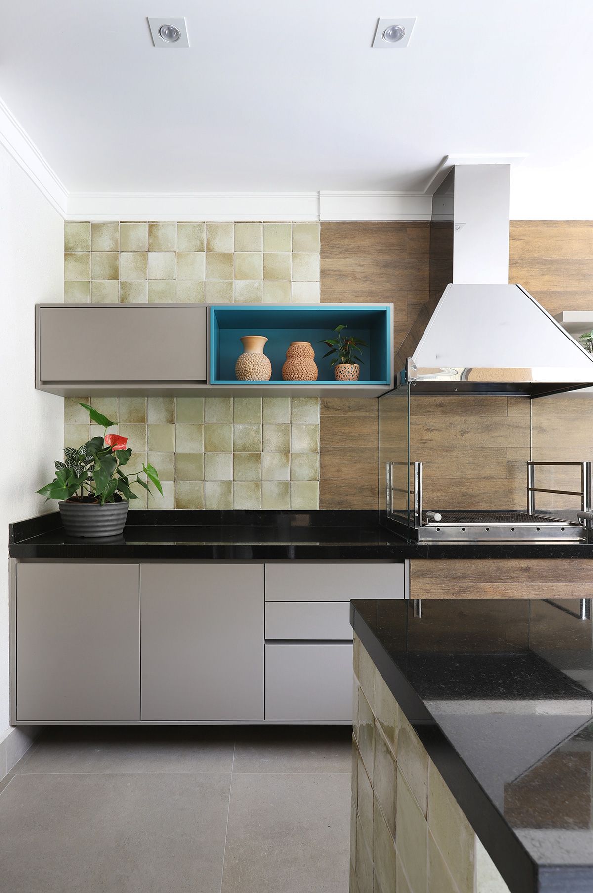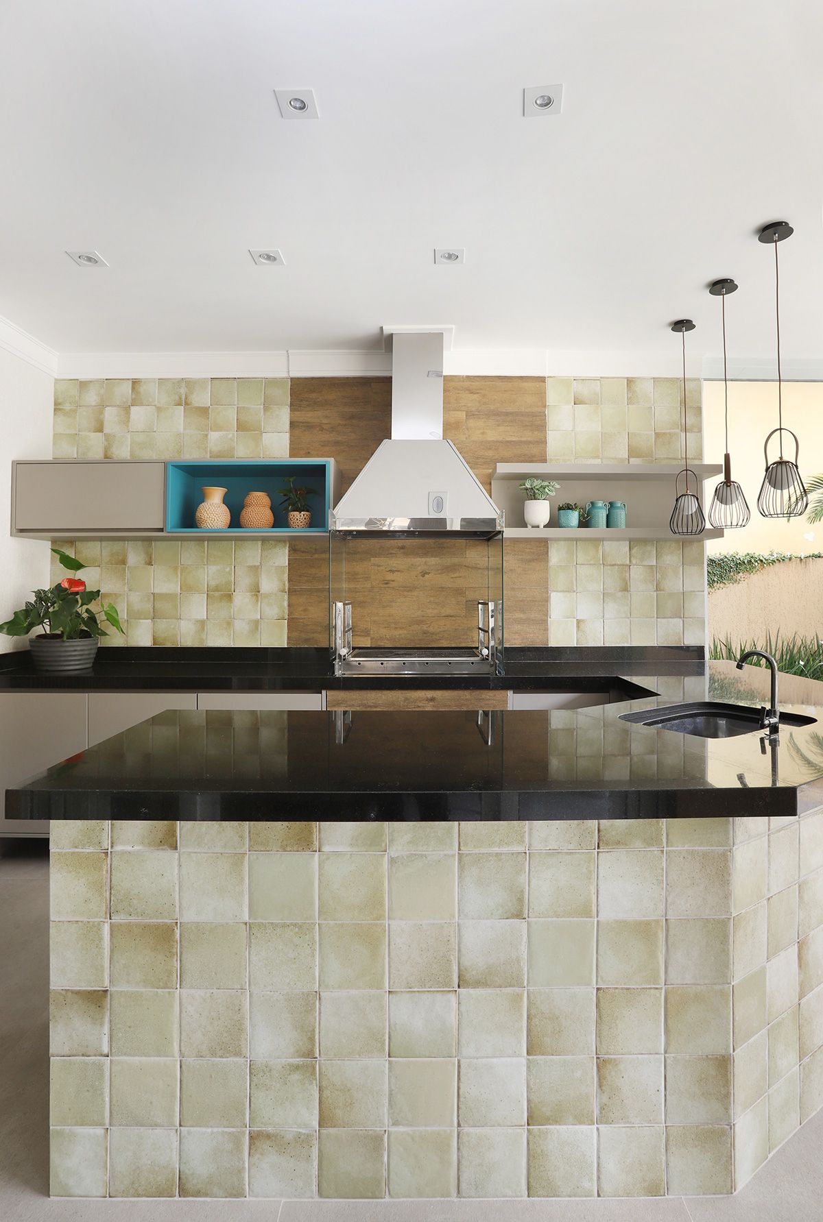 Na cozinha, Elaine manteve a bancada que veio junto com a compra da casa, precisando fazer apenas um complemento para ampliá-la, e todos os armários do cômodo foram feitos sob medida para compor com a peça existente. Um dos pedidos dos clientes era que, ao abrirem as portas do terraço para o quintal, o vão ficasse completamente livre, então a solução foi usar o sistema Division da Silvestre Vidros, que não possui trilho inferior e as portas recolhem tipo sanfona, permitindo uma integração entre área interna e externa com discrição.