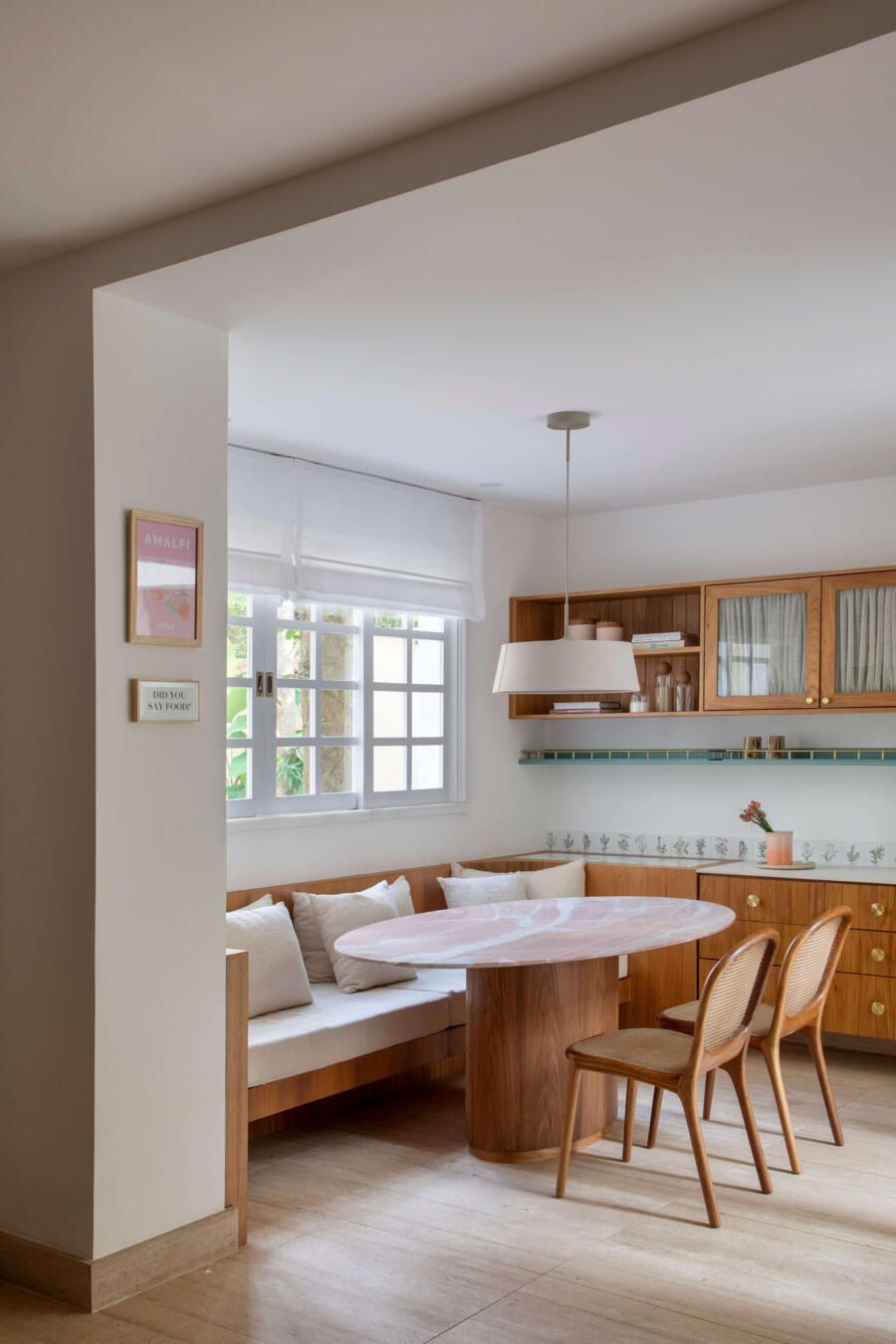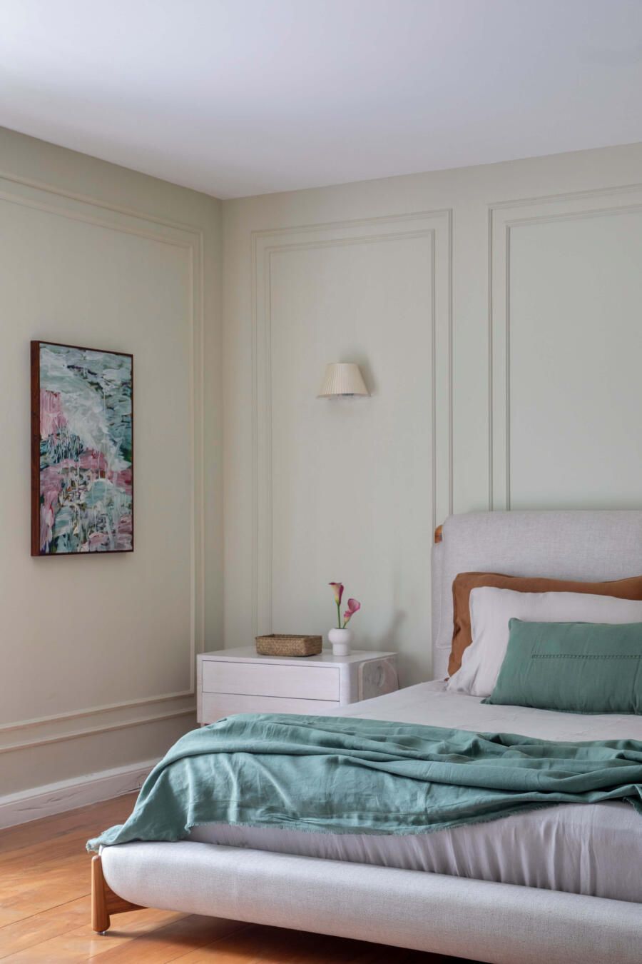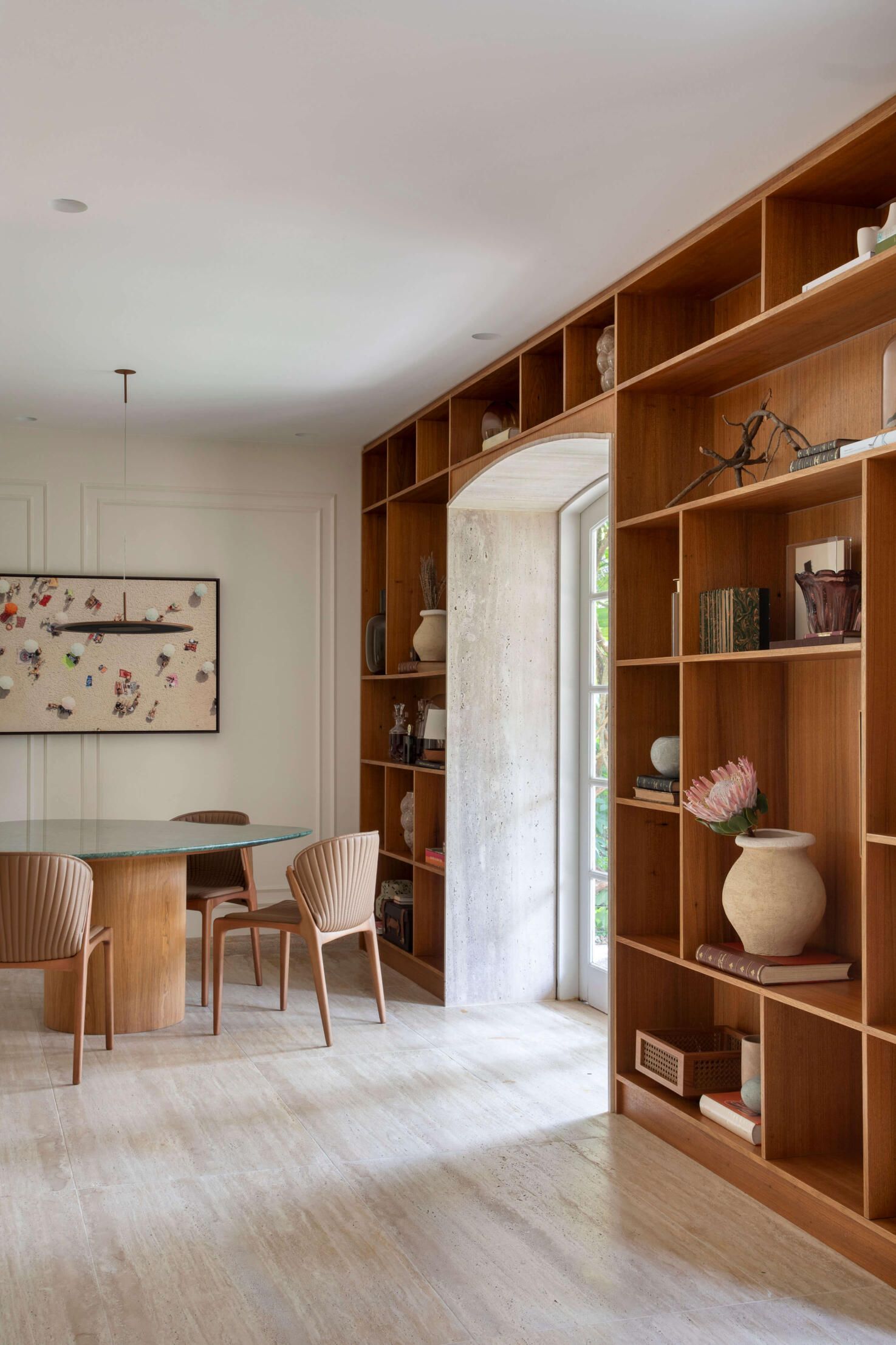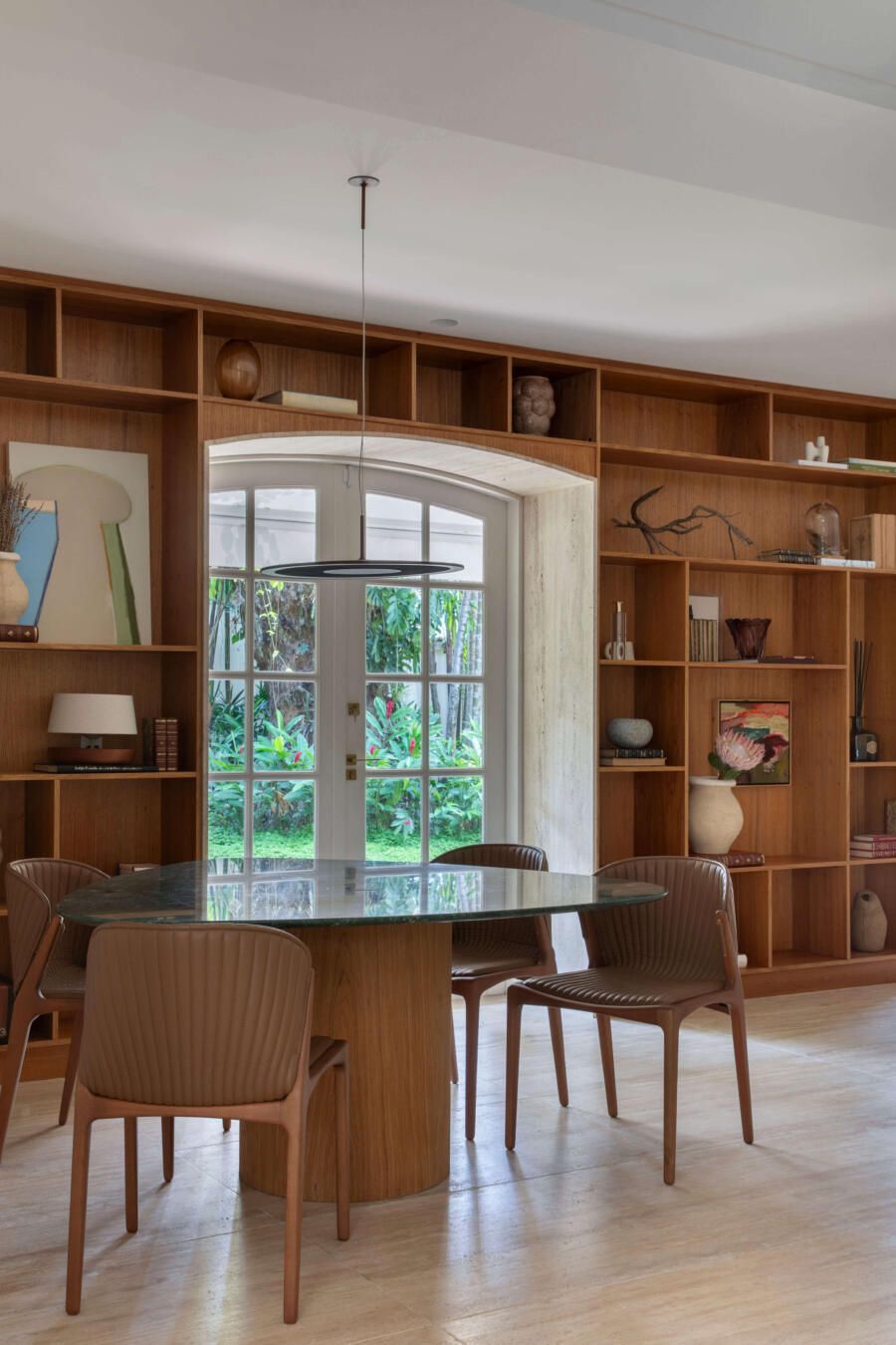 Alguns elementos originais foram cuidadosamente mantidos, como o piso de mármore travertino e o desenho do piso da sala de jantar, em mármore polido com detalhes em cabochon. Por outro lado, as boiseries existentes deram lugar a molduras contemporâneas: simétricas, duplas e mais retas, criando um mix harmonioso entre o clássico e o moderno. Já o piso em peroba do campo foi restaurado na área íntima, enquanto o freijó foi escolhido para a nova marcenaria. No lavabo, o trio de arquitetas explorou um tom mais ousado com o uso de mármore azul esverdeado no piso, rodapé e bancada suspensa.