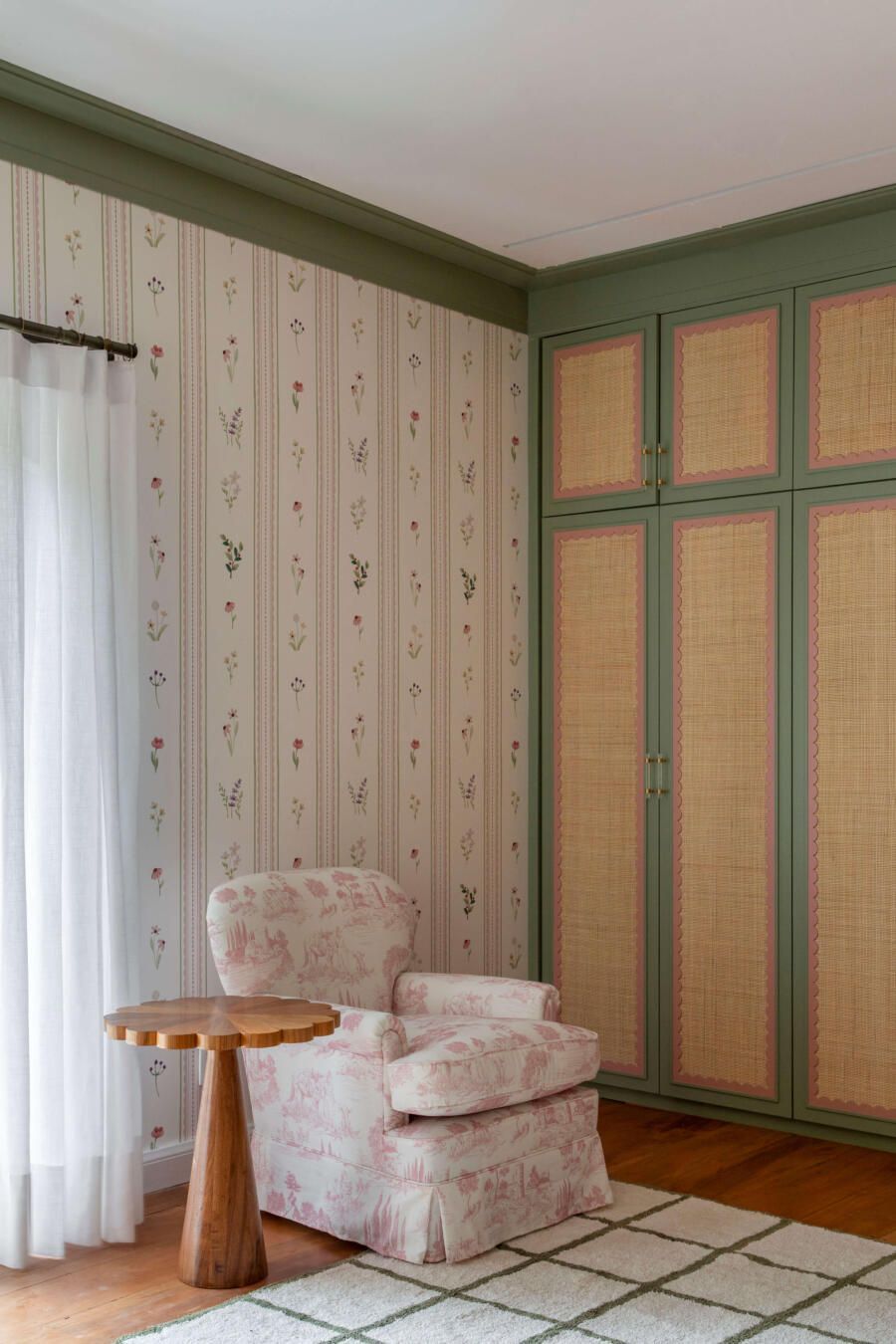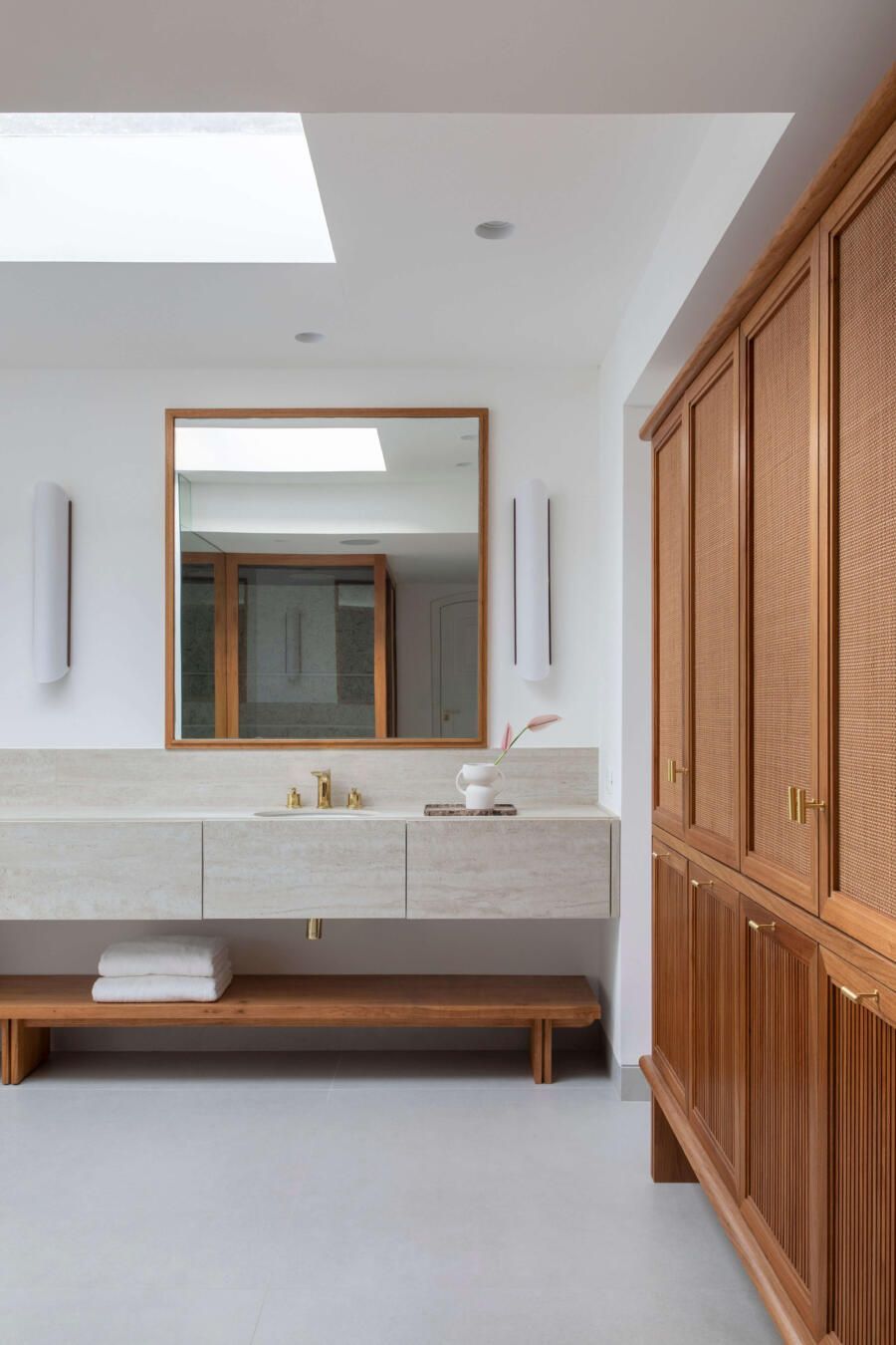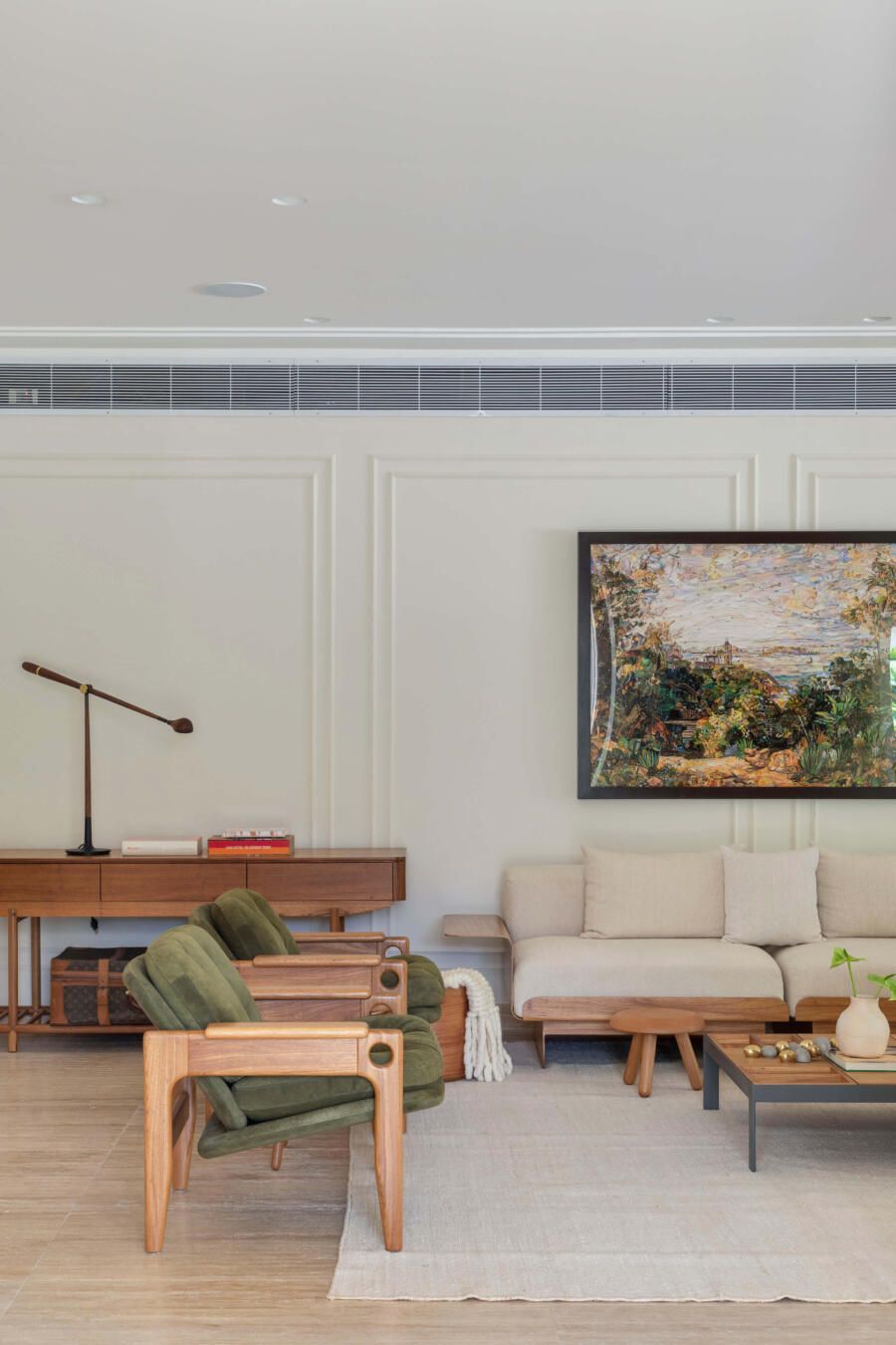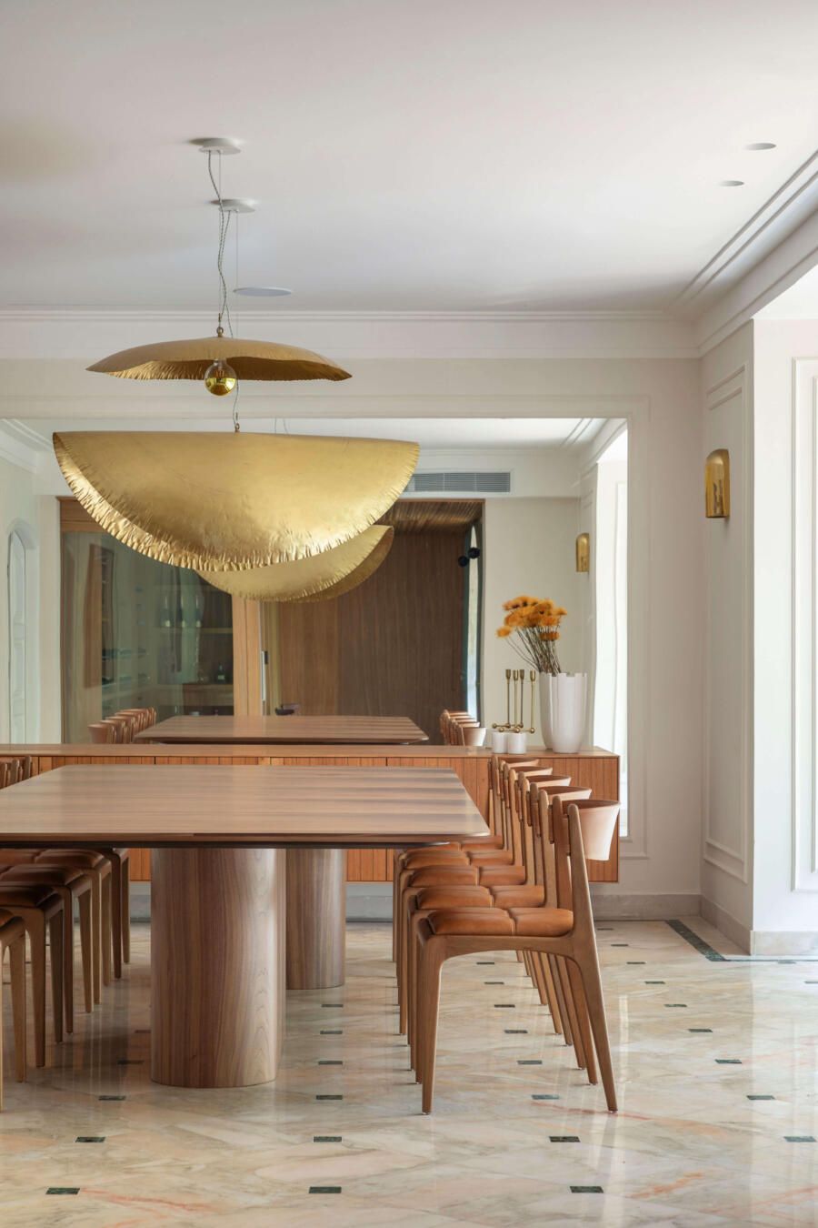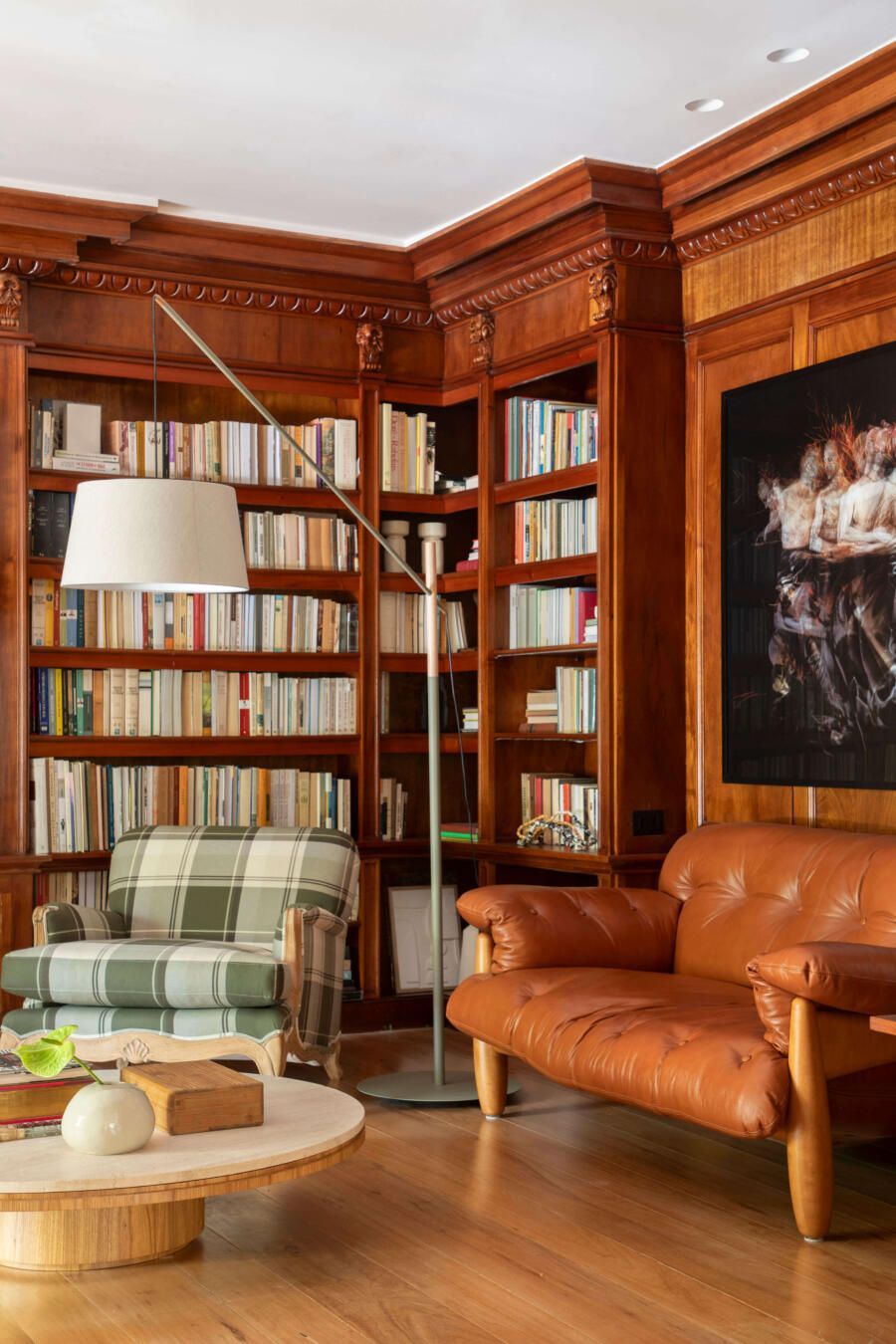 Alguns elementos originais foram cuidadosamente mantidos, como o piso de mármore travertino e o desenho do piso da sala de jantar, em mármore polido com detalhes em cabochon. Por outro lado, as boiseries existentes deram lugar a molduras contemporâneas: simétricas, duplas e mais retas, criando um mix harmonioso entre o clássico e o moderno. Já o piso em peroba do campo foi restaurado na área íntima, enquanto o freijó foi escolhido para a nova marcenaria. No lavabo, o trio de arquitetas explorou um tom mais ousado com o uso de mármore azul esverdeado no piso, rodapé e bancada suspensa.