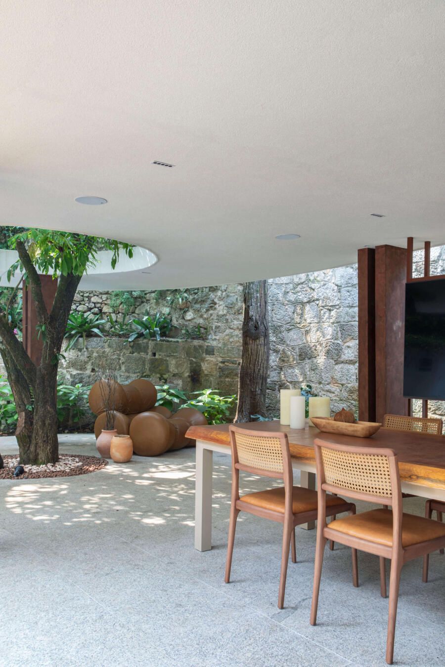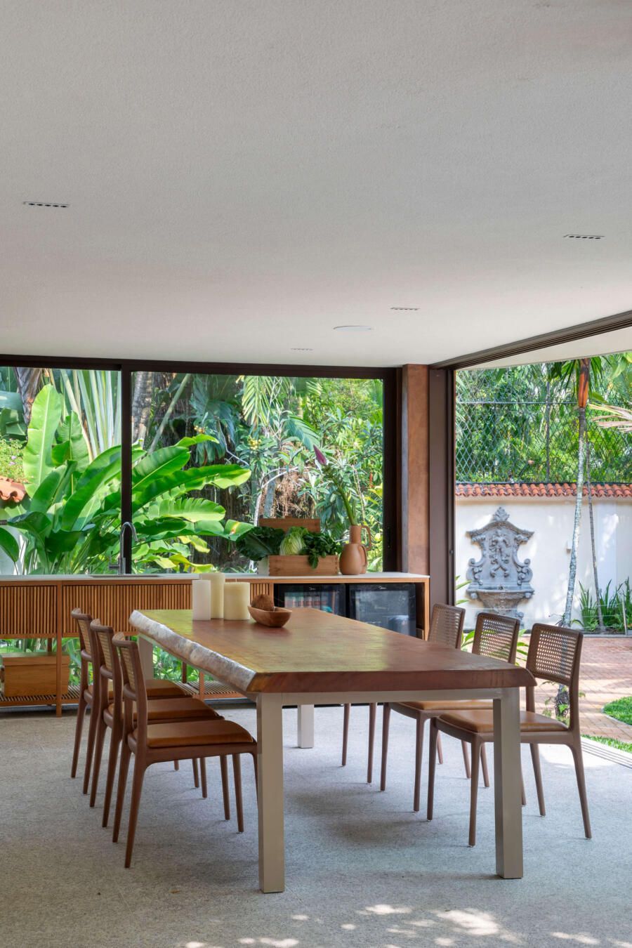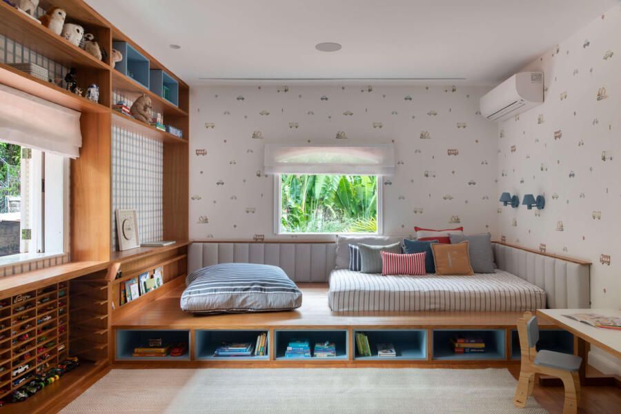 O layout foi repensado para atender melhor às necessidades da família. No térreo, as conexões entre a cozinha e a sala foram ampliadas, enquanto no primeiro andar, dois quartos deram lugar a uma espaçosa sala íntima conectada à brinquedoteca. A maior transformação ocorreu no último pavimento, onde duas suítes e uma sala íntima foram reorganizadas para acomodar mais uma suíte, concentrando os quartos da família nesse andar.