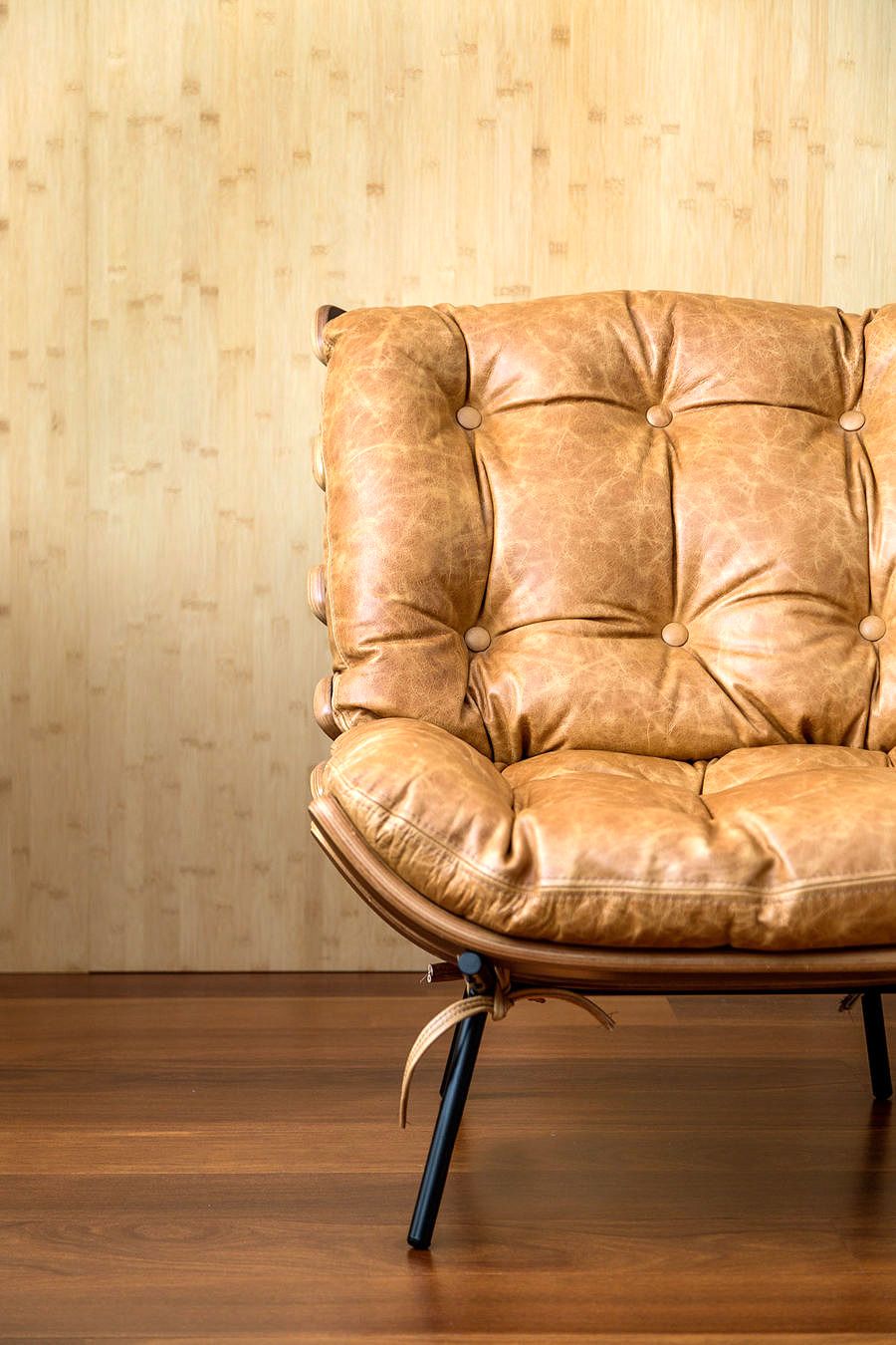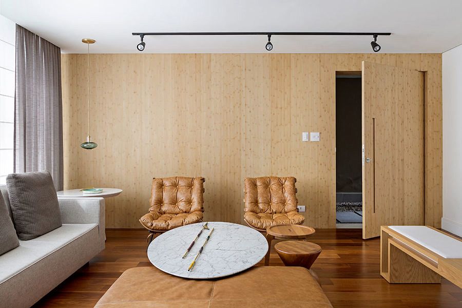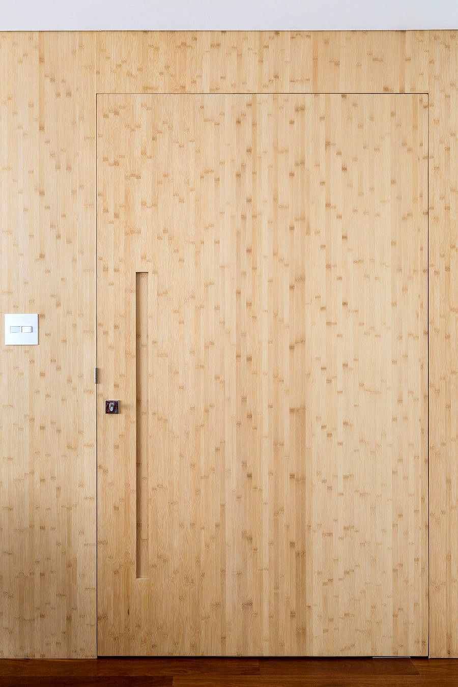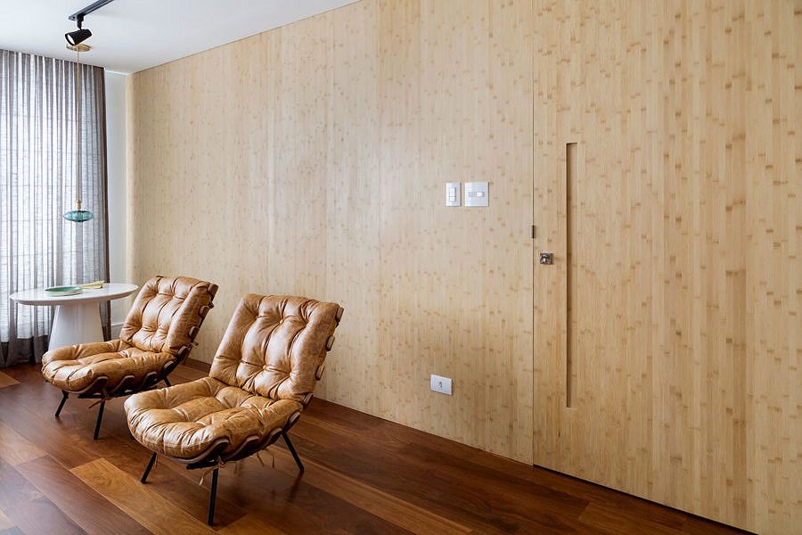 Para encaixar no projeto o painel de pinus, foi trocada a porta de entrada da sala por uma porta pivotante de 1.40m de largura com uma cava muito discreta para não interromper a linearidade do painel e revestir toda a parede à esquerda da porta, com folha de bambu clareado, na mesma tonalidade do pinus.