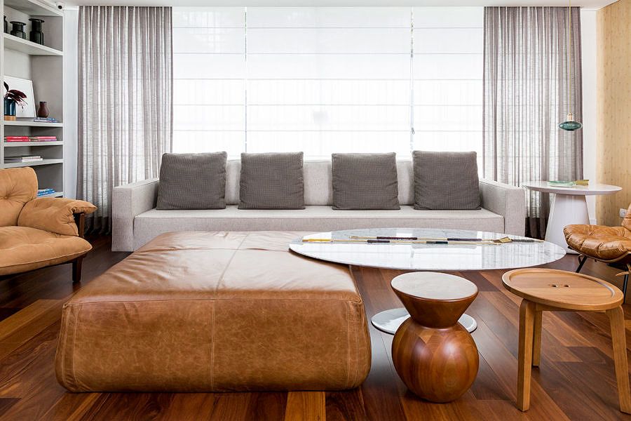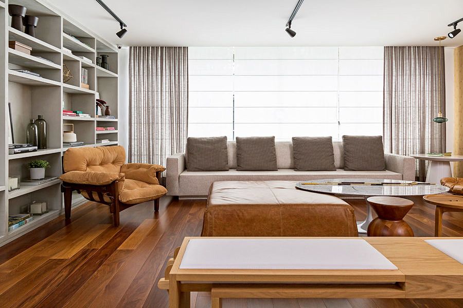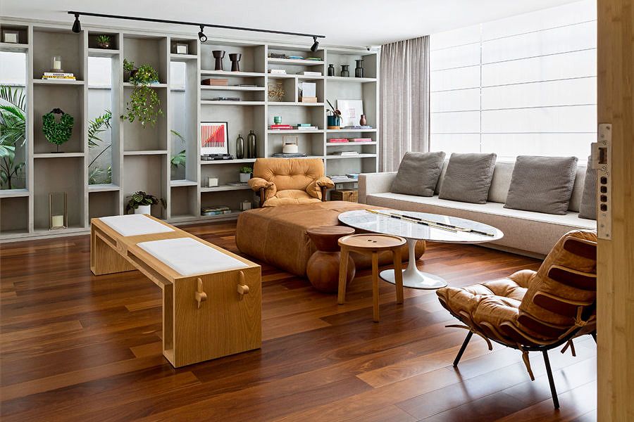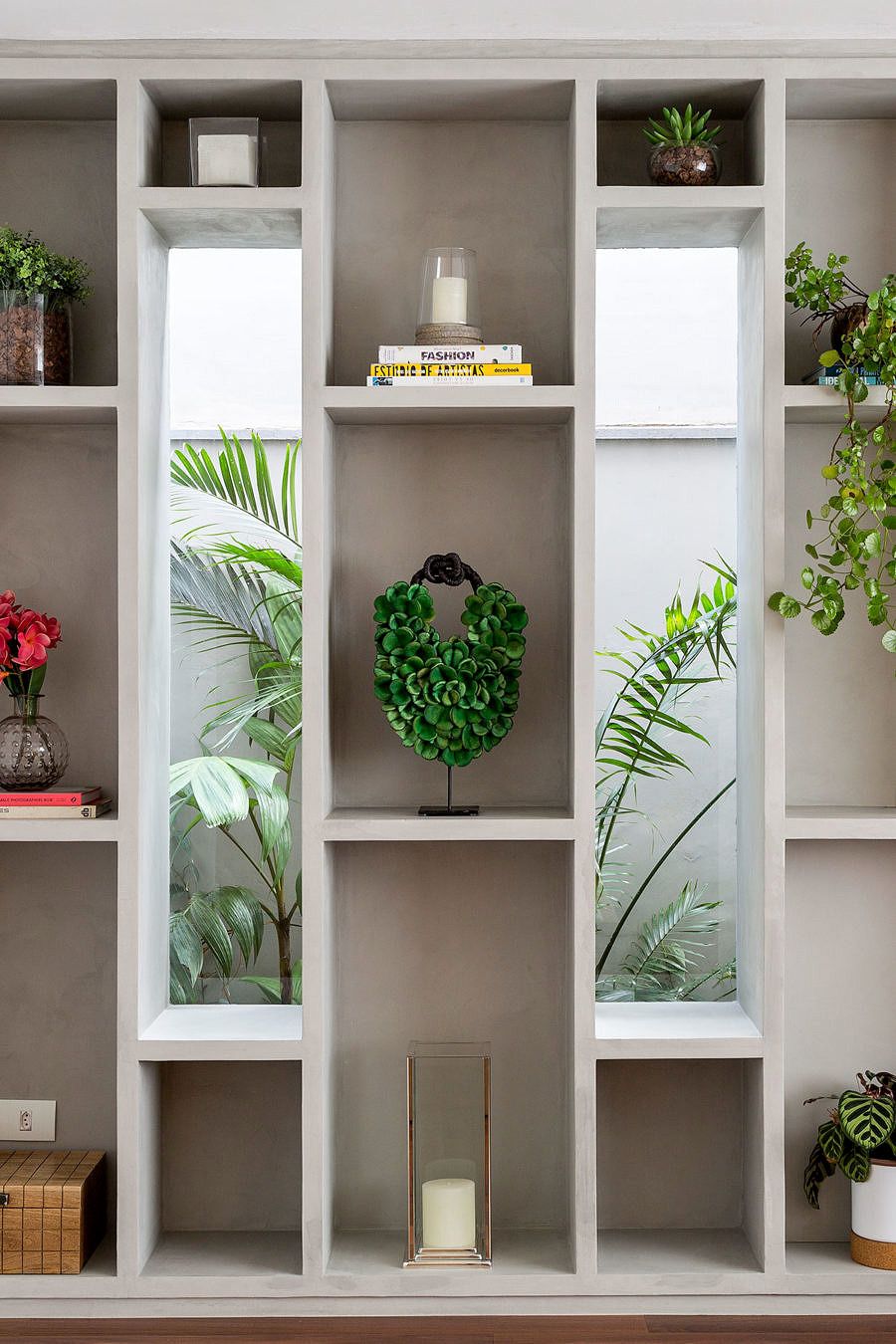 Assim o “foco” mudou para o sofá, colocado de costas para a janela, de ponta a ponta da sala sem perder espaço com circulações atrás dele. O segundo desafio, a estante tomando toda uma parede, foi solucionado quando o escritório indicou que a estante tivesse nichos irregulares, dessa forma as 3 pequenas janelas verticais existentes em uma lateral da sala foram incorporadas como se fossem nichos verdes.