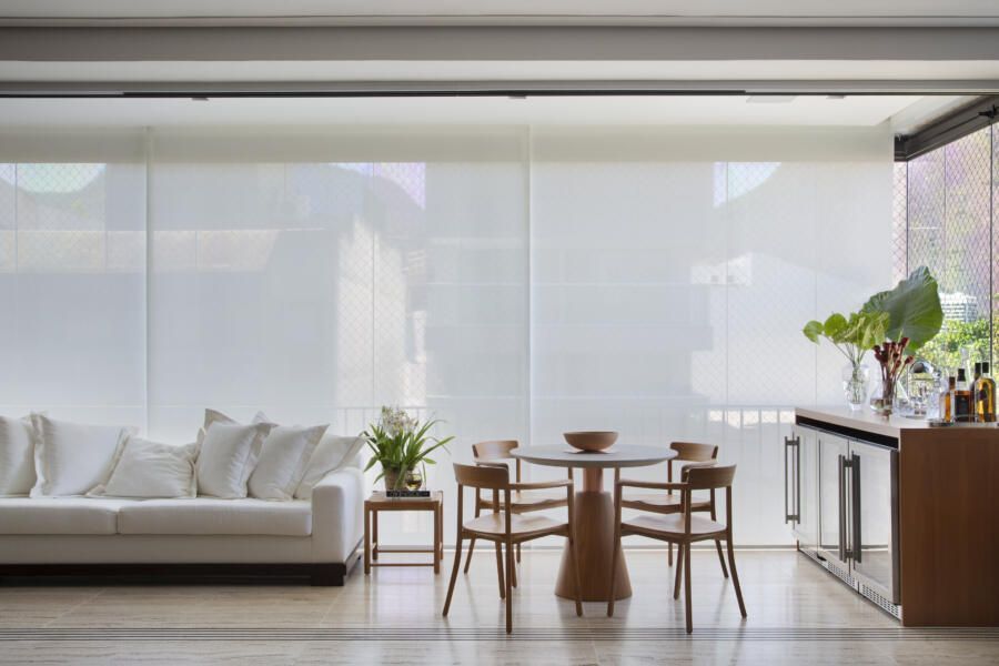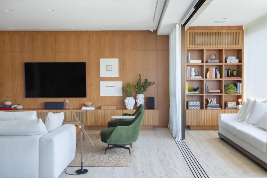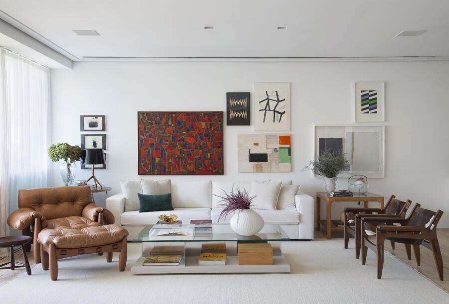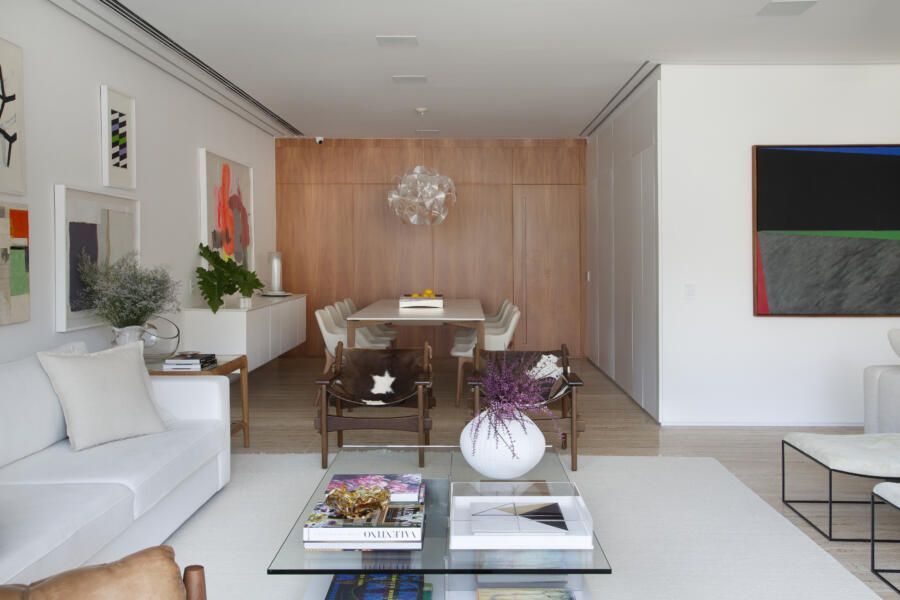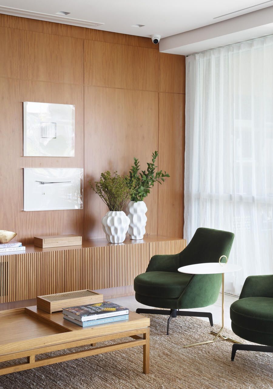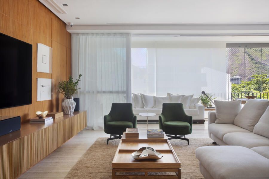 “Apostei em um jogo de texturas e cores mais sóbrias e elegantes que preenchem o living. Além disso, grande parte do mobiliário é assinado por designer renomados como como Sergio Rodrigues, Jader Almeida, Aristeu Pires, o que deixa tudo ainda mais especial e único.”