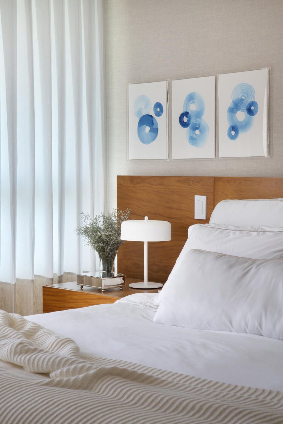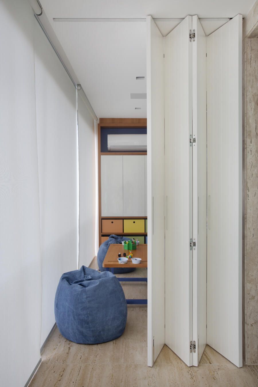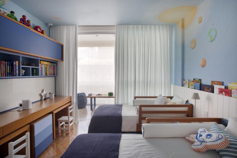 “Nos ambientes íntimos, o conforto segue sendo prioridade. Na suíte do casal, criei dois banheiros anexos que servem para ambos. Já no quarto das crianças, criei um espaço super aconchegante e lúdico com cores suaves e complementares, além de uma varanda que também é utilizada como brinquedoteca.”