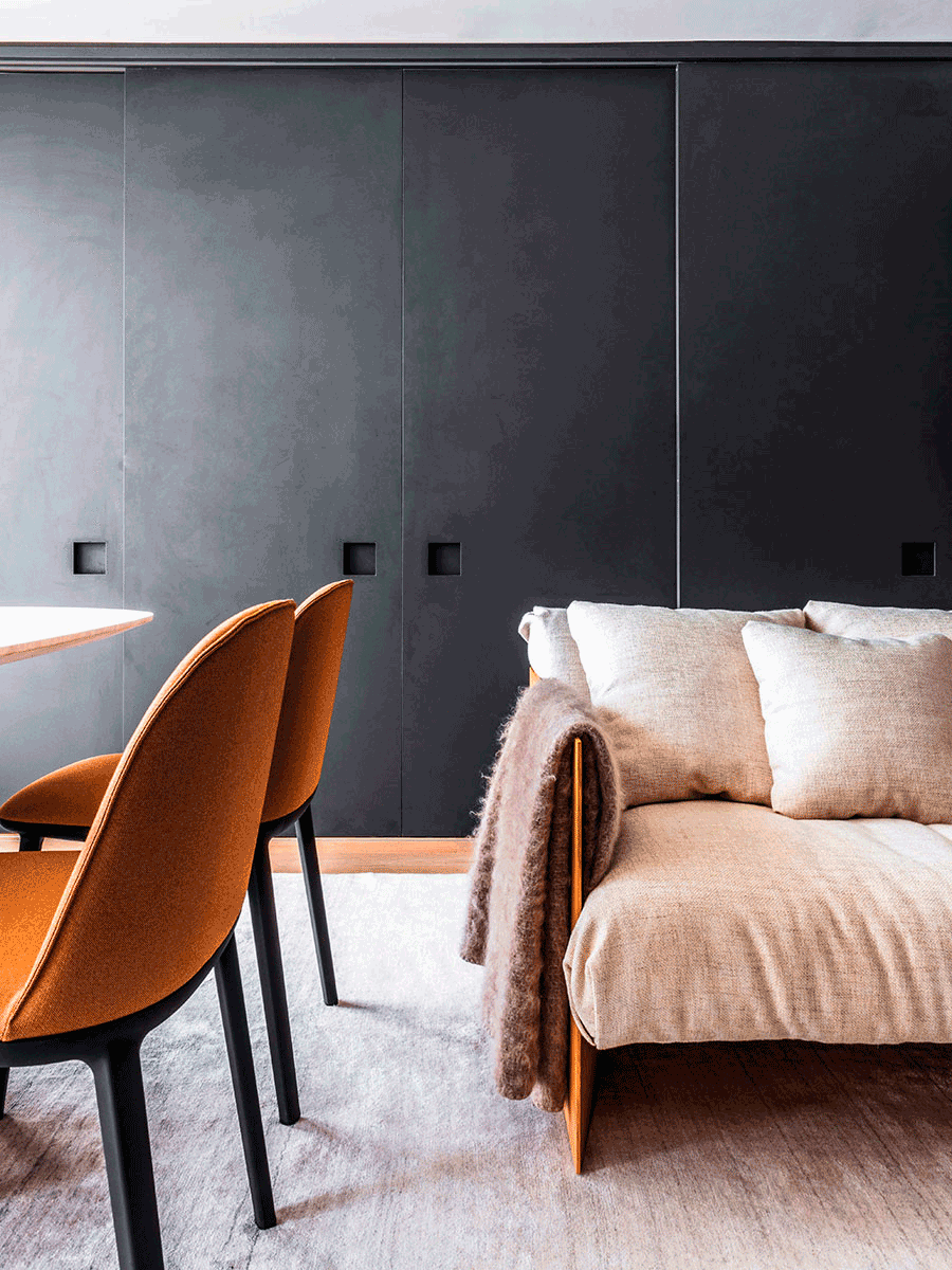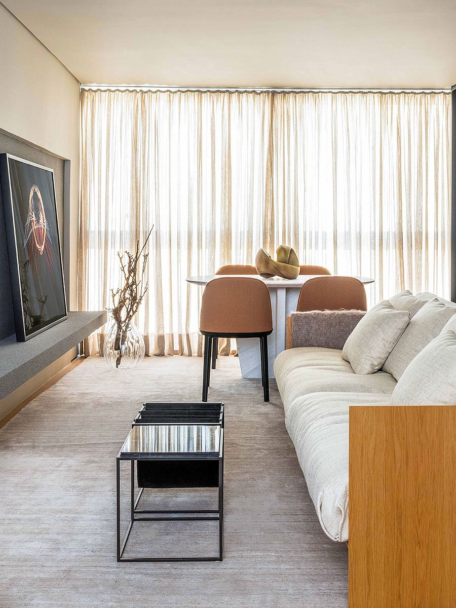 O imóvel é um ponto de apoio para o proprietário, um médico que mora sozinho e trabalha em uma cidade vizinha. Um de seus pedidos foi a integração dos ambientes com uma paleta que remetesse ao aconchego, com pouco mobiliário e atmosfera clean.