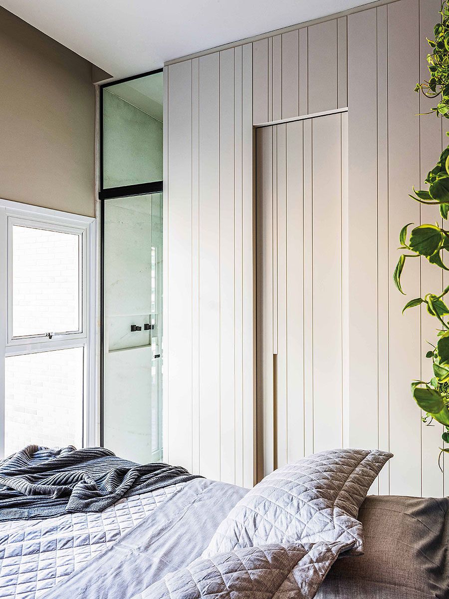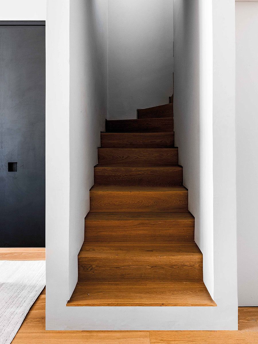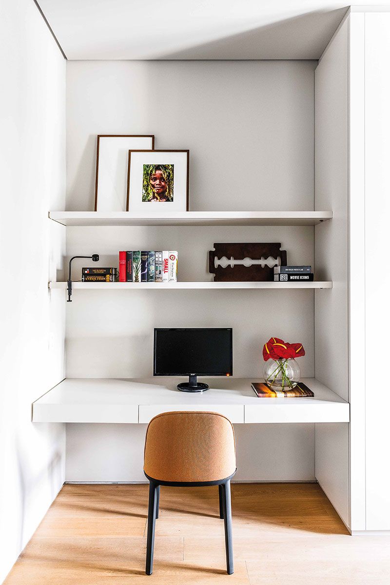 A pedido do cliente, no piso superior, estão acomodados o dormitório e um escritório. Uma das paredes do quarto é revestida com madeira criando um clima mais aconchegante.