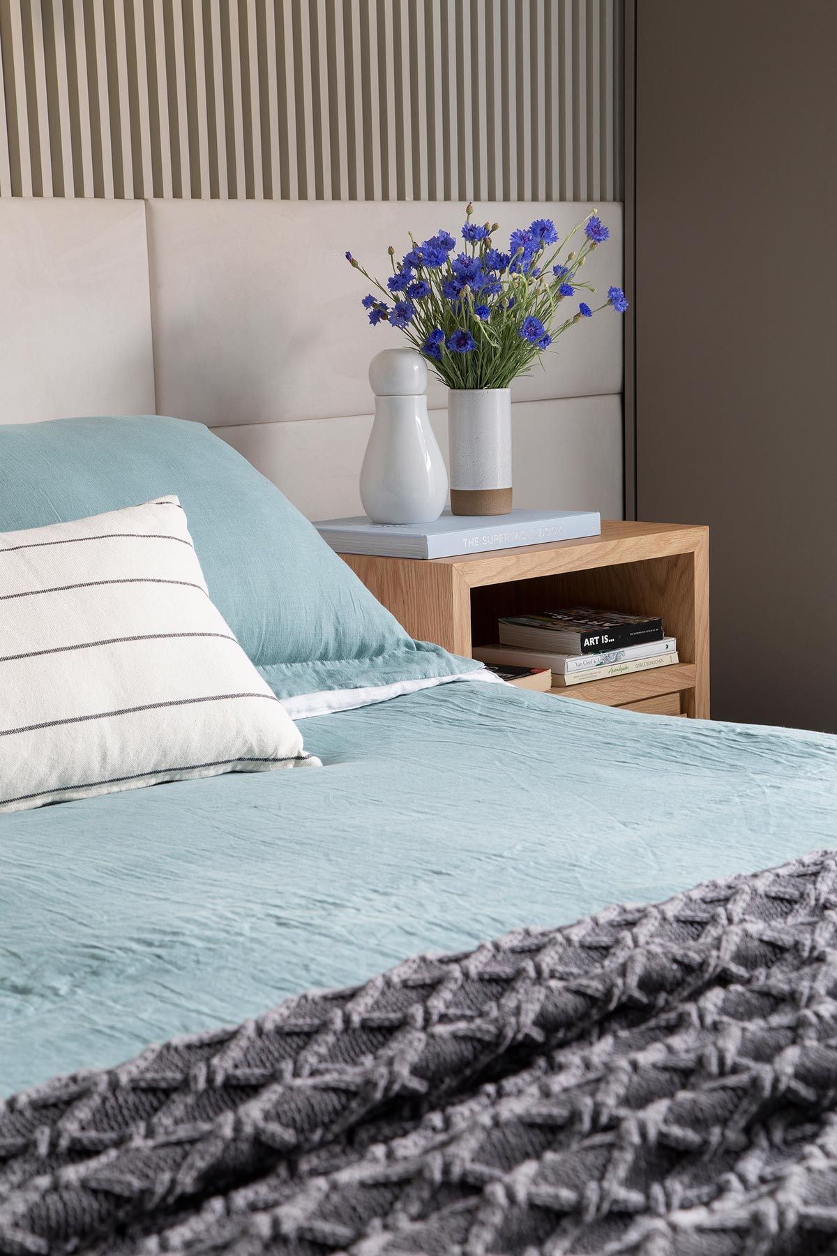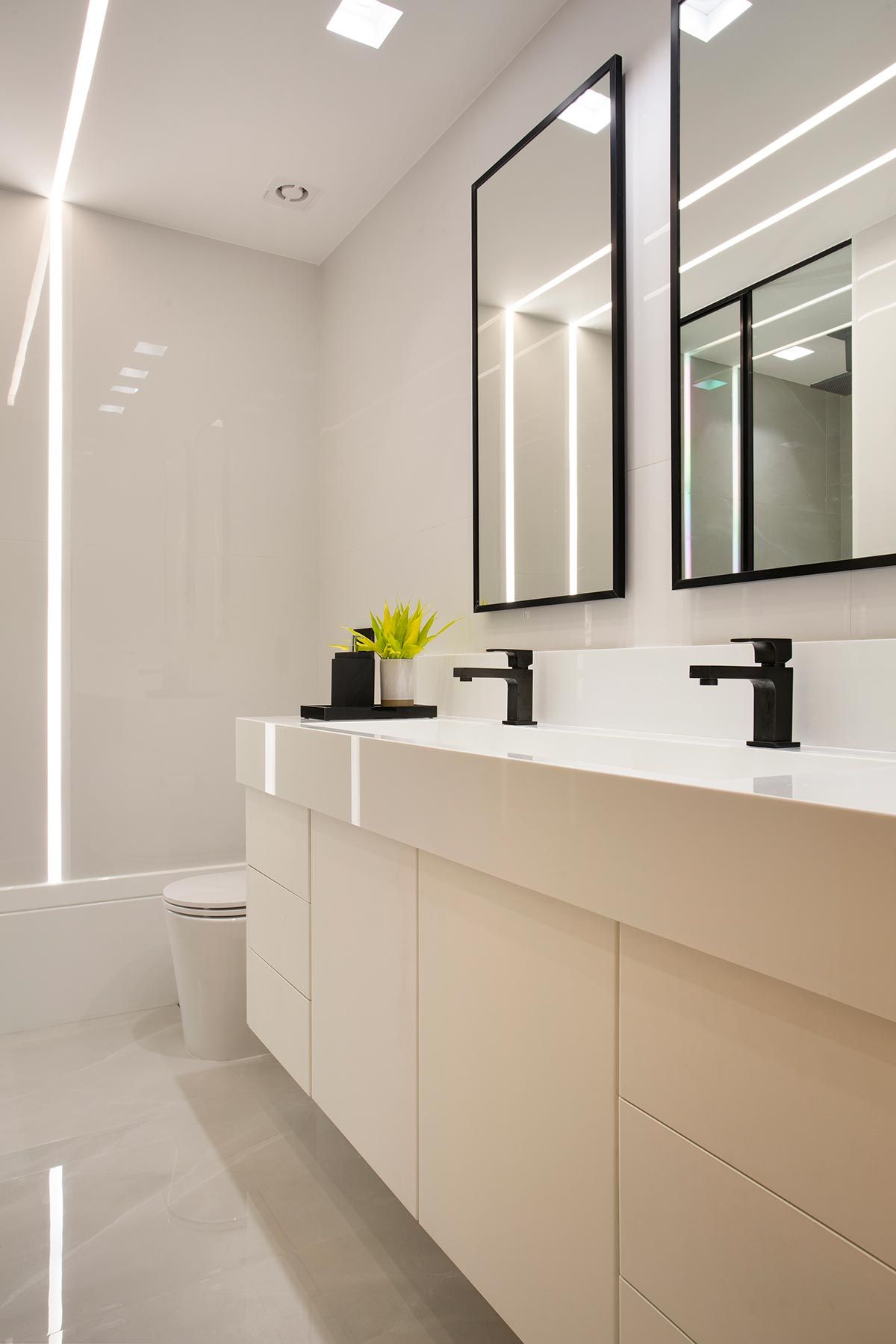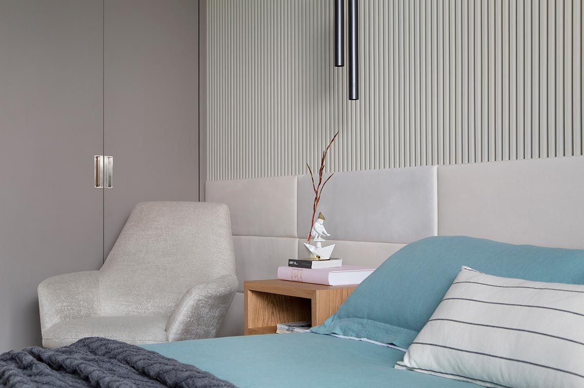 A suíte do casal ficou bem aconchegante no final das mudanças no layout, ficando com 25m². No banheiro da suíte predominam revestimentos brancos, com detalhes em preto nos metais e na moldura do espelho, com pia dupla. Por fim, os quartos das crianças foram dispostos como suítes canadenses e, juntos à brinquedoteca, serão finalizados em uma segunda parte do projeto.