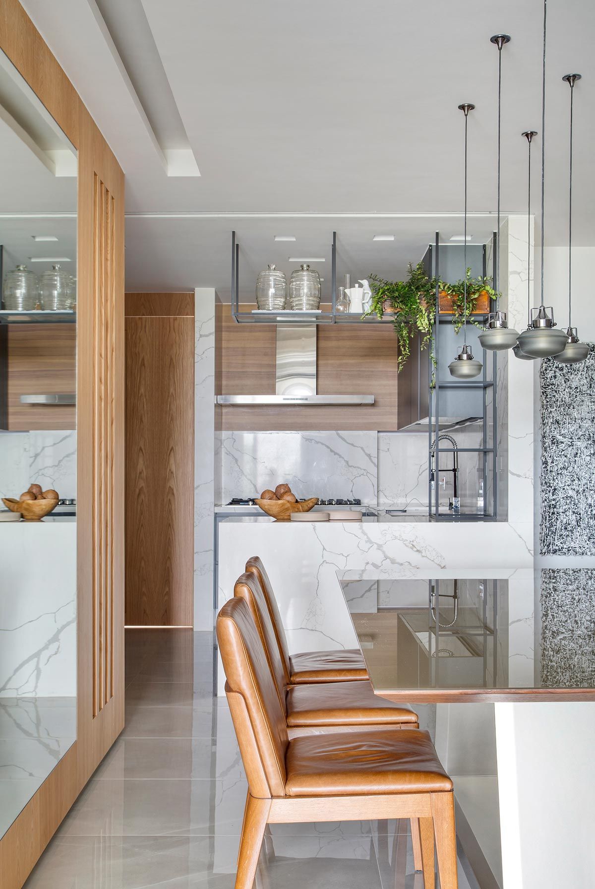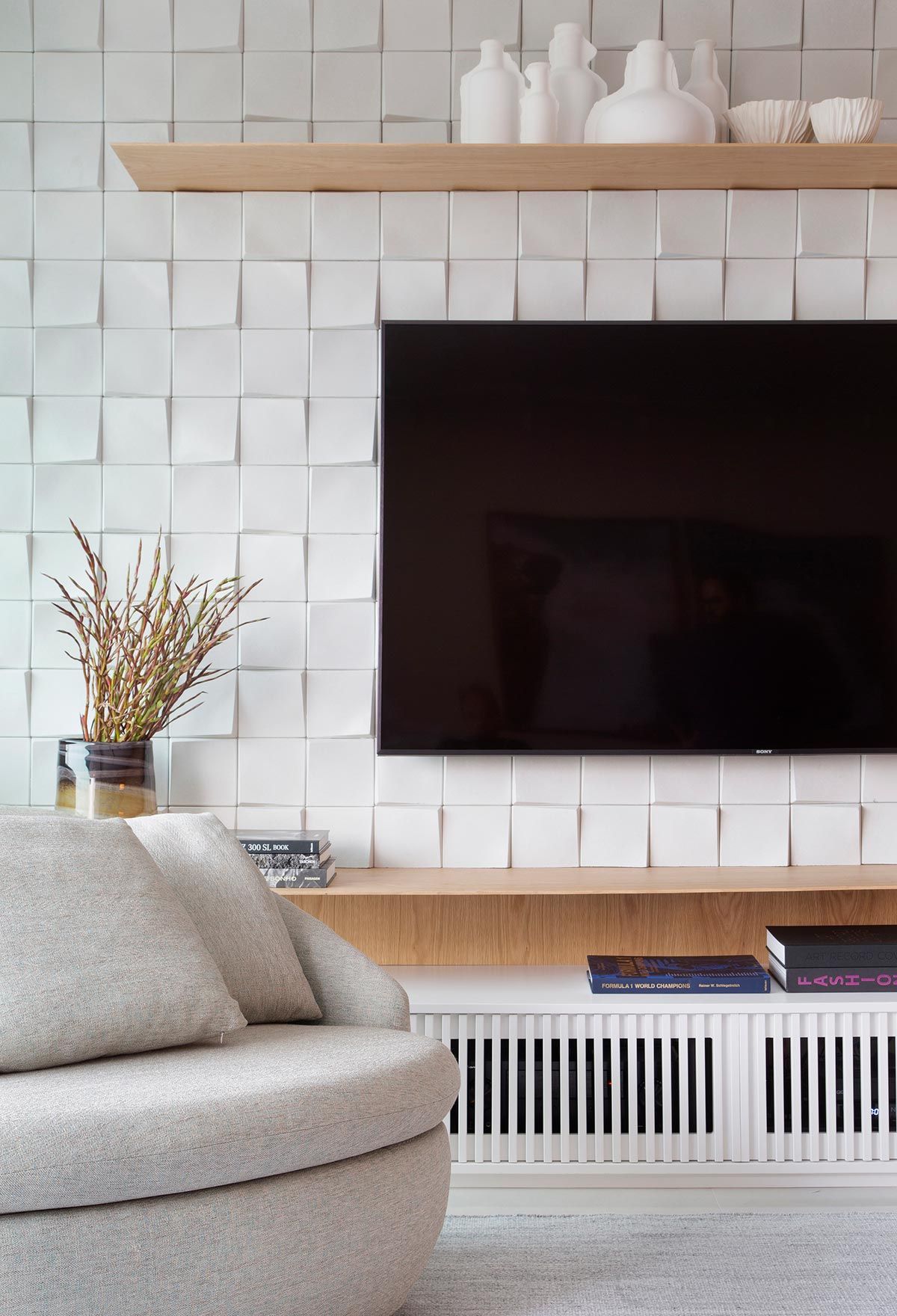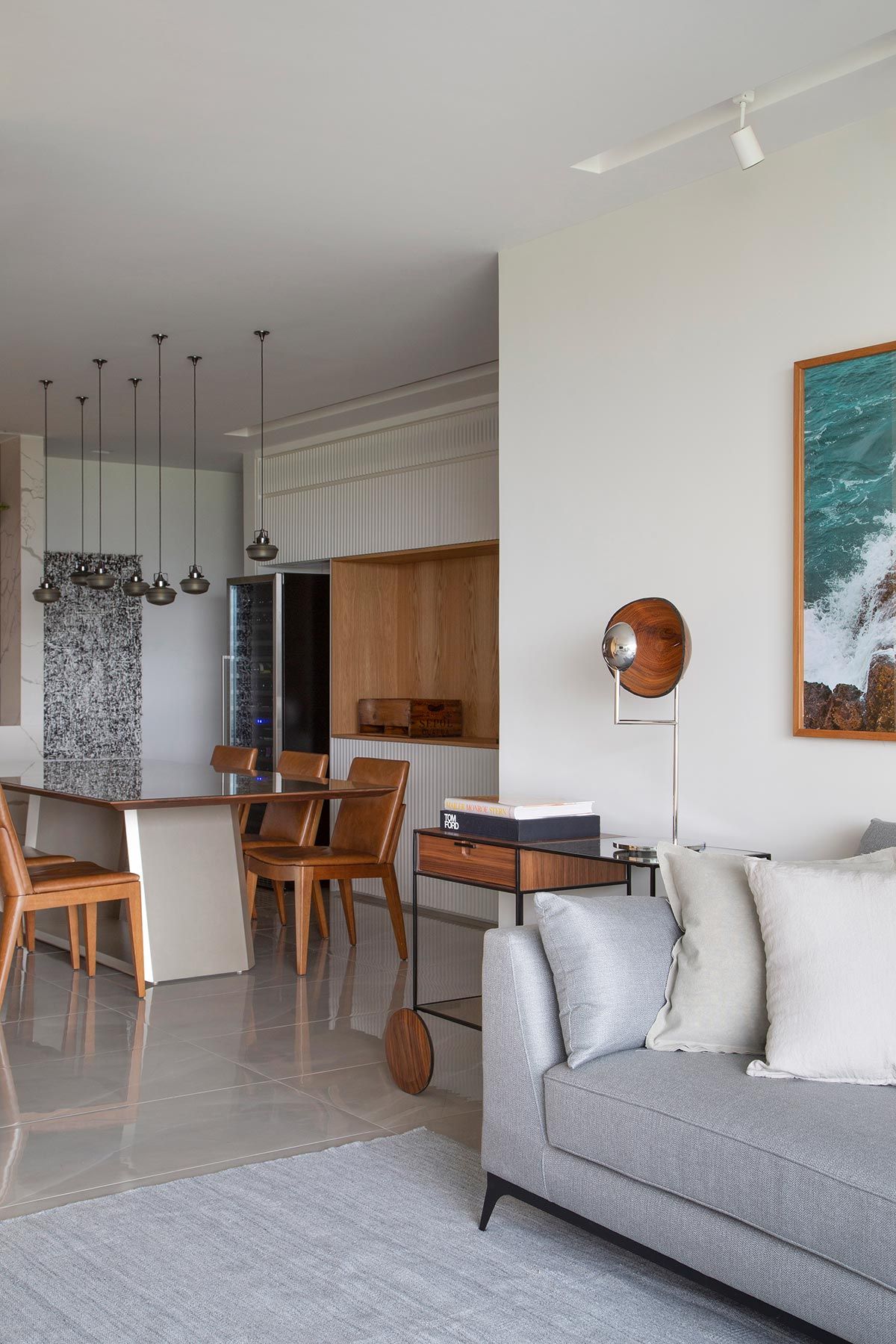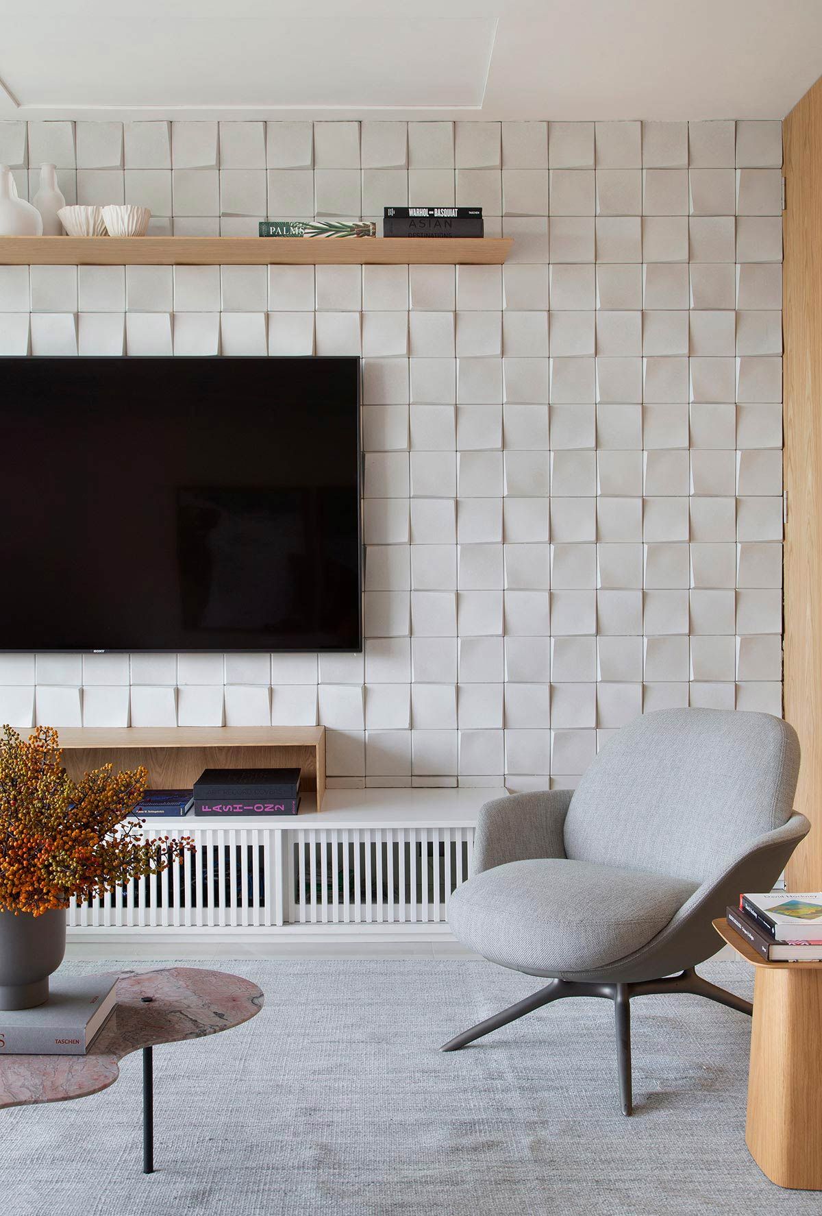 Banhada por luz natural e aberta para a varanda por portas de correr, a área da TV ganhou um confortável sofá chaise, e na parede oposta foi instalada a televisão e também um revestimento 3D. Móveis e objetos de design assinado pontuam a decoração, trazendo assinaturas como Claudia Moreira Salles, Jader Almeida e Ronan e Erwan Bouroullec. Na cozinha, a arquiteta apostou em uma bancada e frontispício em Dekton, com aparência de mármore branco com veios acinzentados, deixando ambiente mais iluminado.