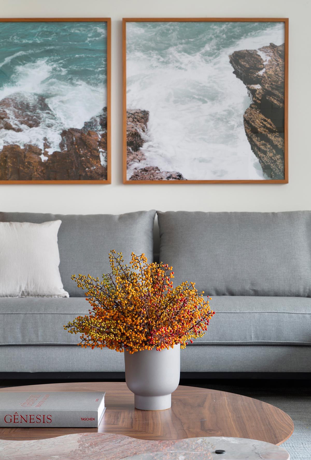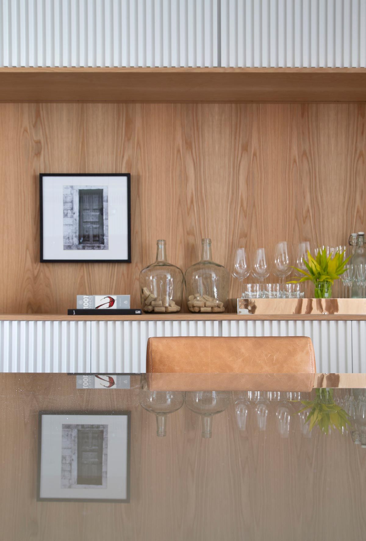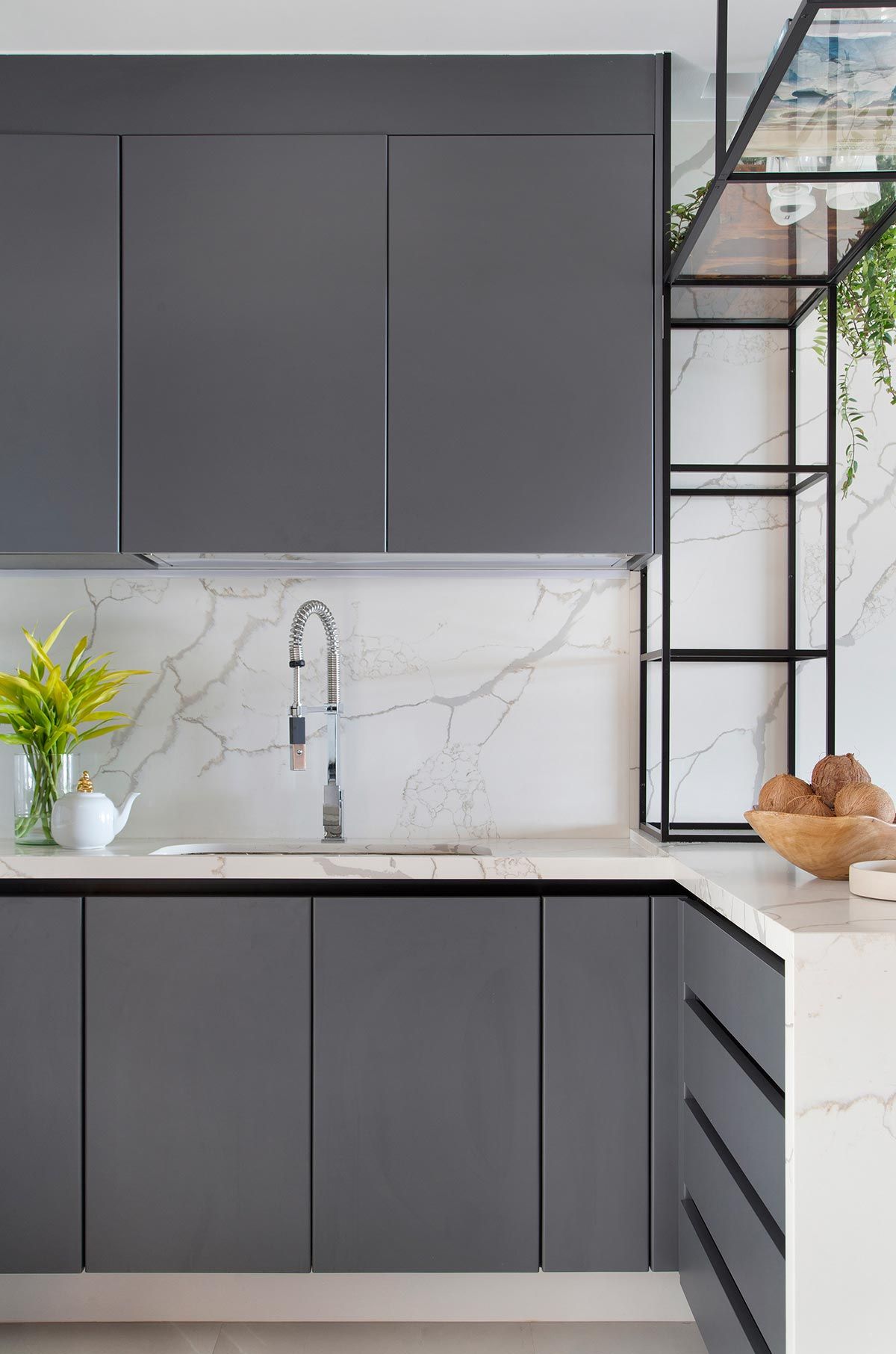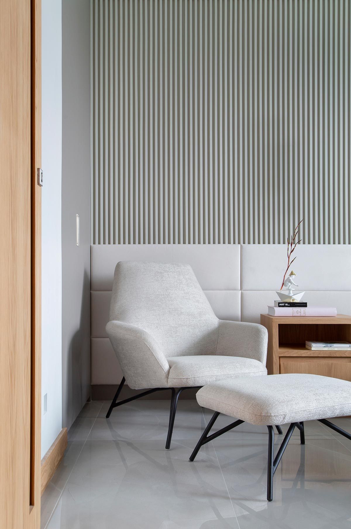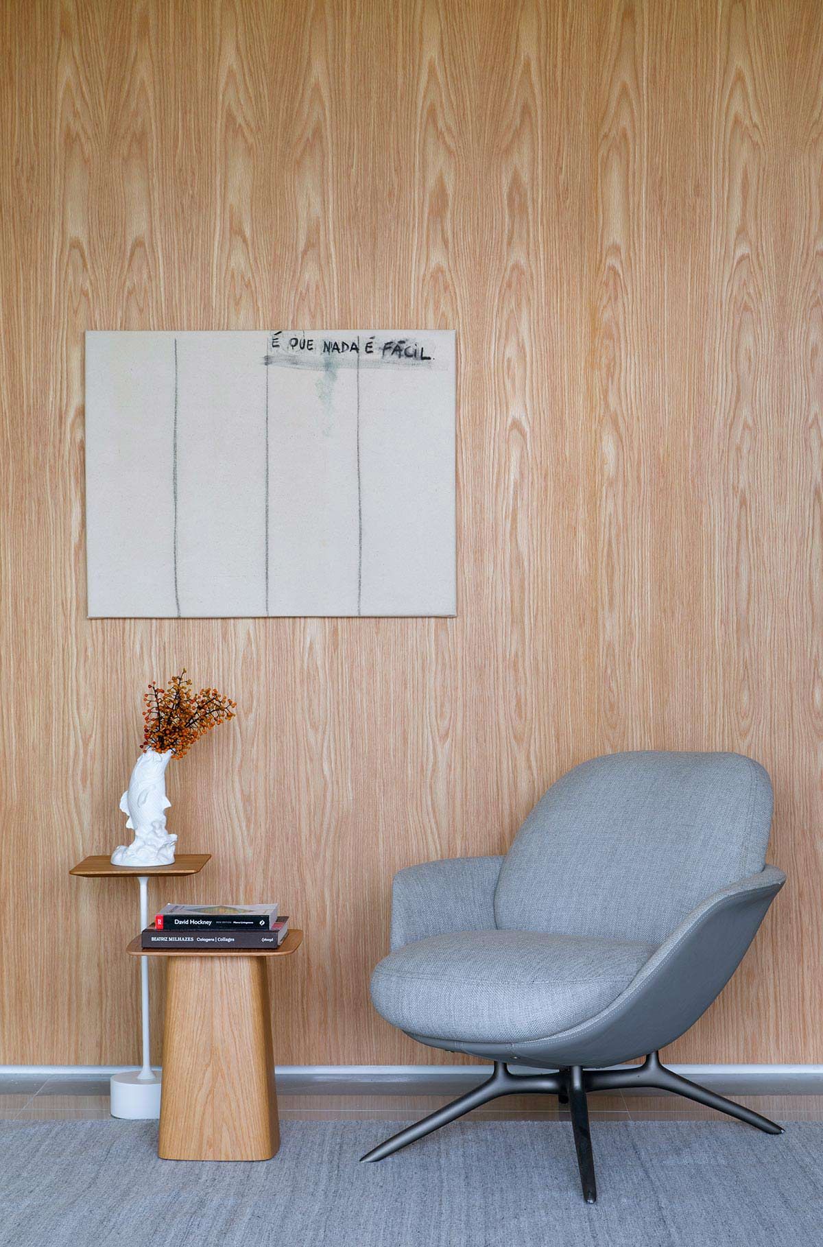 Banhada por luz natural e aberta para a varanda por portas de correr, a área da TV ganhou um confortável sofá chaise, e na parede oposta foi instalada a televisão e também um revestimento 3D. Móveis e objetos de design assinado pontuam a decoração, trazendo assinaturas como Claudia Moreira Salles, Jader Almeida e Ronan e Erwan Bouroullec. Na cozinha, a arquiteta apostou em uma bancada e frontispício em Dekton, com aparência de mármore branco com veios acinzentados, deixando ambiente mais iluminado.