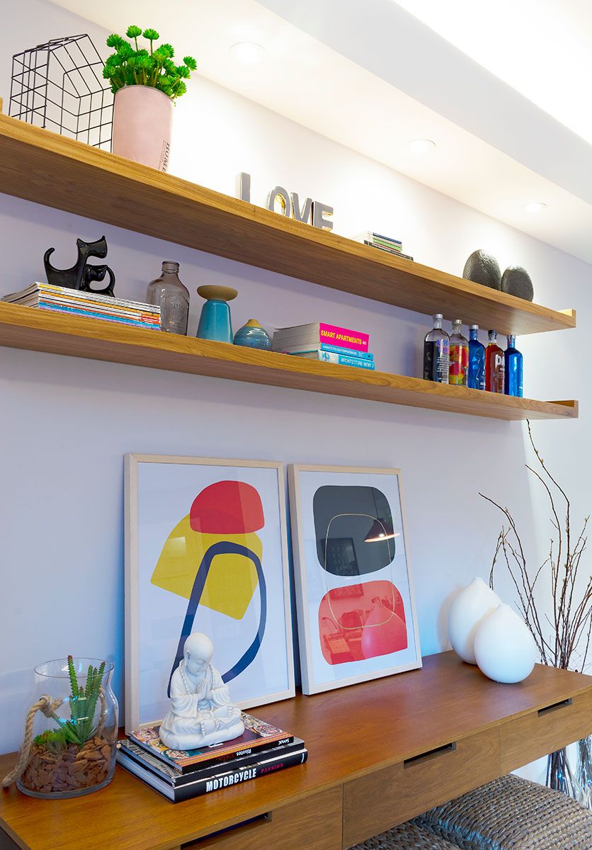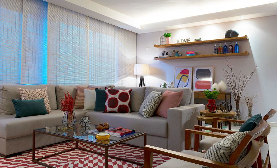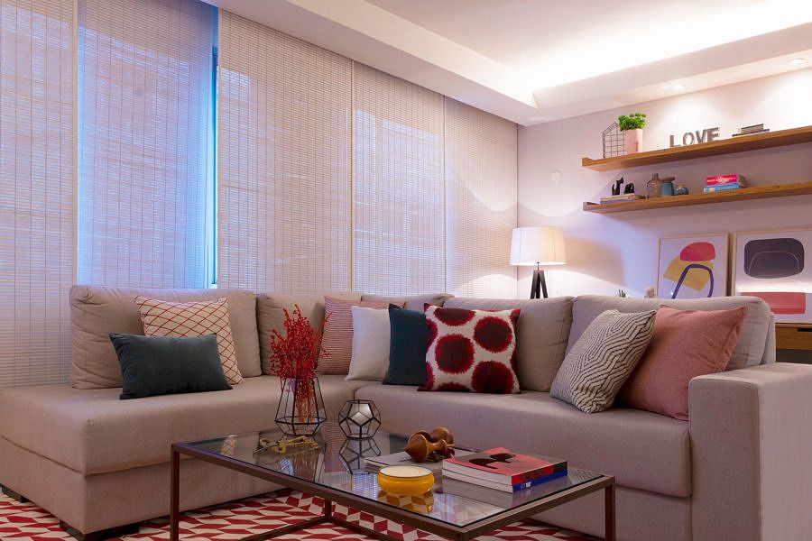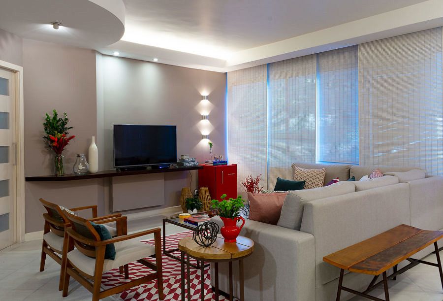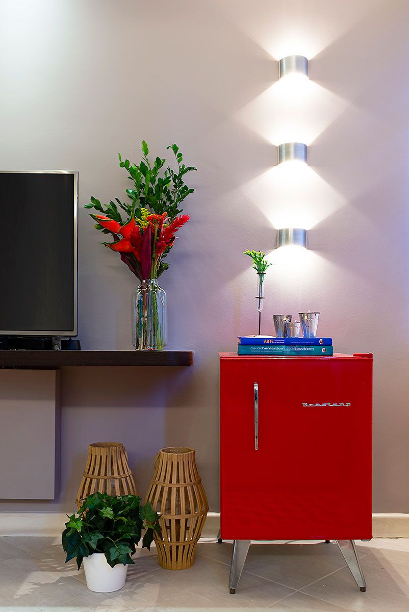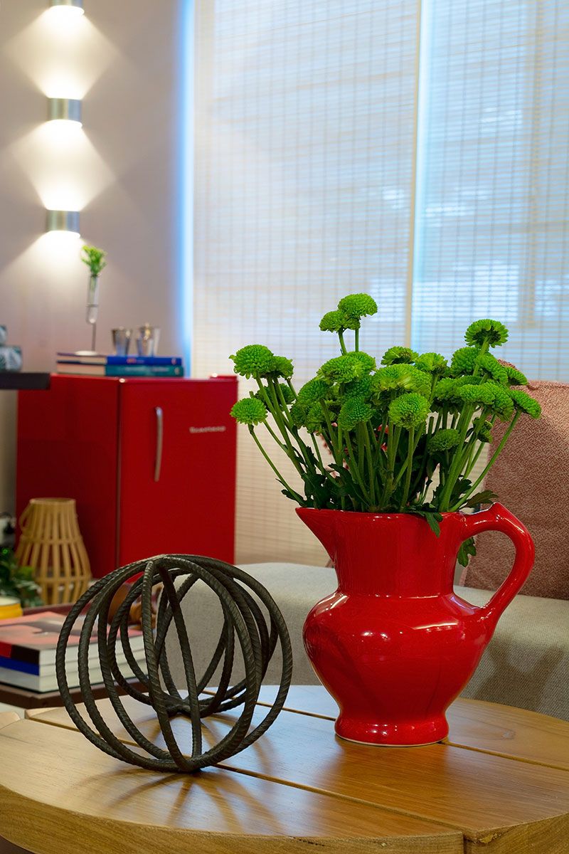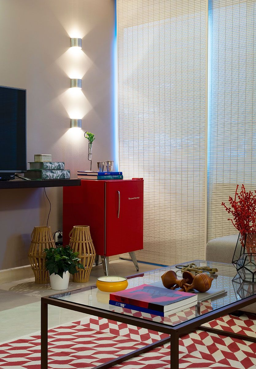 Foram trabalhadas duas tonalidades mais fechadas nas paredes, para criar profundidade e deixar o ambiente mais aconchegante. As cores foram inseridas nos objetos e o vermelho foi escolhido para quebrar a monotonia da base neutra do mobiliário.