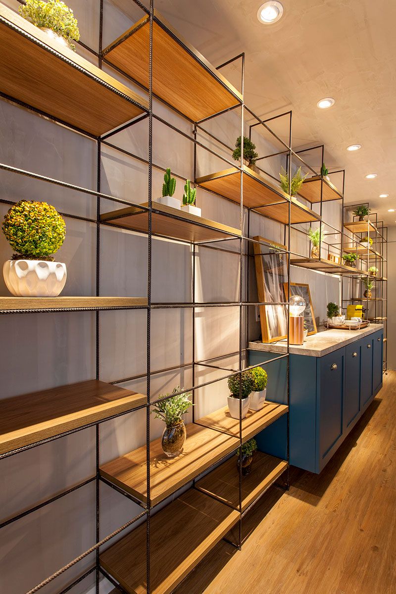 Para quem espera ser atendido, ou aguarda a sua reunião, um Café foi pensado para abrigar um bate papo informal ou até mesmo os tradicionais happy hour da agência – sem perder o foco no atendimento aos seus clientes. A estante de vergalhões da recepção avança por esse espaço, só que ao invés das cores laqueadas, as prateleiras foram revestidas com lâmina natural de madeira clara para harmonizar com a bancada de mármore Perlato que apoia o serviço do café, como xícaras e pires organizados na bandeja Open do designer brasileiro Jader Almeida.