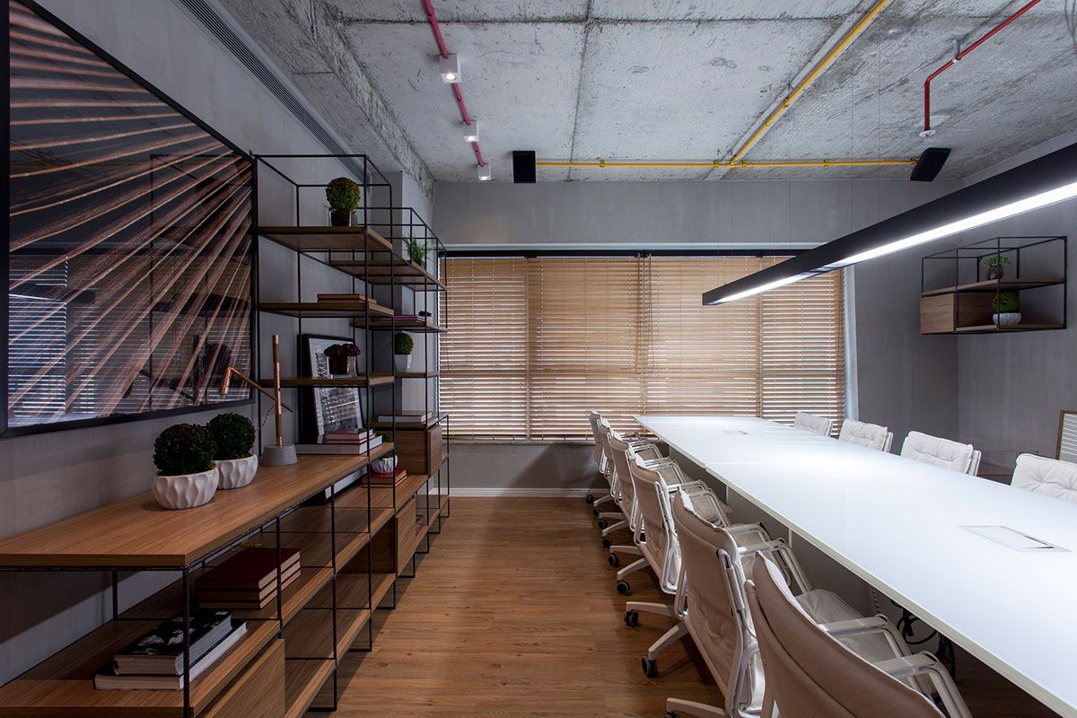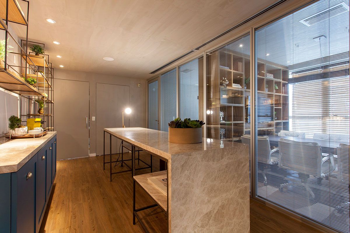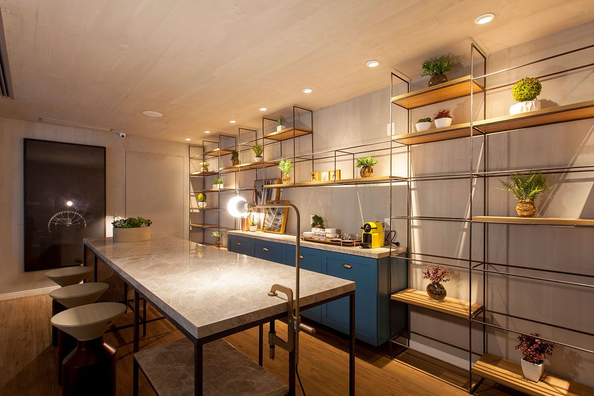 A estrutura metálica volta a aparecer em linhas retas na bancada em ilha, só que desta vez, em metalon com seção quadrada. Os bancos Milk são do arquiteto Guilherme Torres. Até na escolha da fotografia o conceito Minimalista Brutal se fez presente. Fotografias pretas e brancas com formas geométricas reduzidas são clássicas da estética em questão, e o fotógrafo Wagner Paiva conseguiu retratar esse estilo na grande obra que estampa a parede de acesso a Sala de Reunião Principal. Ainda no enfoque da arte, o banco Puxado de Zanini de Zanine, feito em Ipê Tabaco e Jacarandá é valorizado pela luminária italiana Tab, dos designers ingleses Edward Barber e Jay Osgerby, para a marca FLOS.
