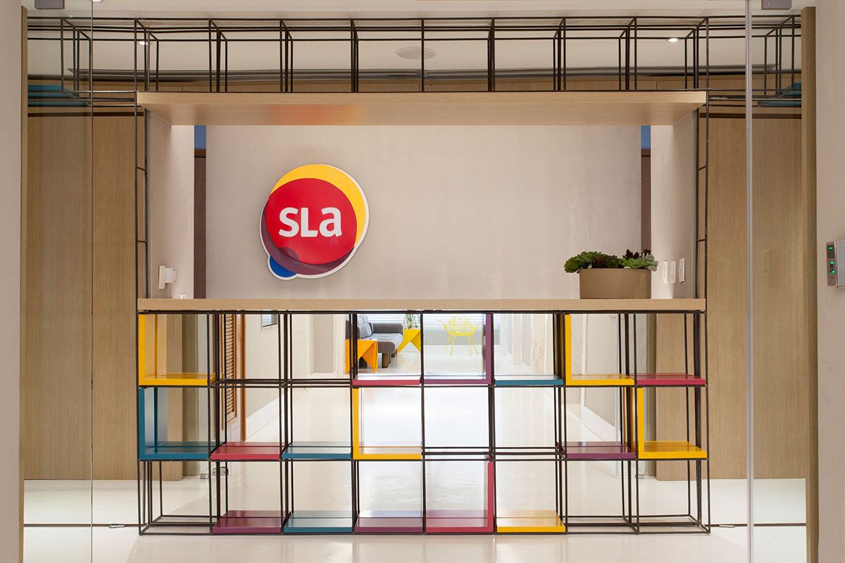 Logo na Recepção, a proposta brutalista é estampada na estante metálica de vergalhões enferrujados de obra, que somadas com as prateleiras e os módulos laqueados, com as cores da marca da Agência de Publicidade, dão identidade para quem chega. O piso com pintura epóxi ressalta o minimalismo proposto no conceito.