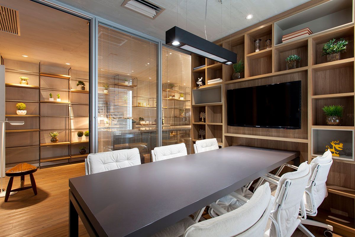 Já para as reuniões menores, foram pensadas duas salas com divisórias em vidro duplo com persiana horizontal no meio e um mobiliário mais simples e objetivo. As cores sóbrias foram valorizadas. Uma das premissas do projeto foi a integração total da equipe. Na sede antiga, as salas compartimentadas dificultavam que o processo de criação e produção fluísse melhor. Era necessário que as decisões fossem discutidas com maior agilidade, e as soluções compartilhadas de forma objetiva entre os envolvidos, e para isso dois grandes Open Spaces foram criados.