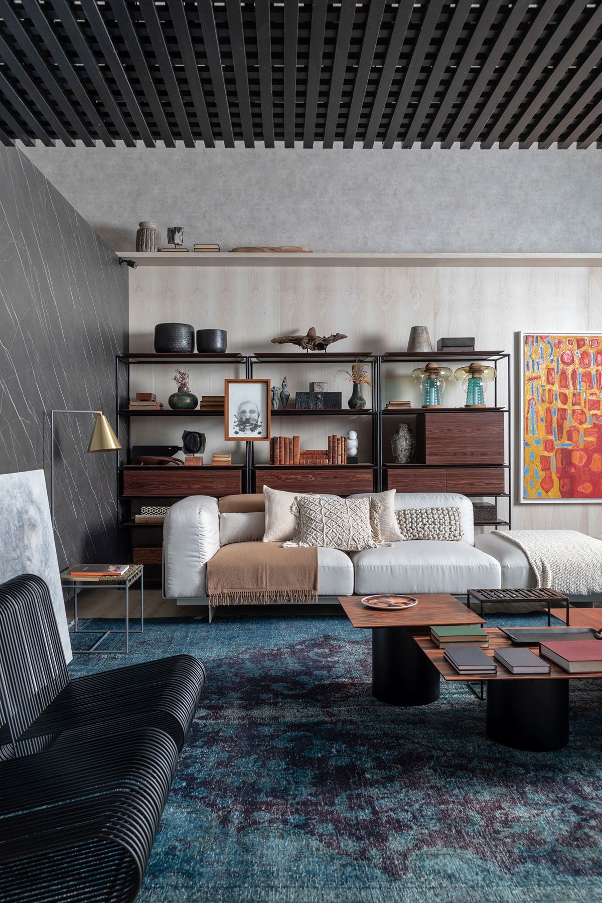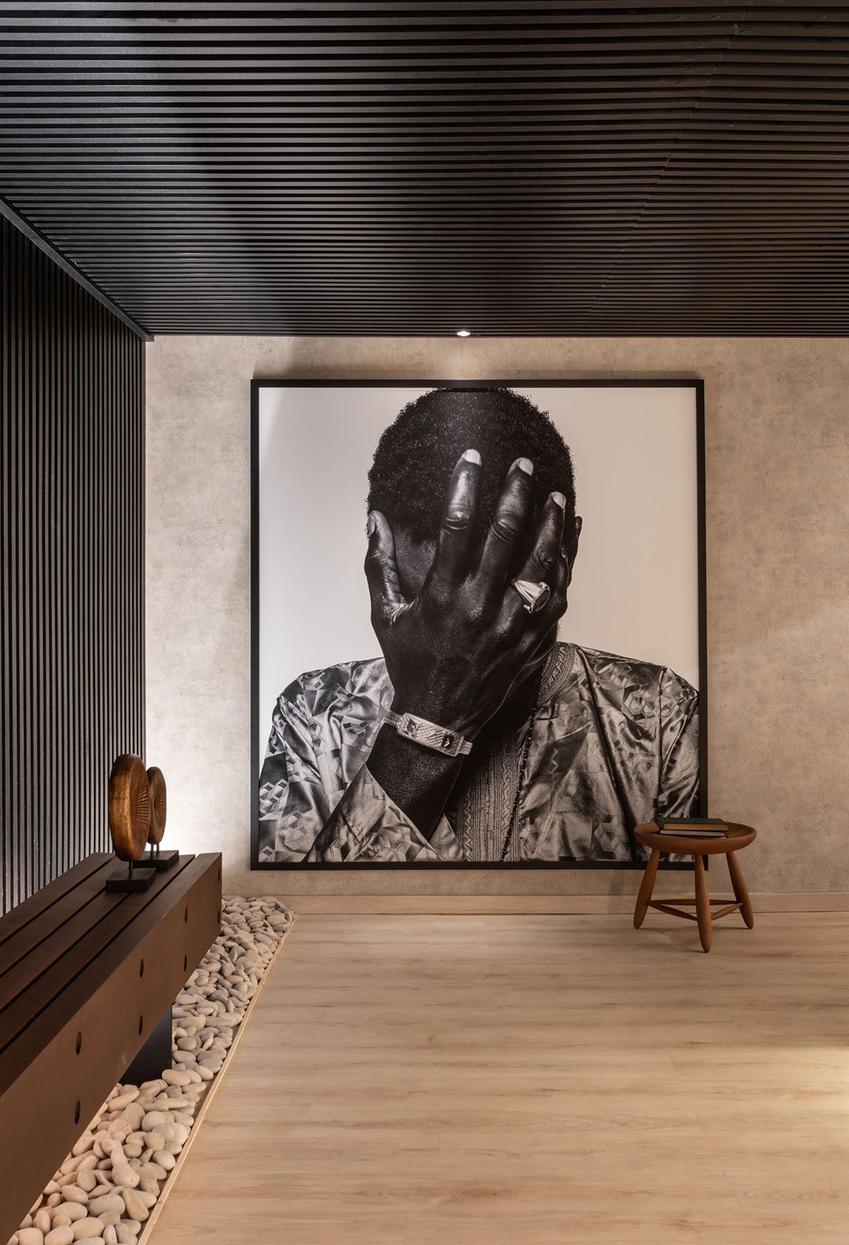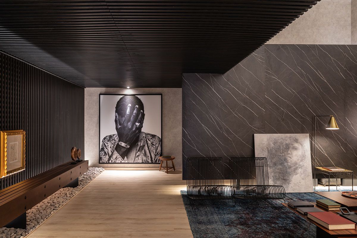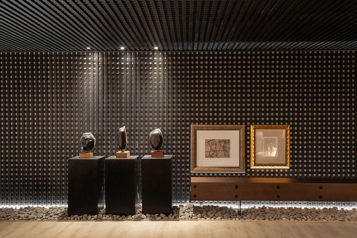 Com o intuito de trazer a história do prédio tombado eles mantiveram o teto original. A paleta de cores em tons terrosos ganha um ar intimista com o uso do preto, presente na treliça de grandes proporções, alocada logo na entrada. Além disso, alguns toques de cores fortes completam o layout e aparecem no verde petróleo do tapete e na obra de Siron Franco.