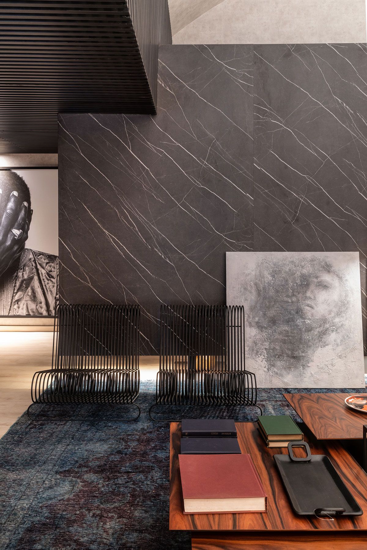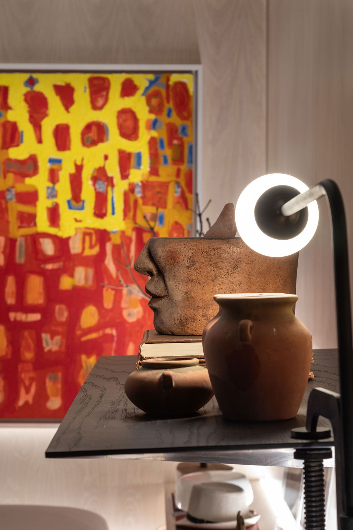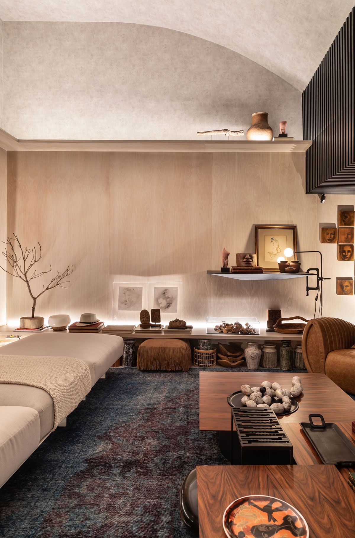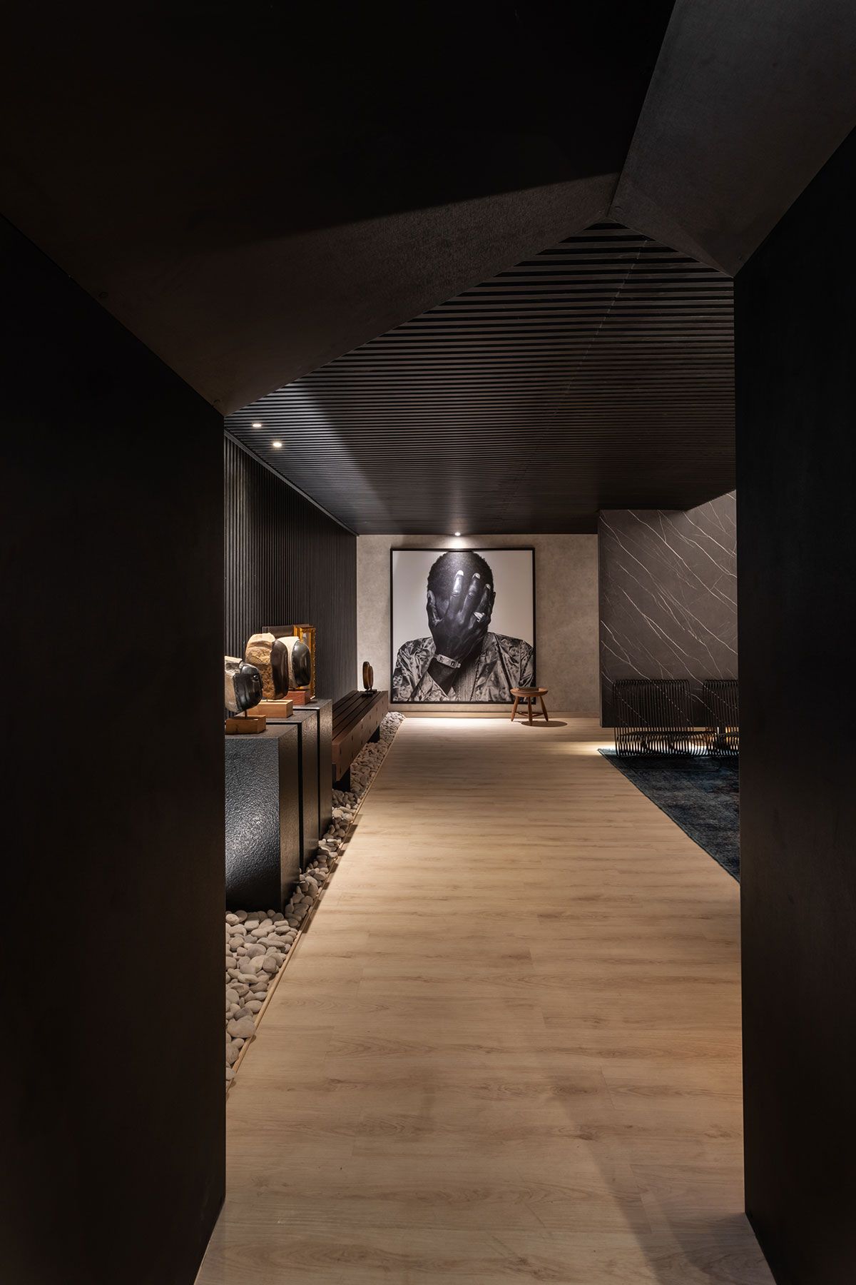 Com o intuito de trazer a história do prédio tombado eles mantiveram o teto original. A paleta de cores em tons terrosos ganha um ar intimista com o uso do preto, presente na treliça de grandes proporções, alocada logo na entrada. Além disso, alguns toques de cores fortes completam o layout e aparecem no verde petróleo do tapete e na obra de Siron Franco.