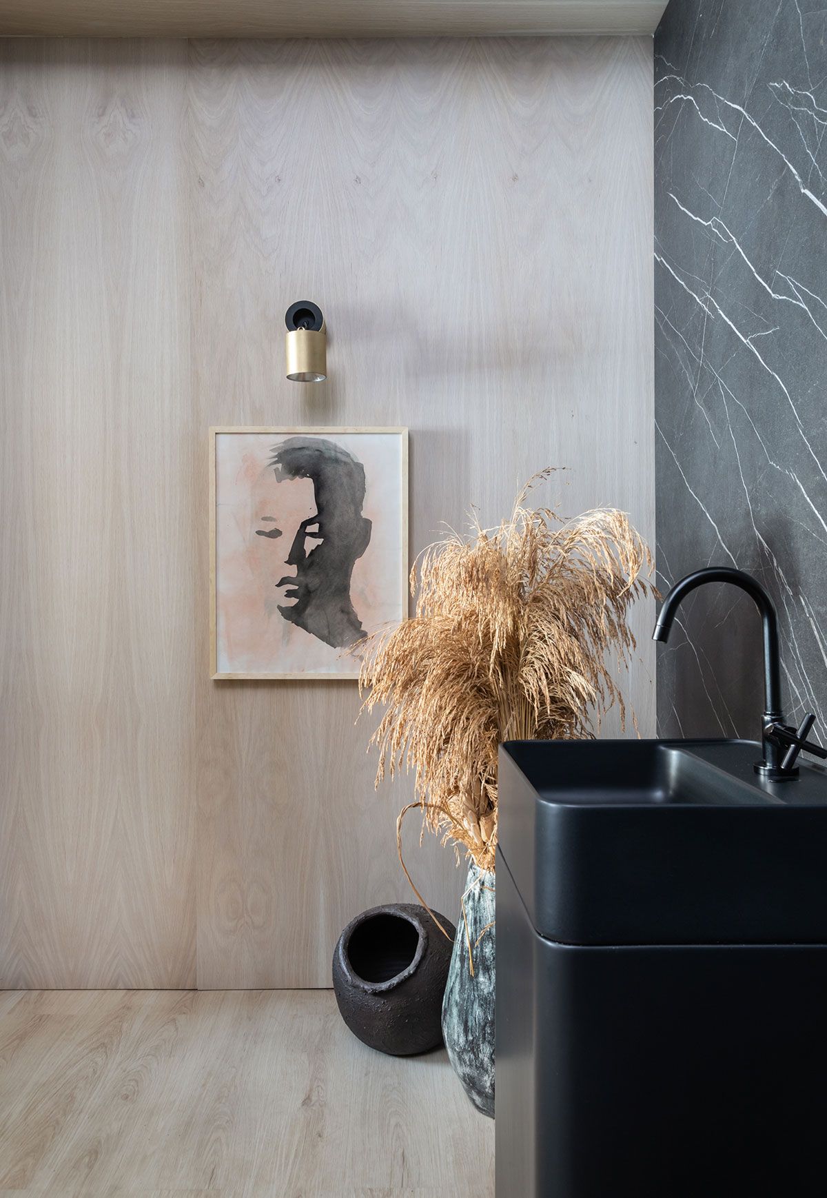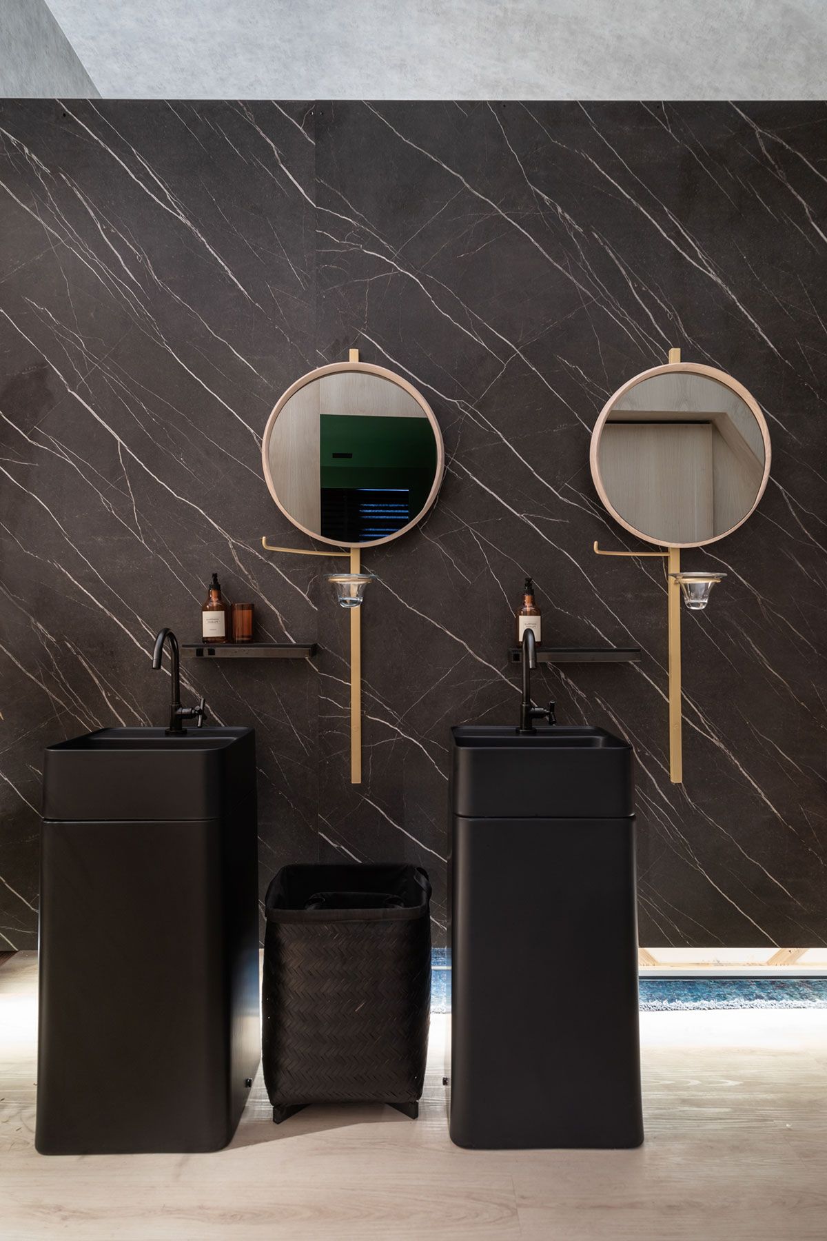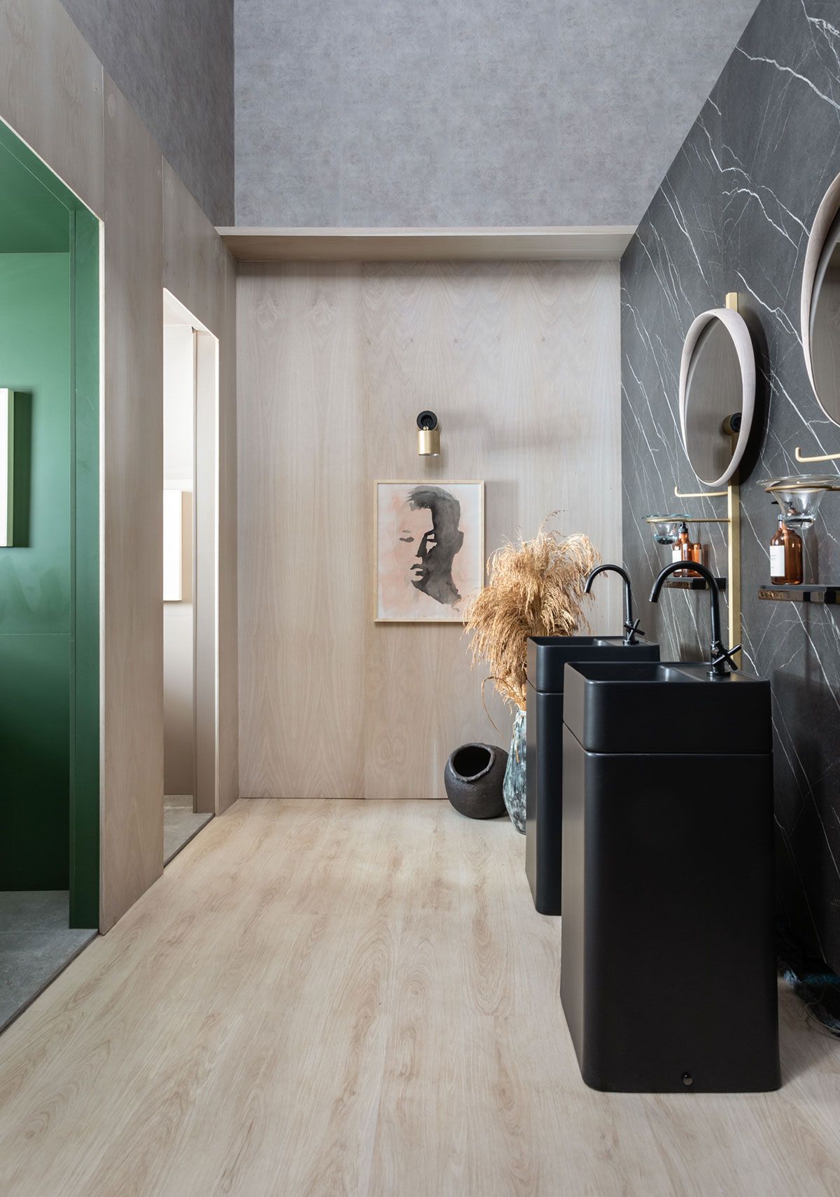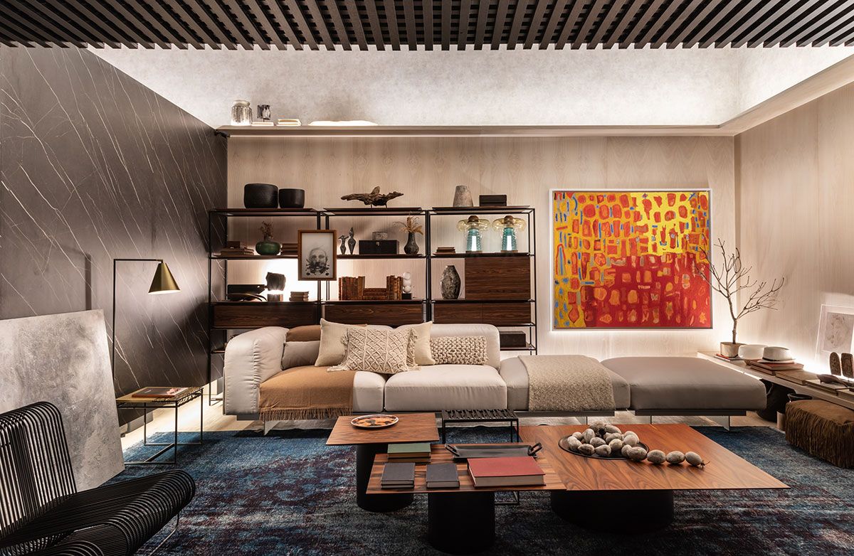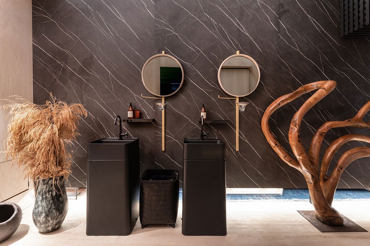 O ambiente assinado pelo Studio Alex Bonilha para a CasaCor SP 2019 é o Espaço Ser. Um pórtico geométrico serve como entrada para o projeto de 60m², que engloba sala de estar e um banheiro com três cabines, onde os profissionais criaram uma divisória suspensa por tirantes de aço, que separa os dois espaços de maneira moderna.